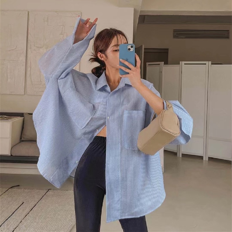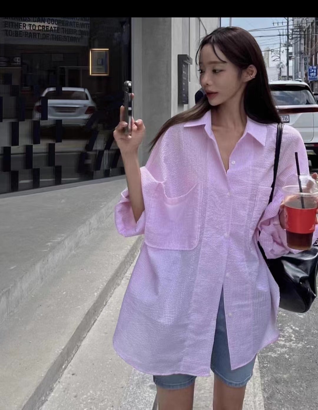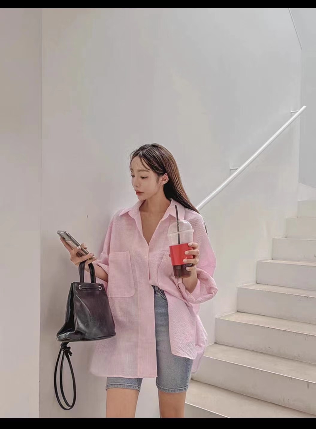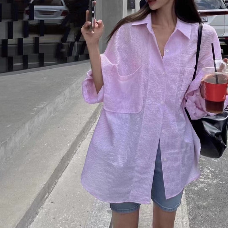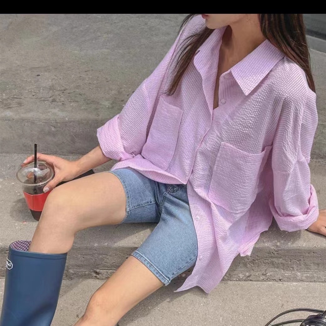 세로 줄무늬 여성 셔츠 한국 레트로 폴로 칼라 루즈핏 대 에디션 느긋한 바람 주머니 품격 다용도 태양 보호 셔츠 맨위