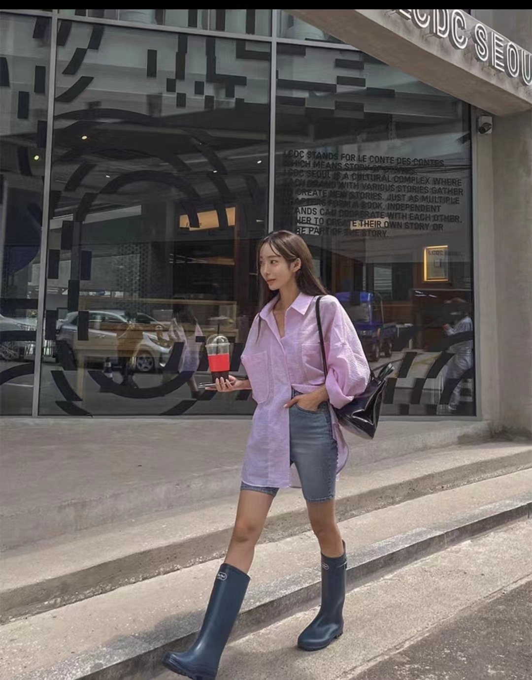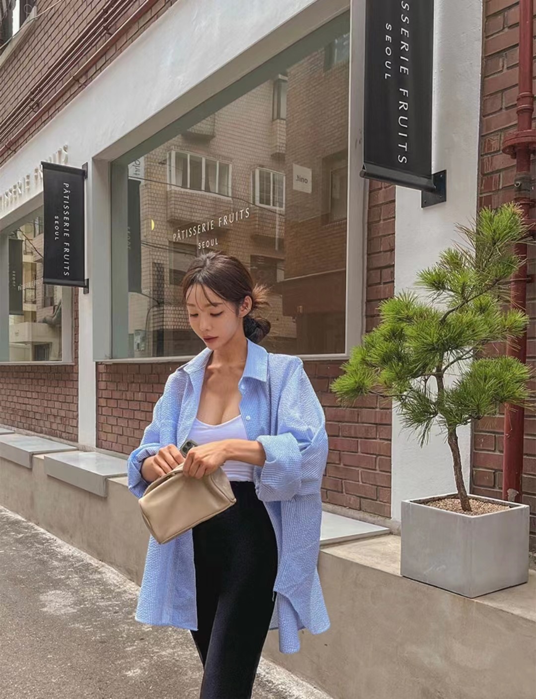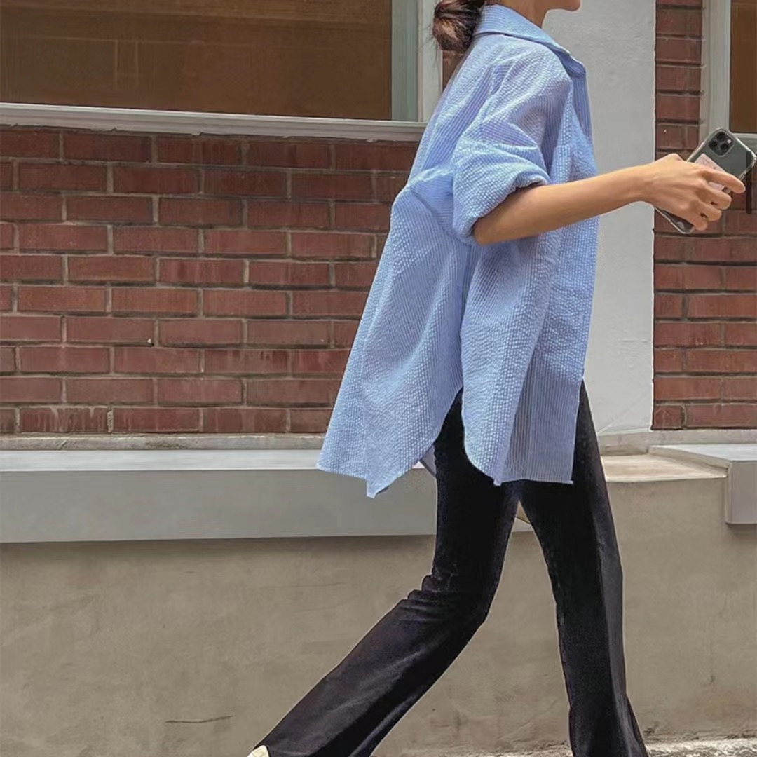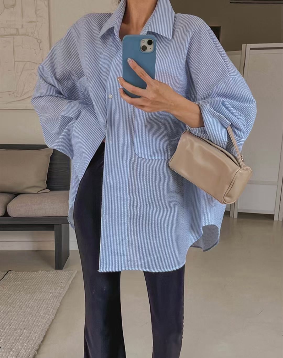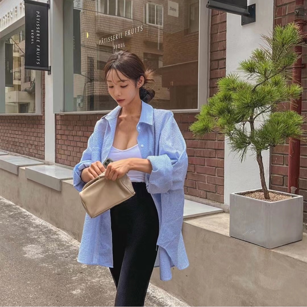 세로 줄무늬 여성 셔츠 한국 레트로 폴로 칼라 루즈핏 대 에디션 느긋한 바람 주머니 품격 다용도 태양 보호 셔츠 맨위