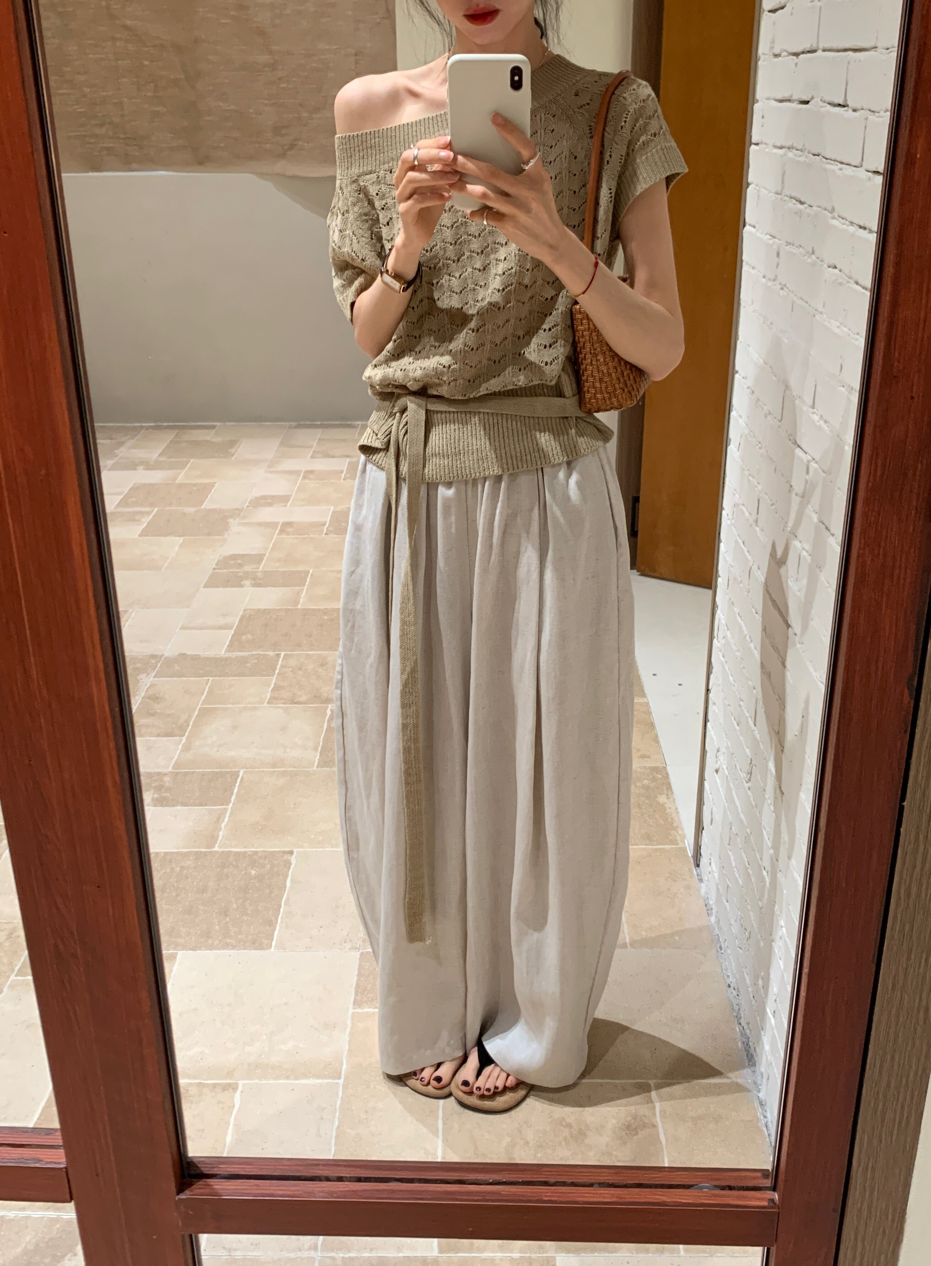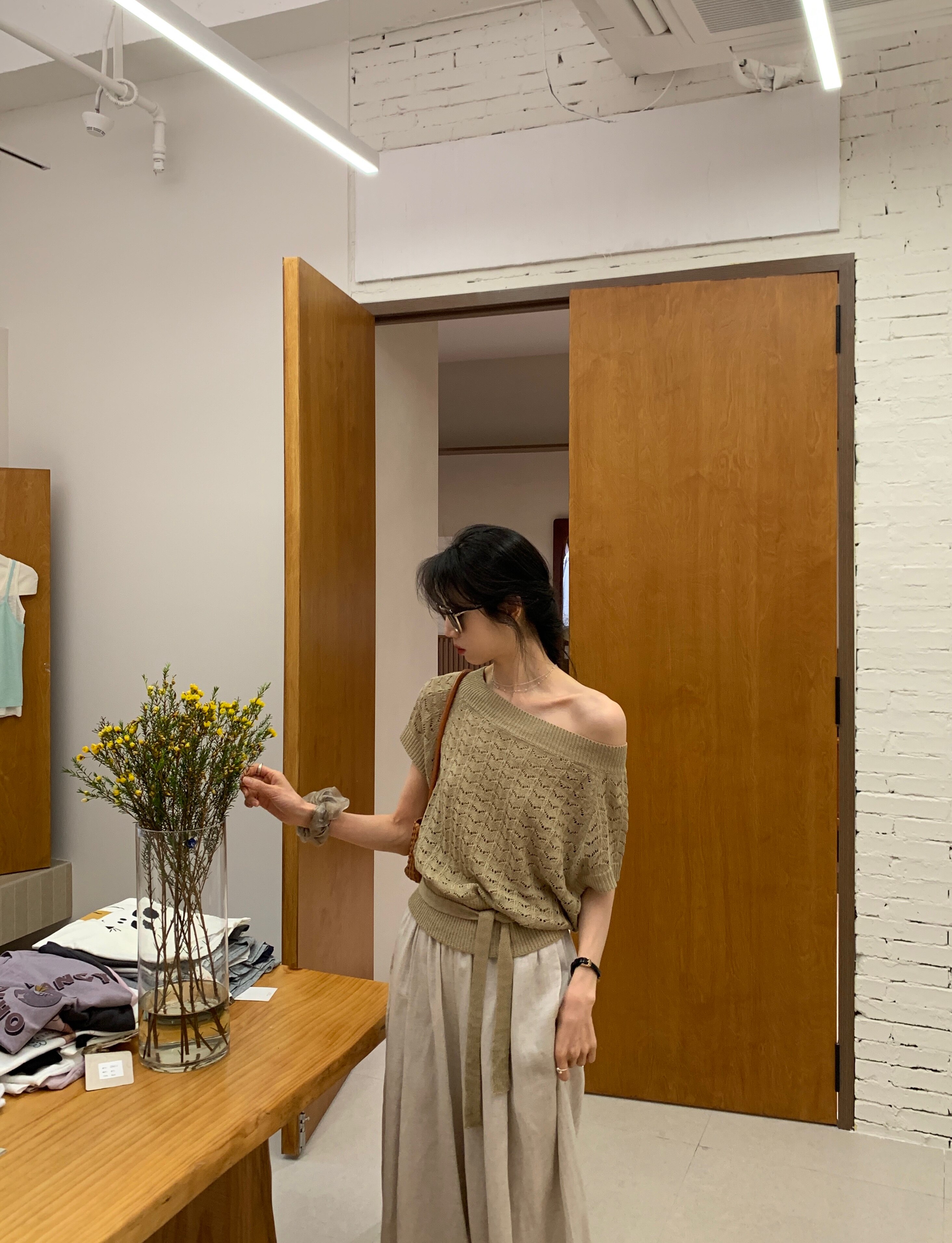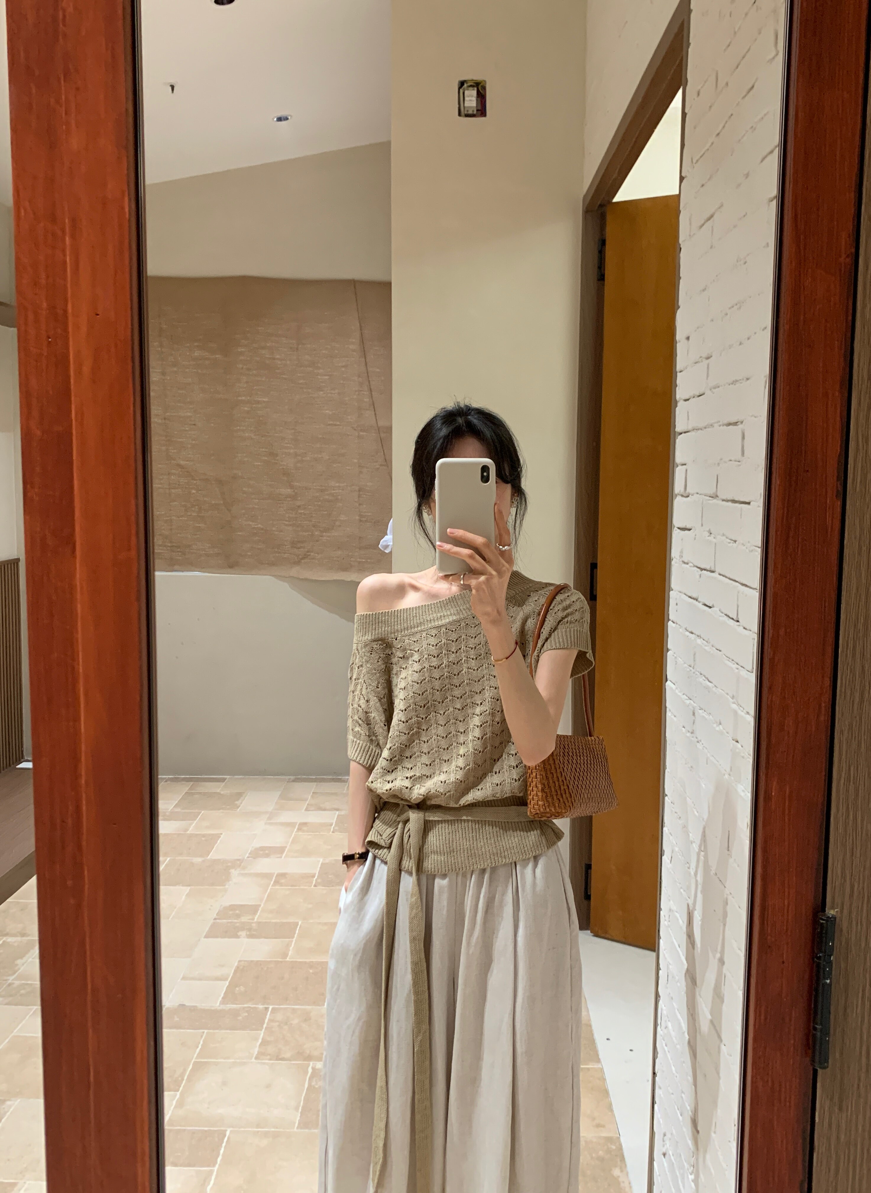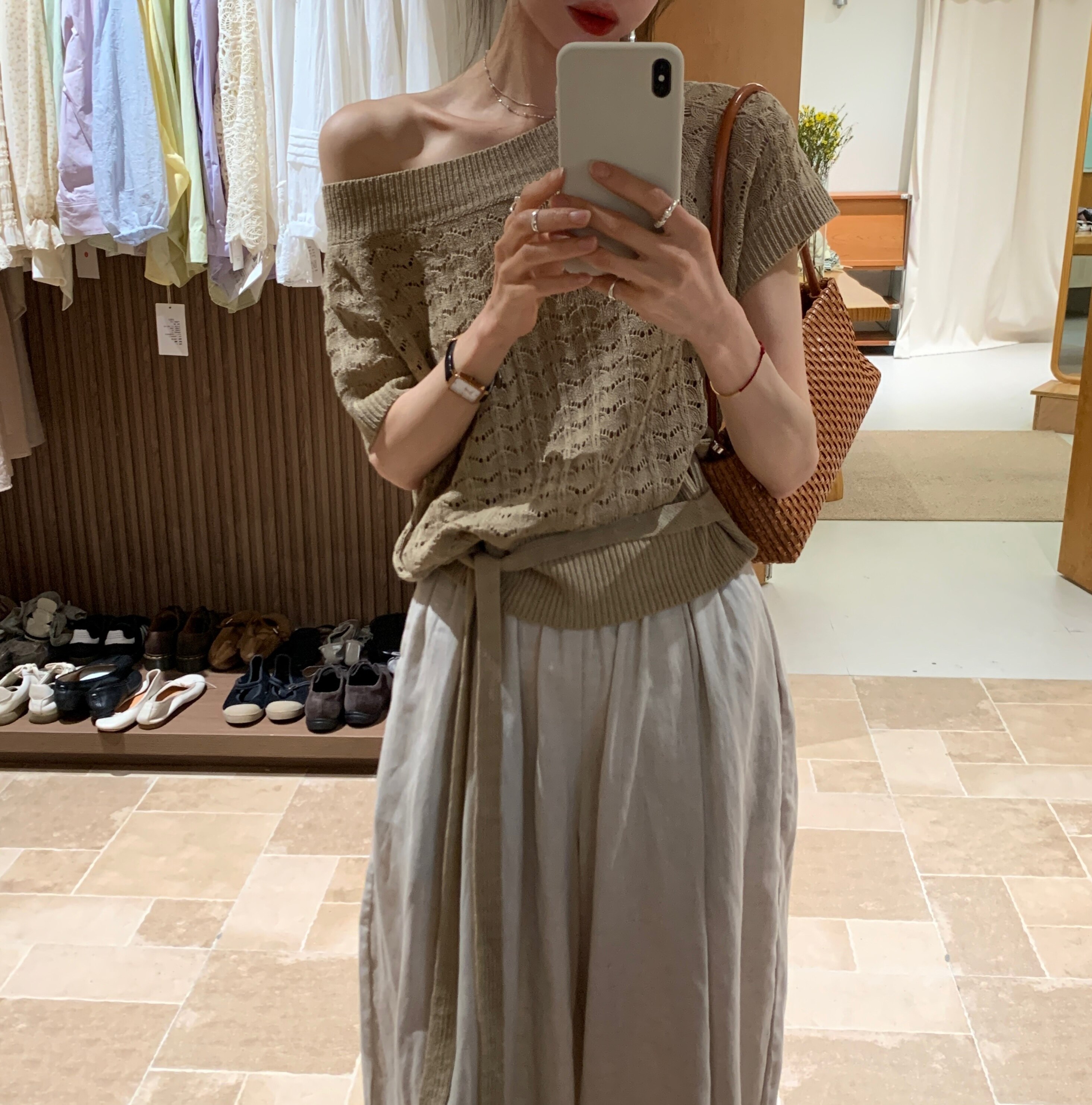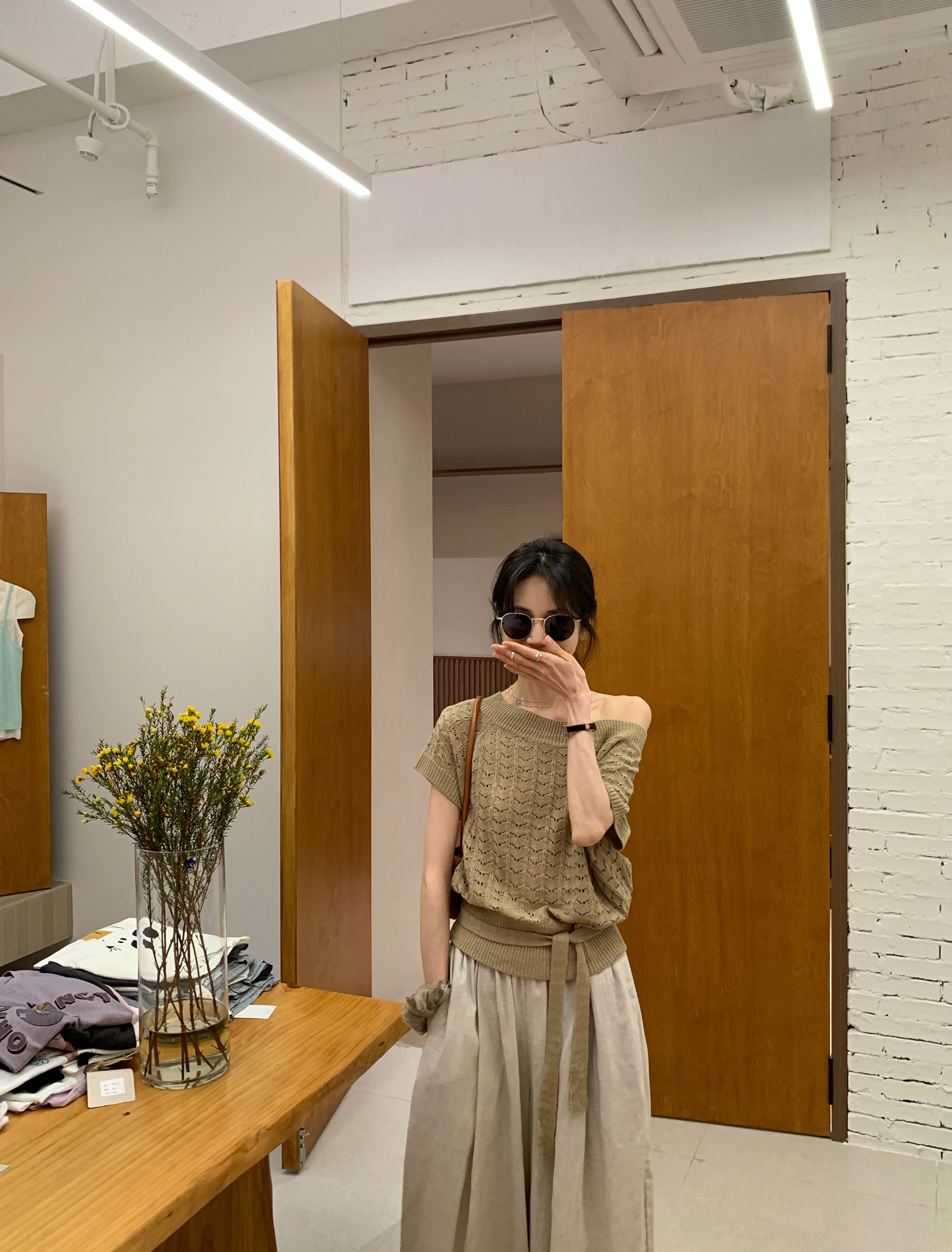 있음 도착 비스듬한 어깨 홀로우 아웃 니트 스웨터 여성 봄 새로운 디자인 센스 부드러운 레이스업 허리 수축 품격 맨위