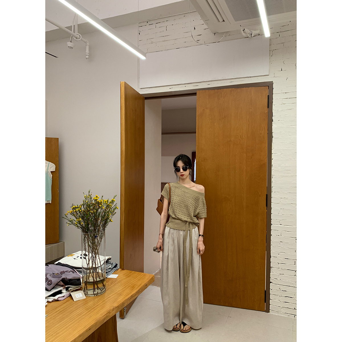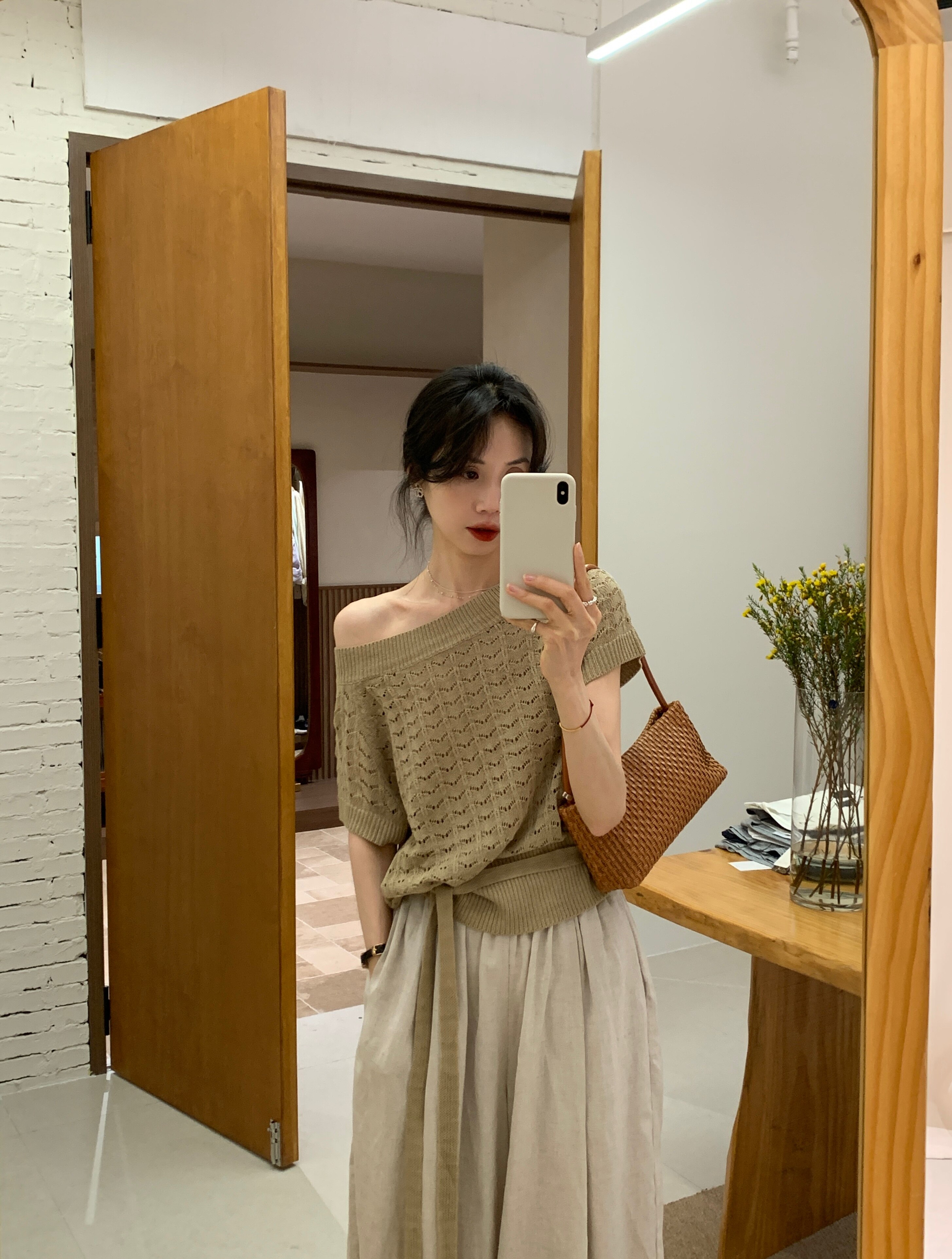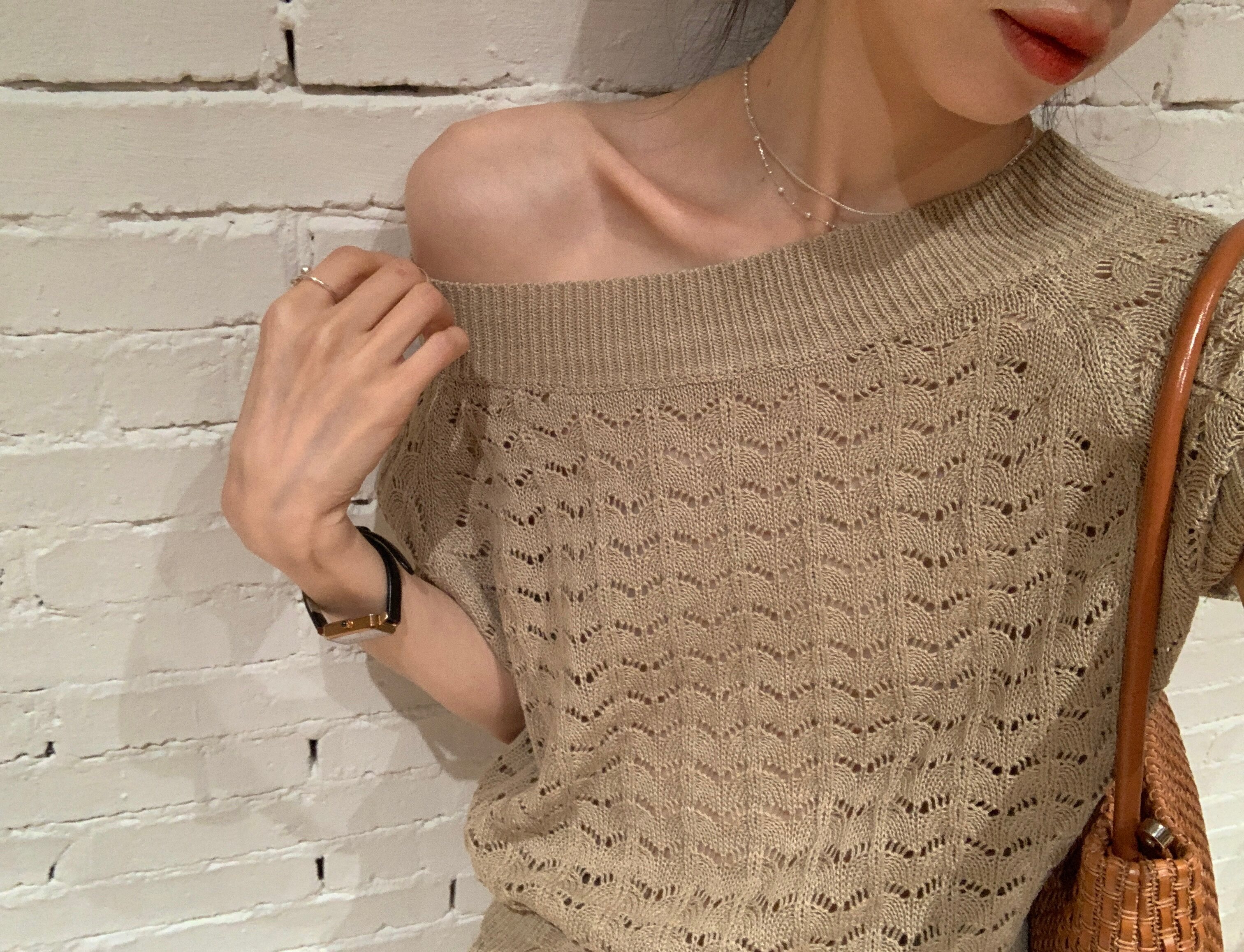 있음 도착 한국 스타일 비스듬한 어깨 니트 스웨터 여성 2026 여름 몸매 가꾸기 슬림해 보이는 반팔 맨위 Chic