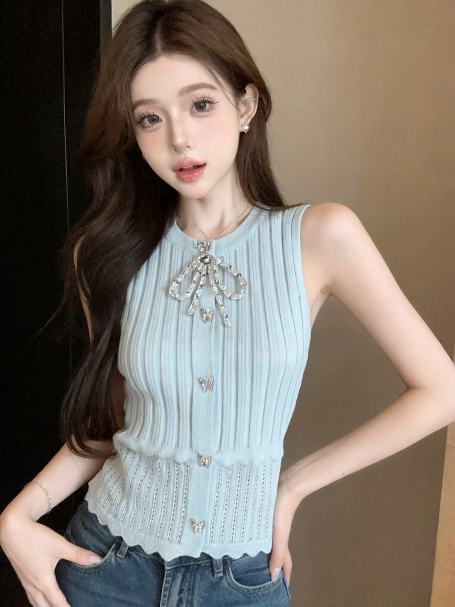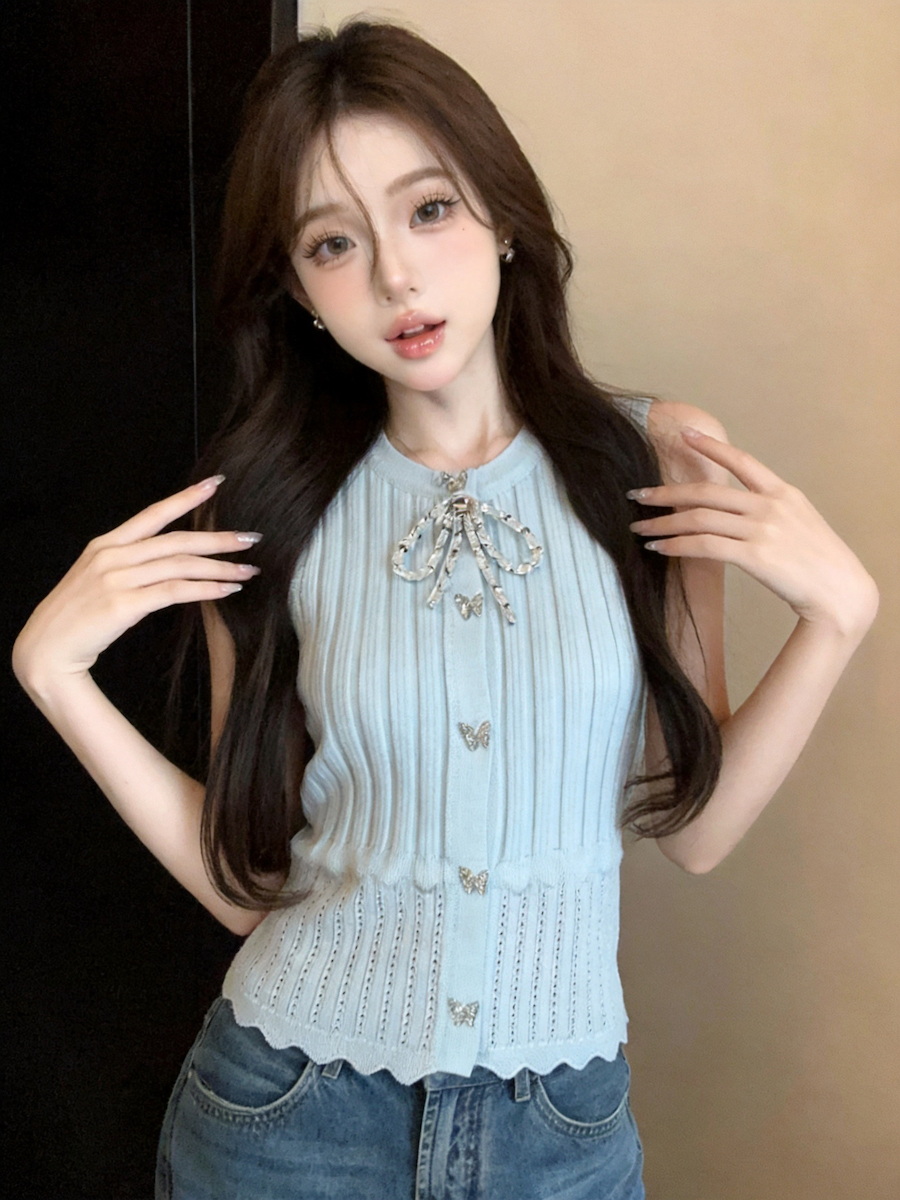 정가 있음 보호 나비 매듭 홀로우 아웃 니트 조끼 여성 여름 디자인 센스 연령 감소 다용도 품격 쇼트 스타일 맨위