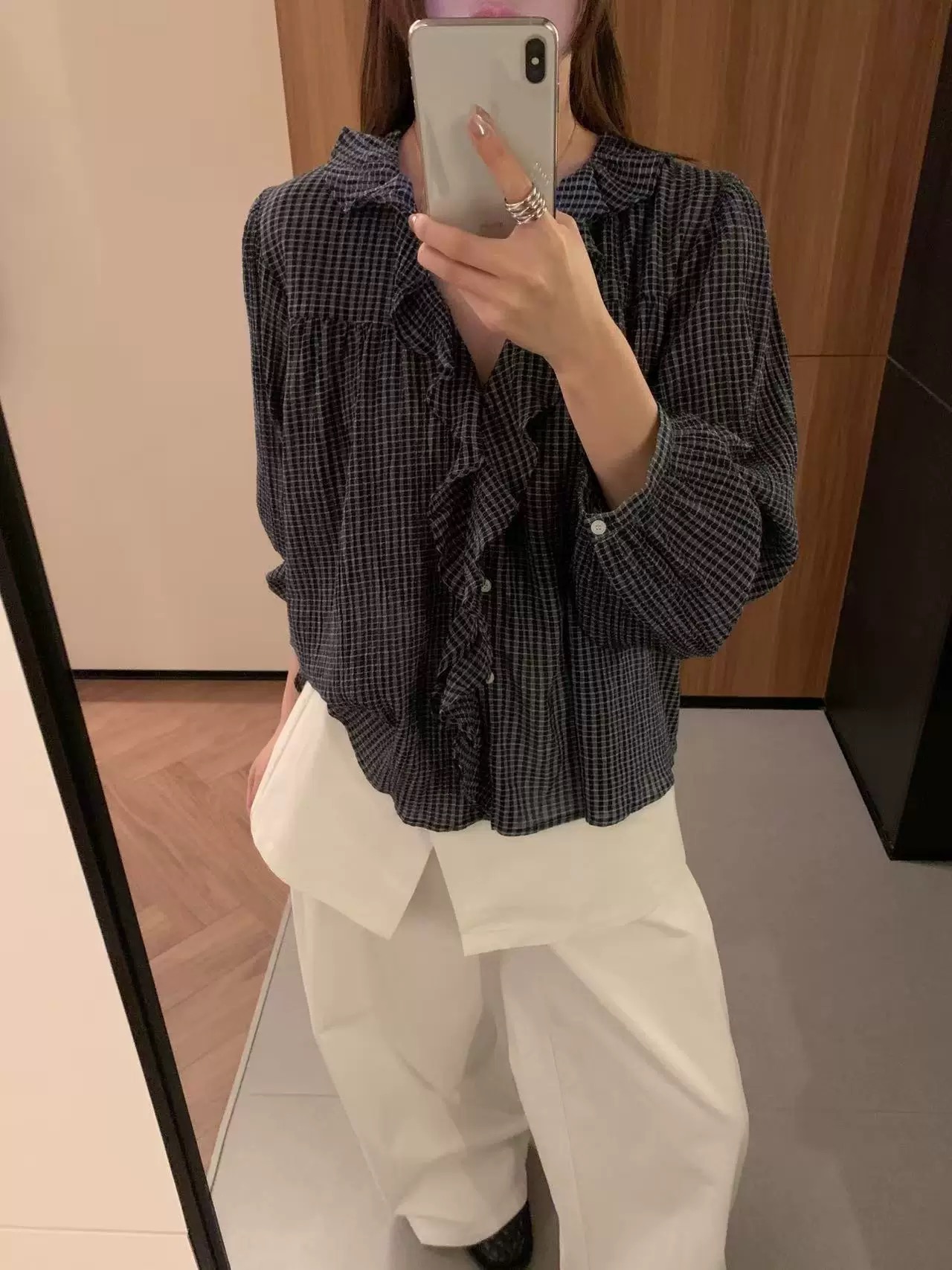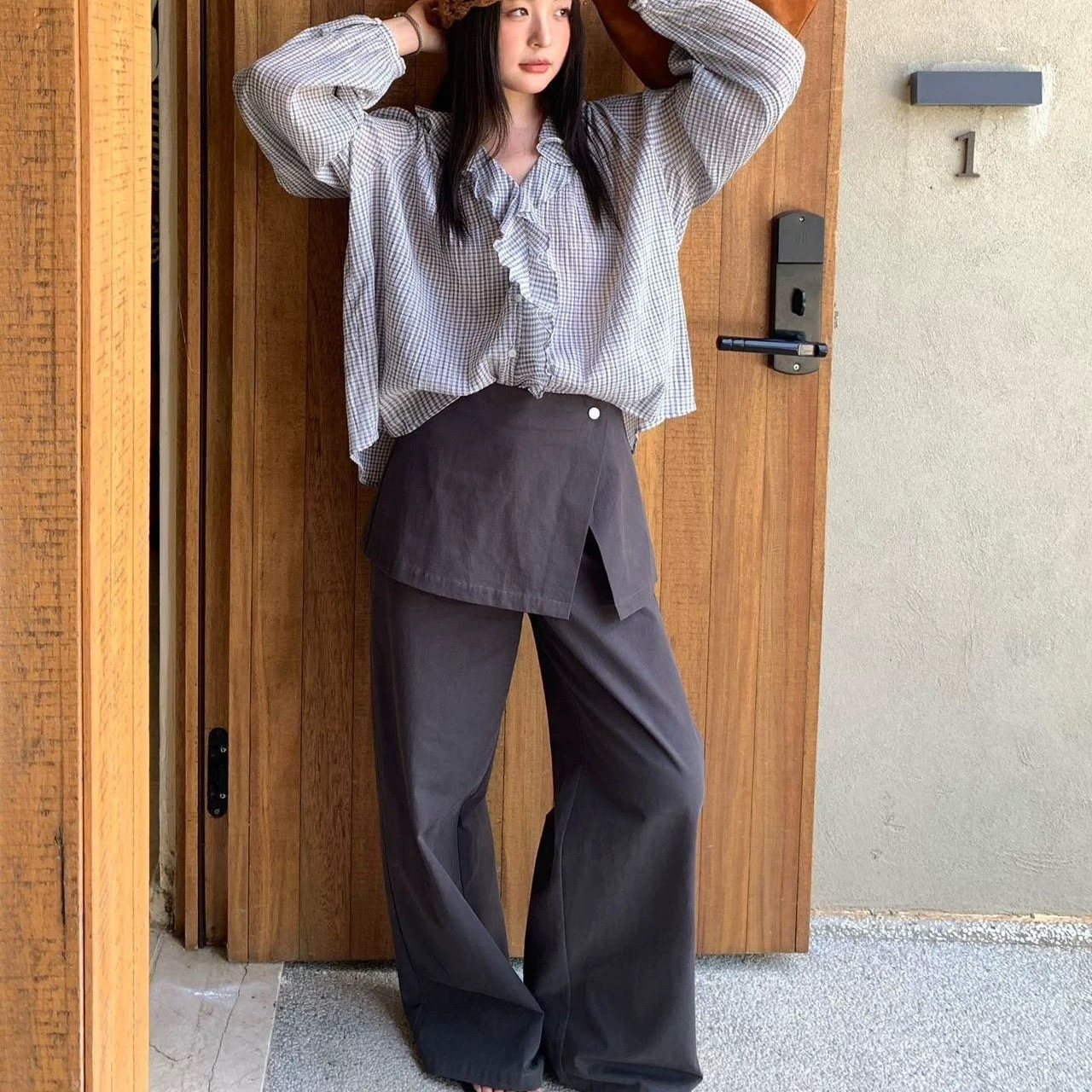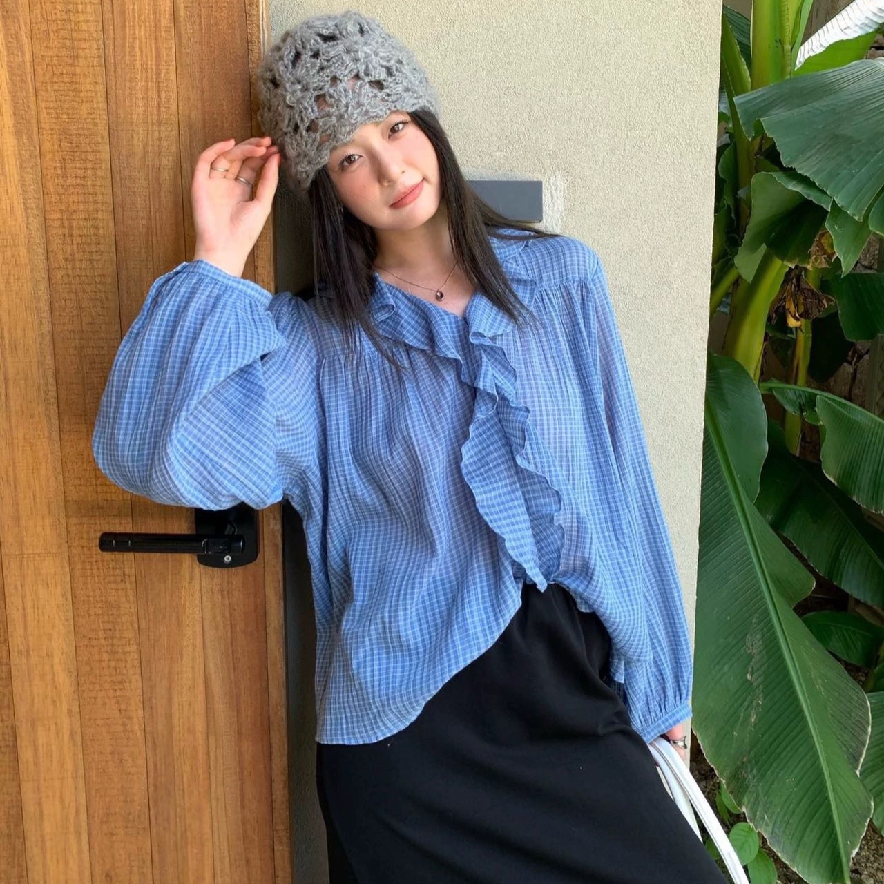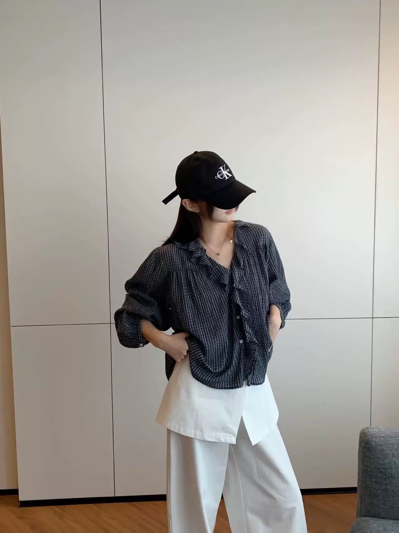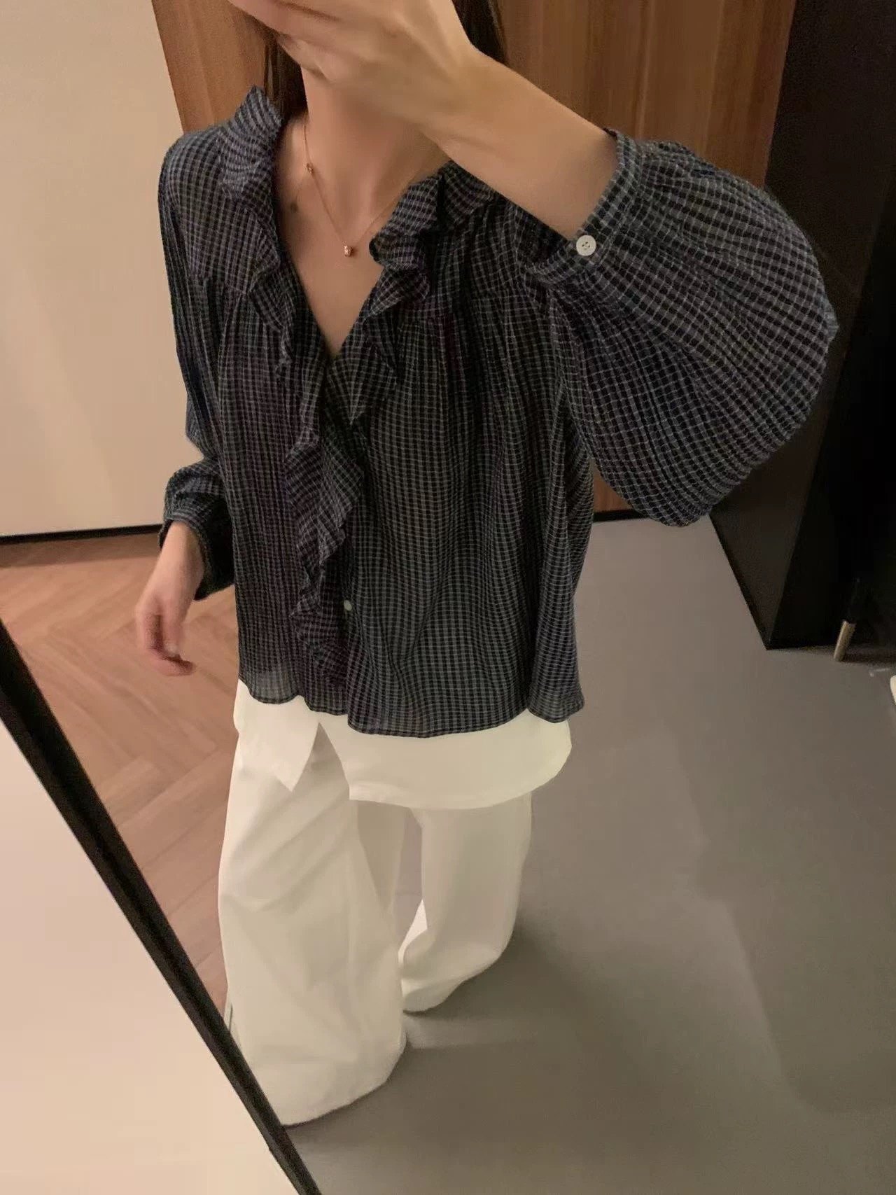 한 부서 V넥 프릴 격자 무늬 셔츠 느긋한 바람 루즈핏 디자인 센스 셔츠