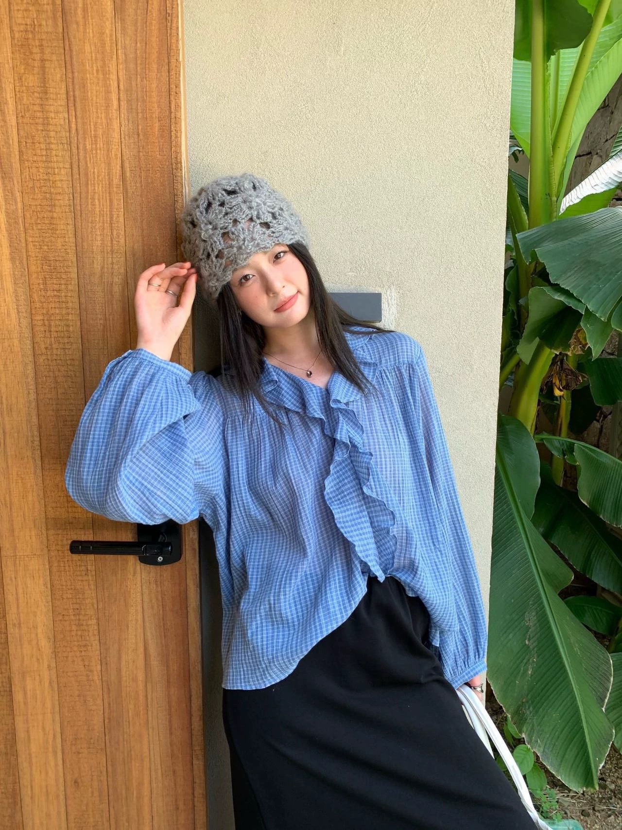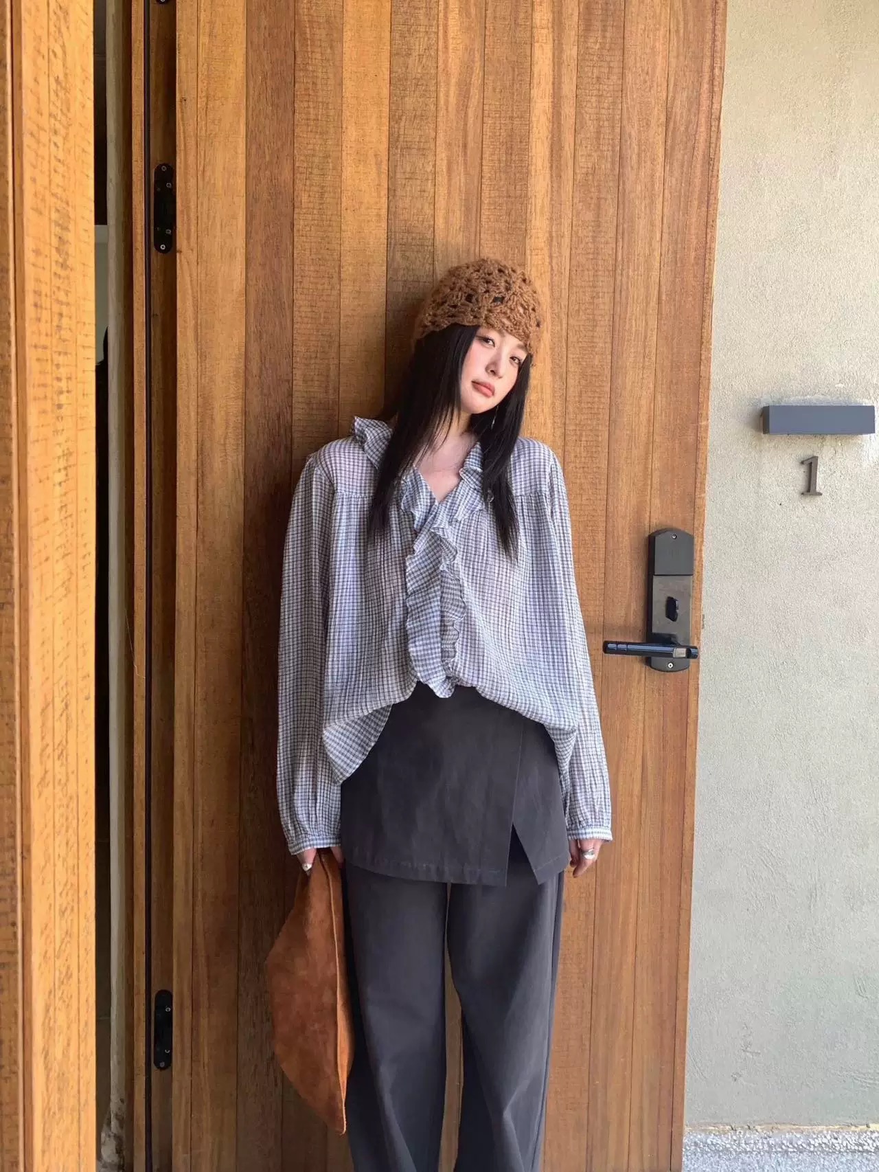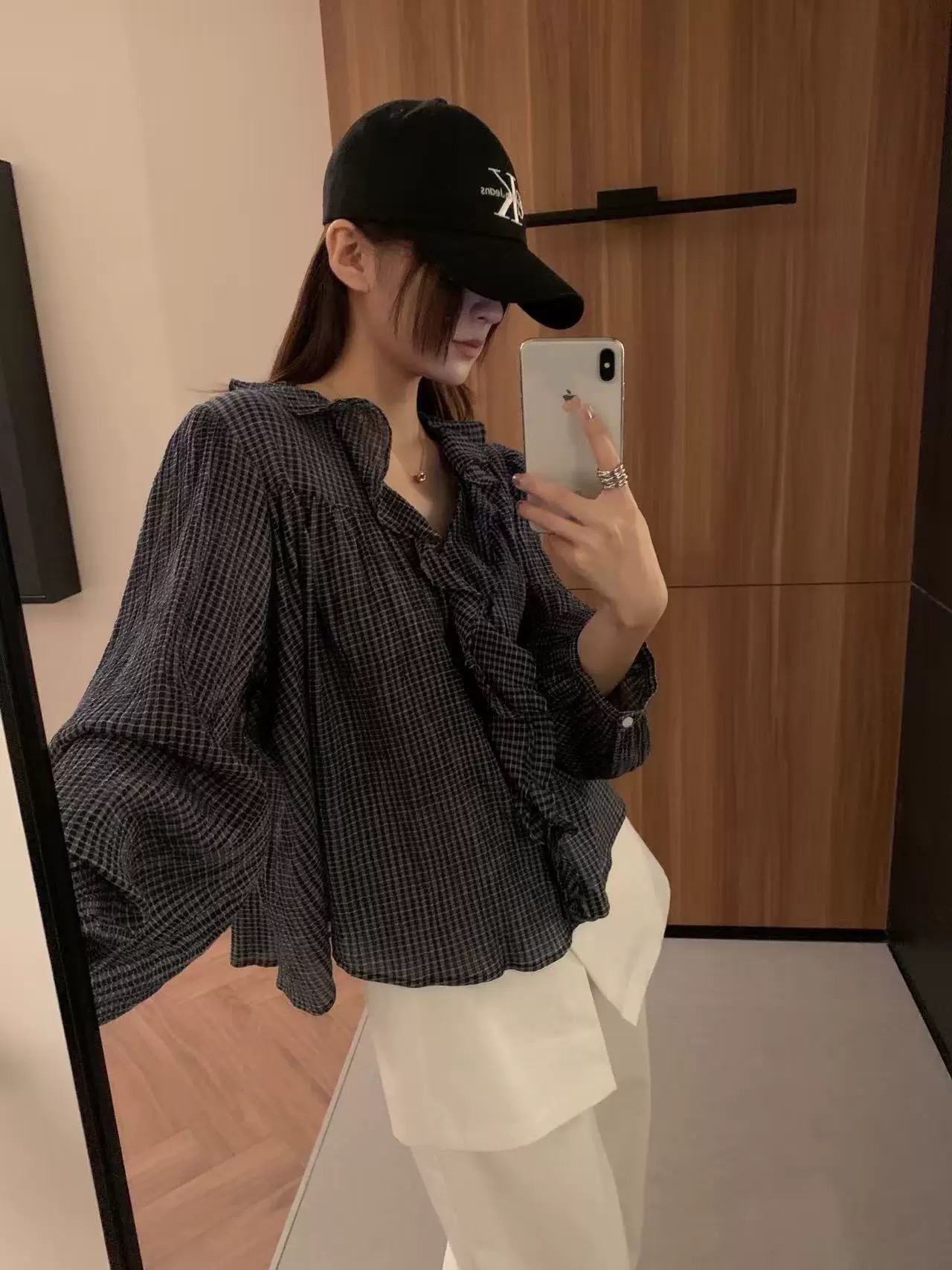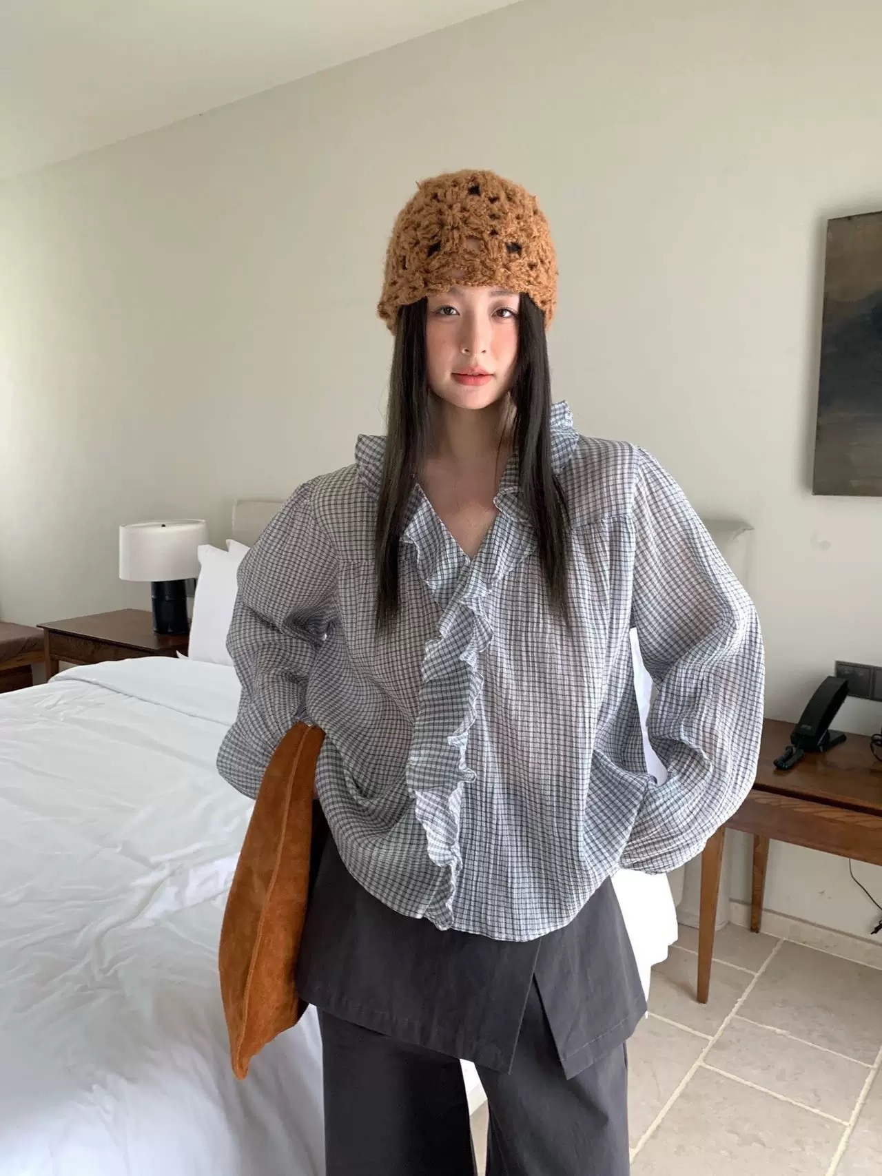 한 부서 V넥 프릴 격자 무늬 셔츠 느긋한 바람 루즈핏 디자인 센스 셔츠