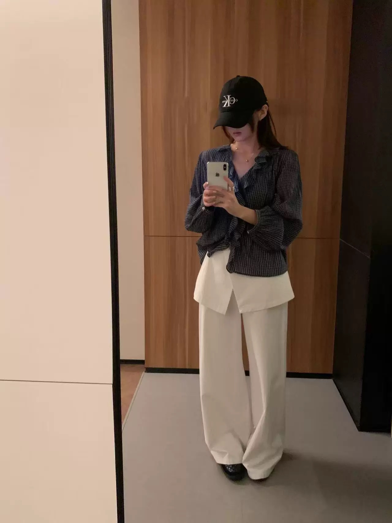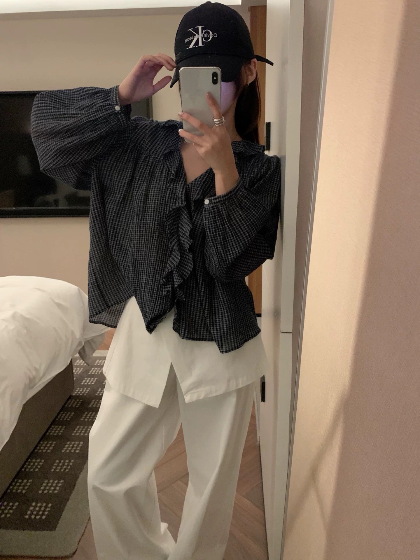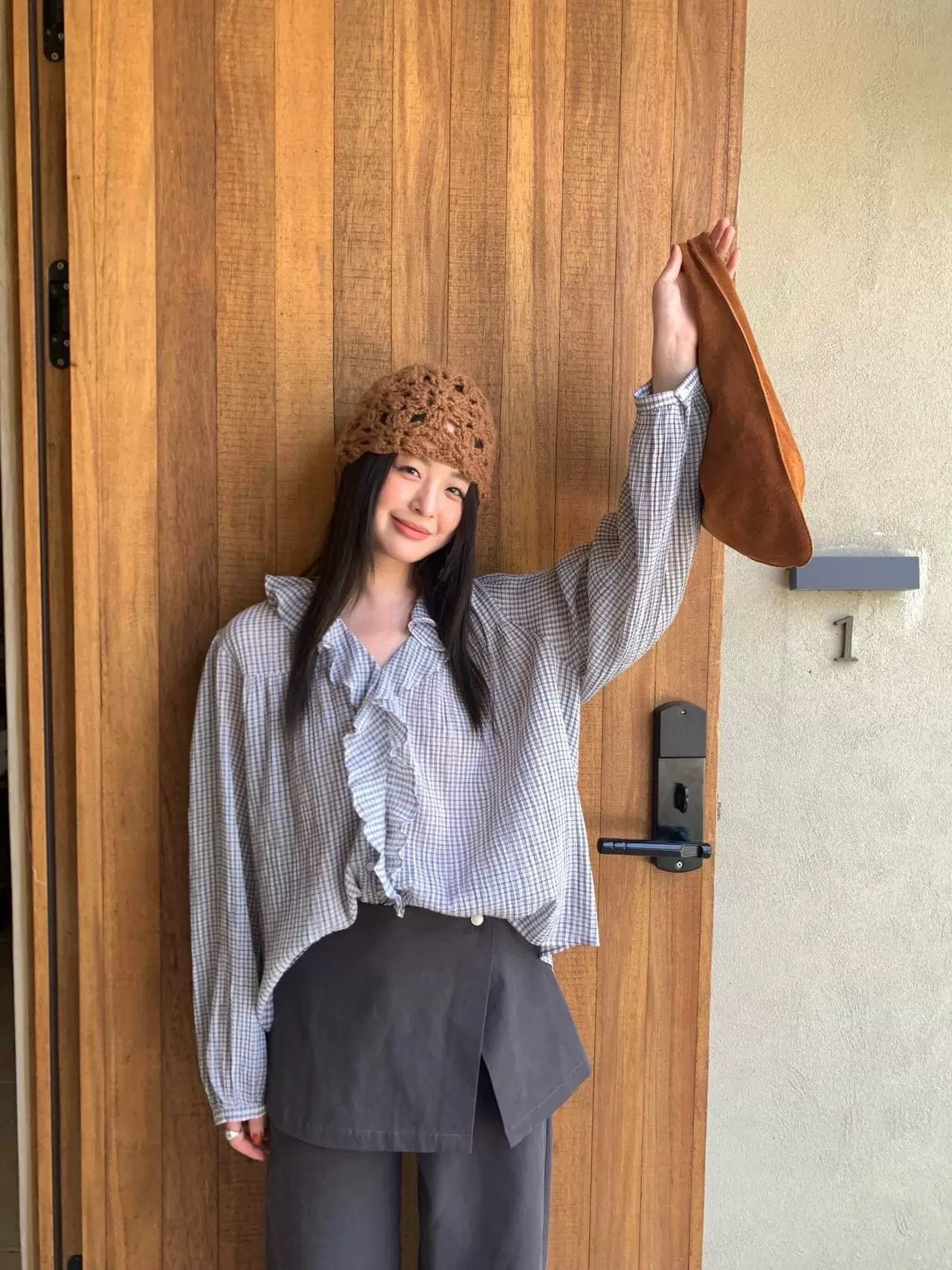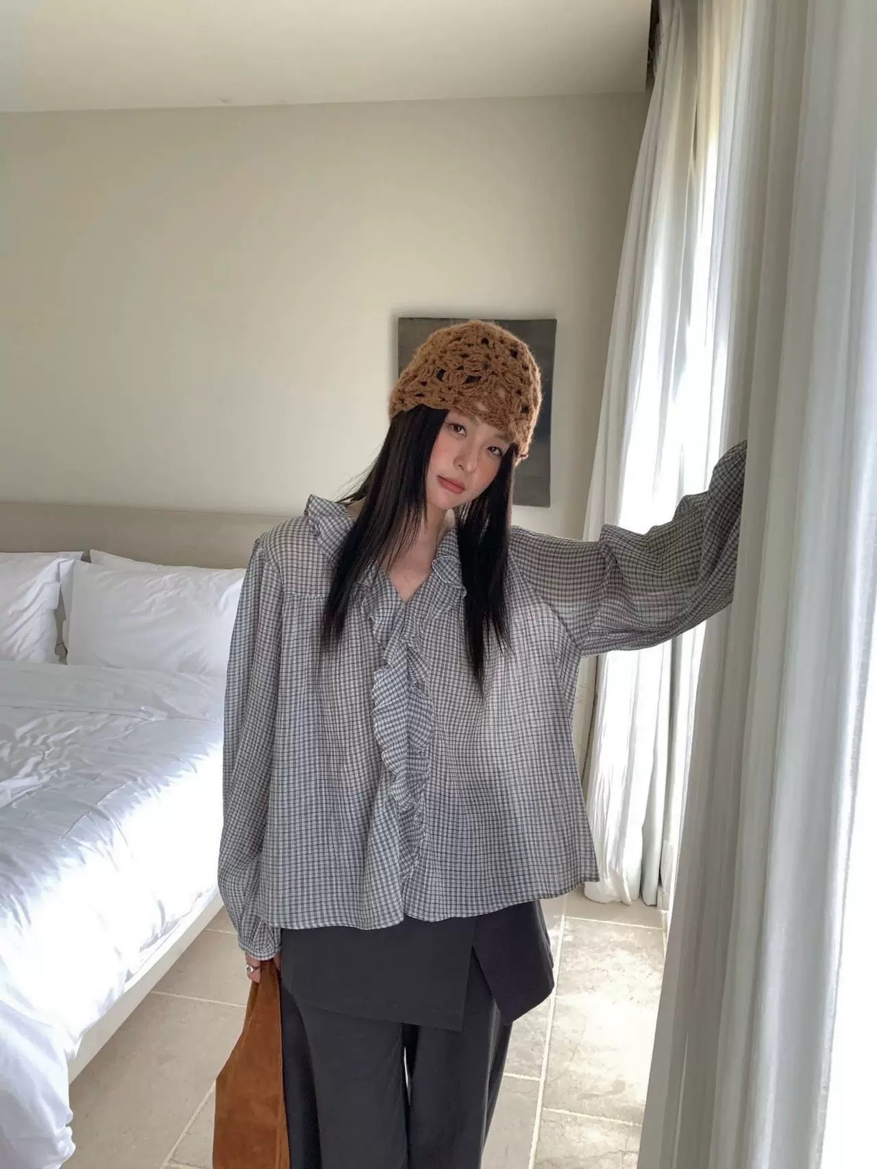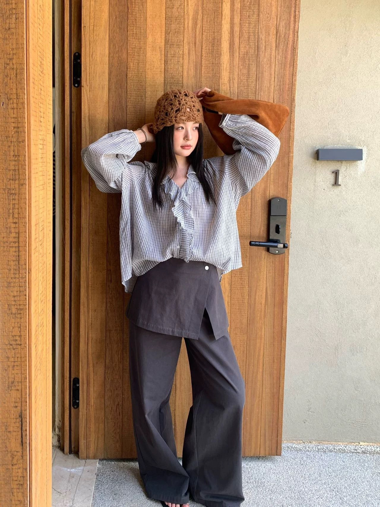 한 부서 V넥 프릴 격자 무늬 셔츠 느긋한 바람 루즈핏 디자인 센스 셔츠