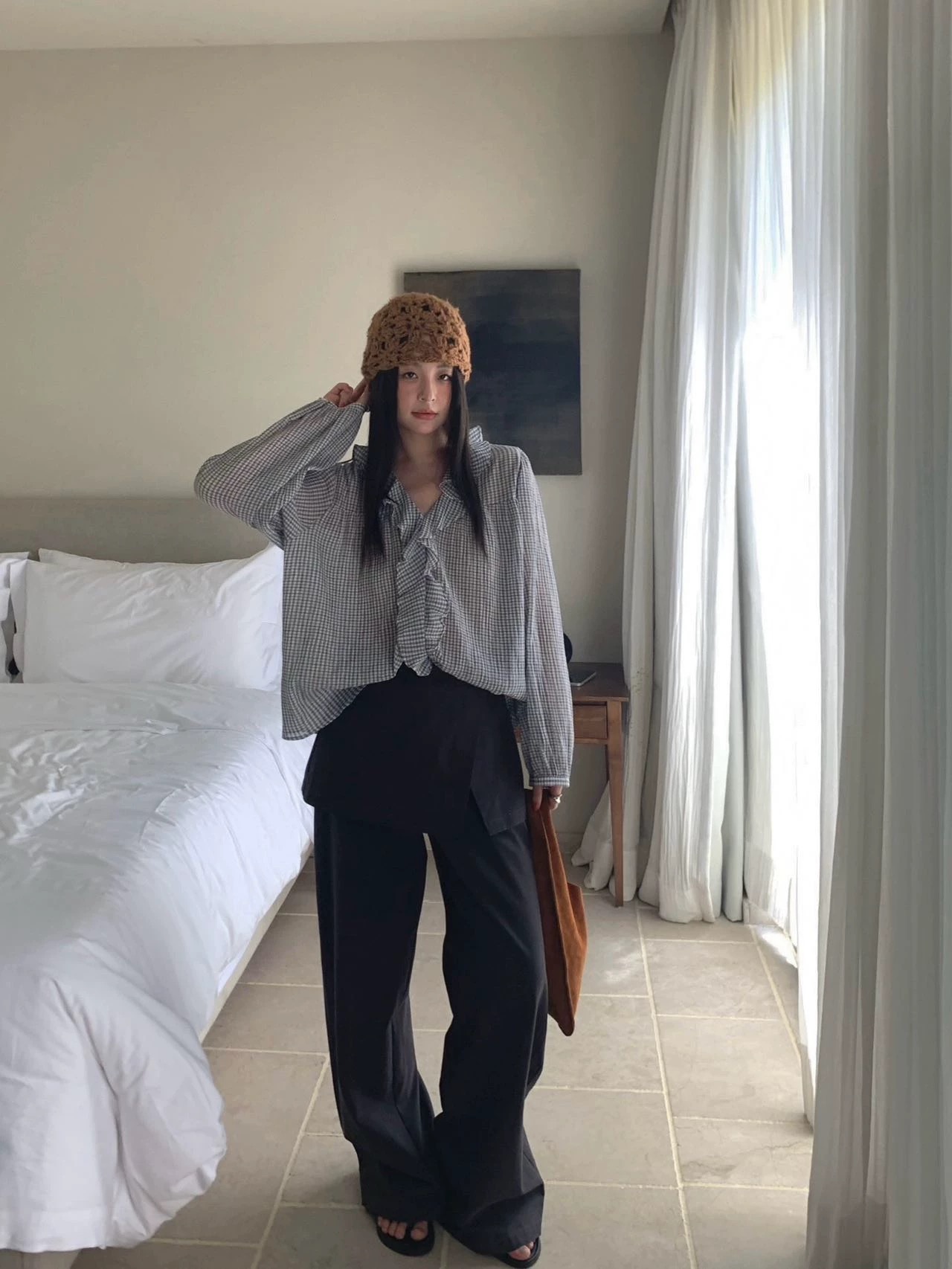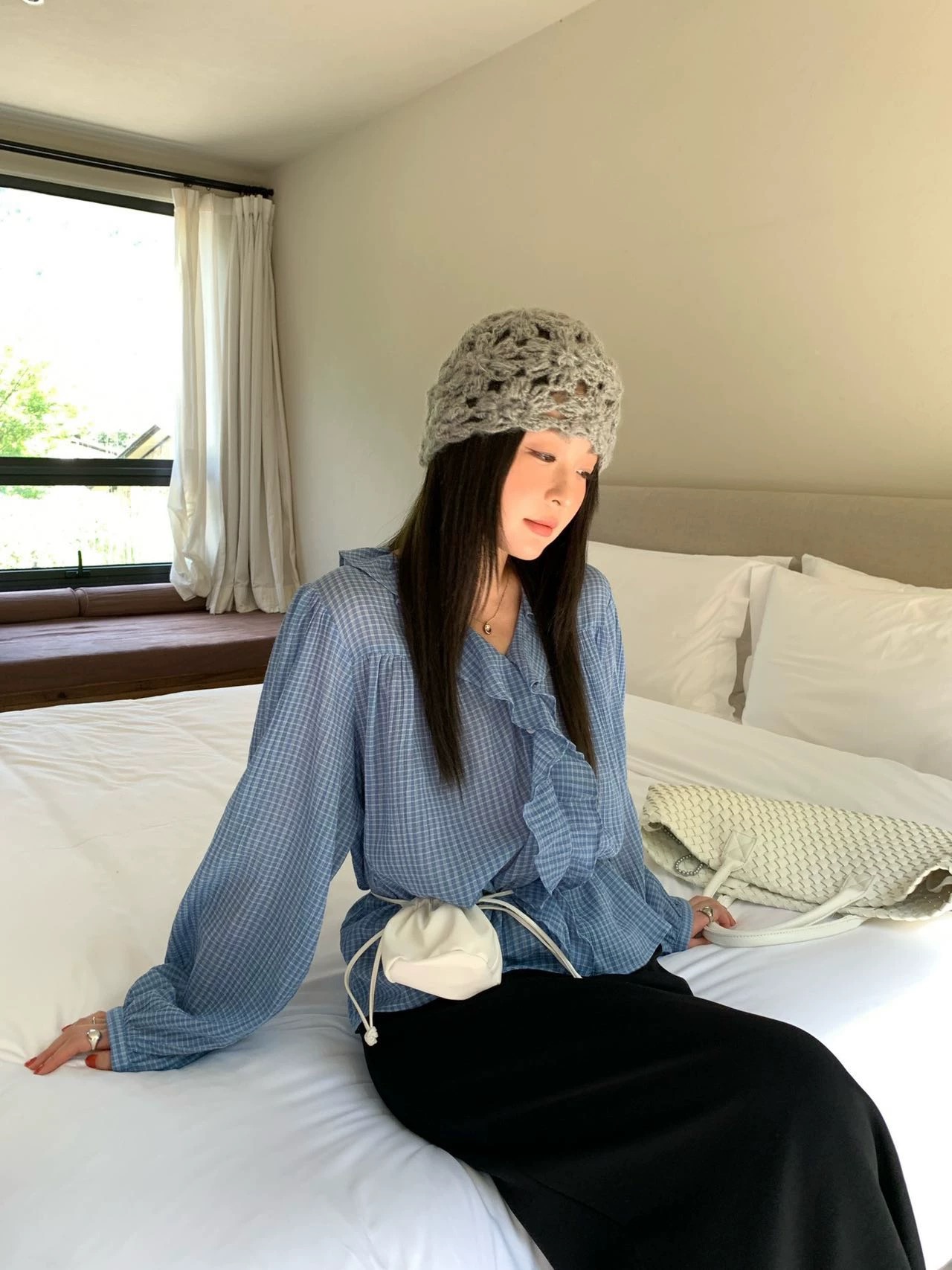 원본 한국 chic 프릴 체크무늬 쉬폰 블라우스 캐미솔 스트랩 홀로우 아웃 주름 패치워크 맨위