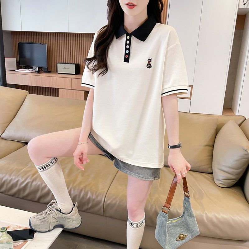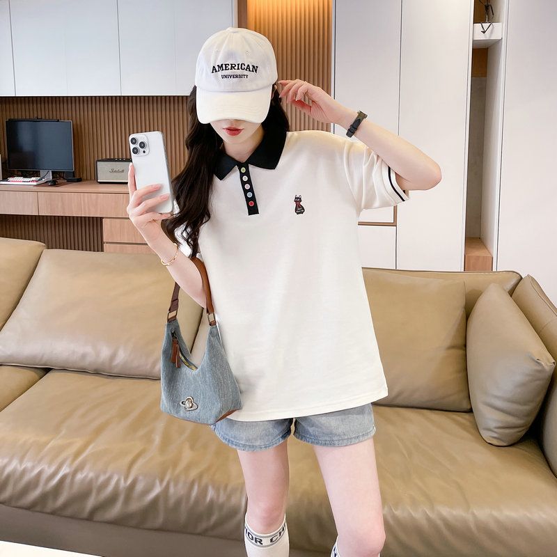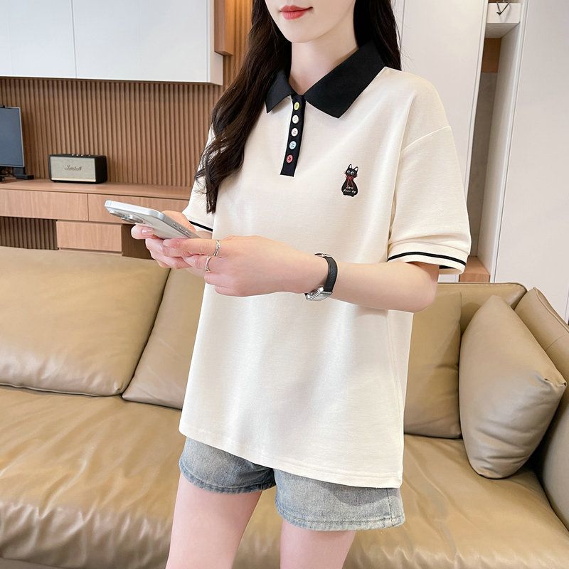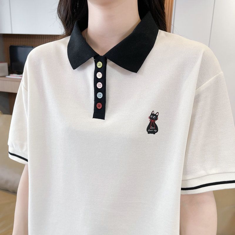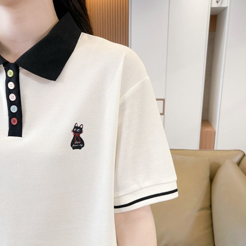 실사 2026 순면 반팔 티셔츠 여성 여름 새로운 한국 스타일 새끼 고양이 자수 빅 사이즈 여성 의류