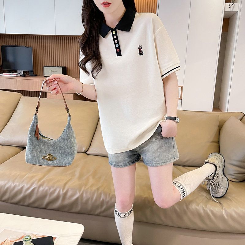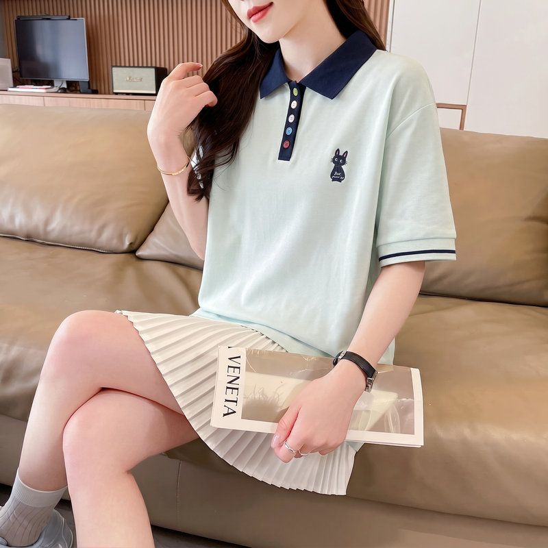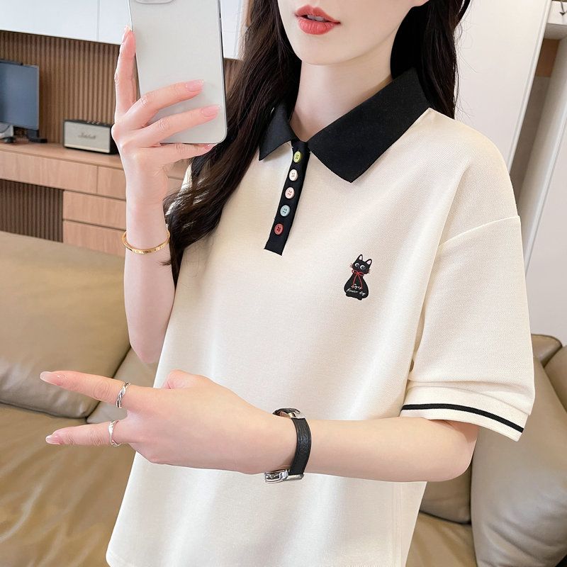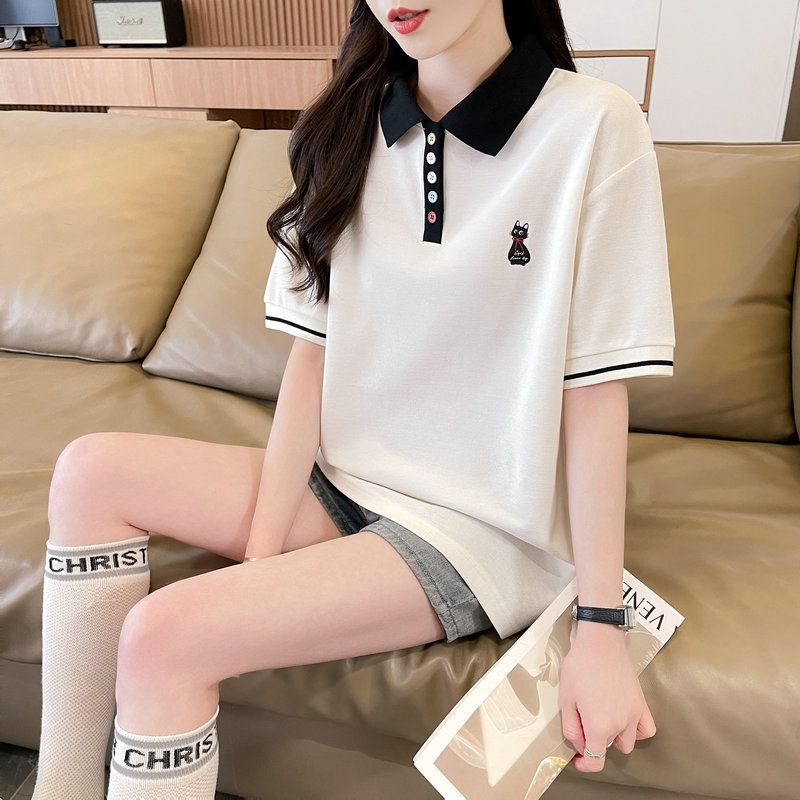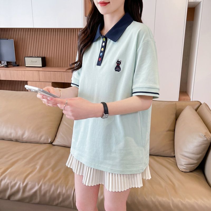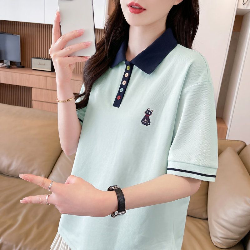 실사 2026 순면 반팔 티셔츠 여성 여름 새로운 한국 스타일 새끼 고양이 자수 빅 사이즈 여성 의류