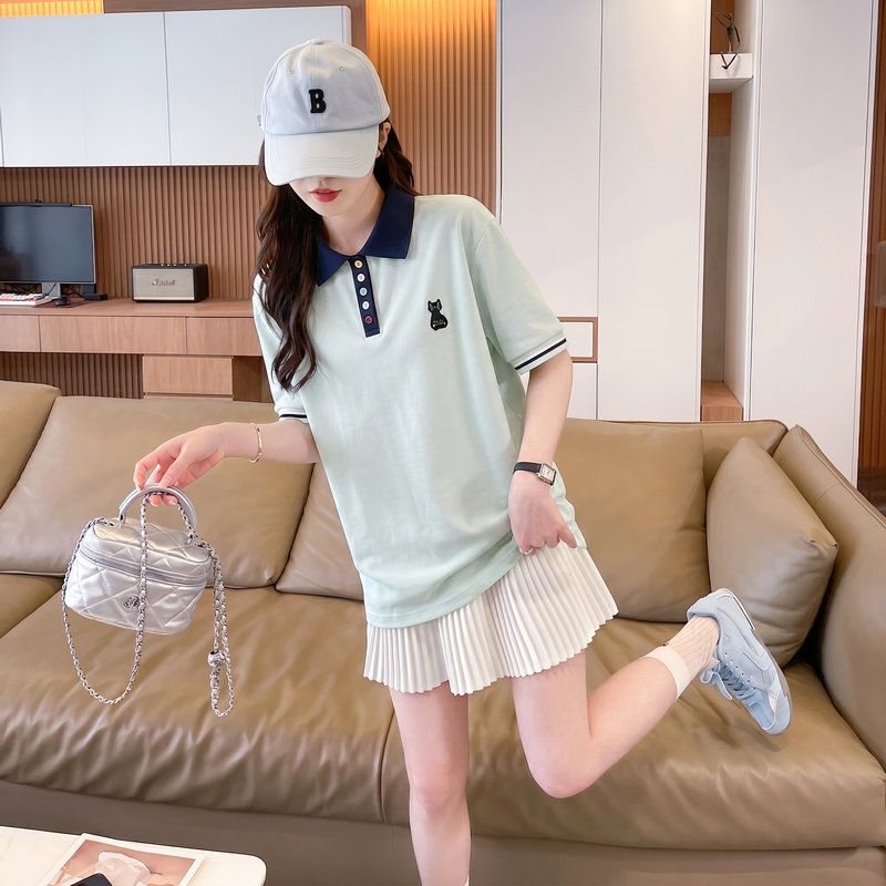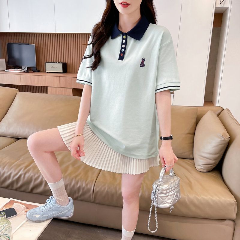 페이크 레이어드 폴로 칼라 니트 반팔 티셔츠 여성 여름 새로운 빅 사이즈 마이크로 지방 자매 연령 감소 슬림해 보이는 스트라이프 맨위