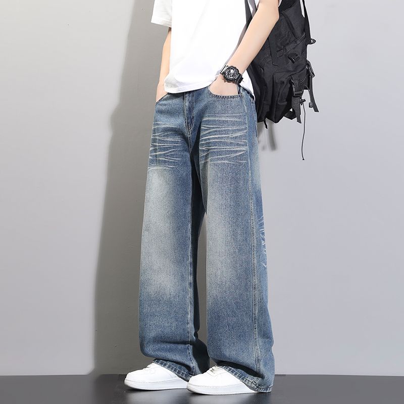 사계절 워시 물 바닥 청소 남성 청바지 레트로 항구 바람 루즈핏 스트레이트 트렌드 다용도 바지 와이드 레그 팬츠 긴 바지