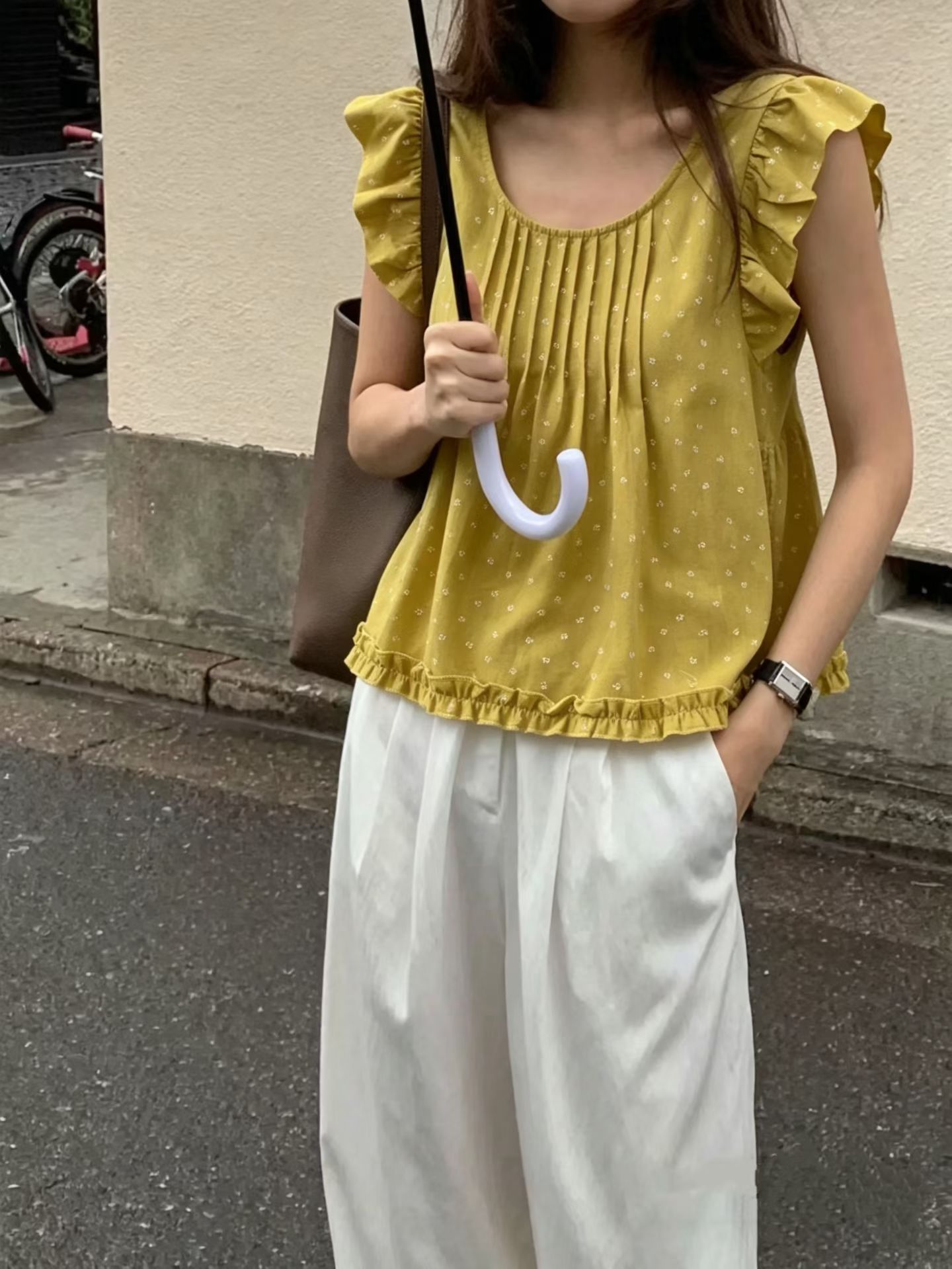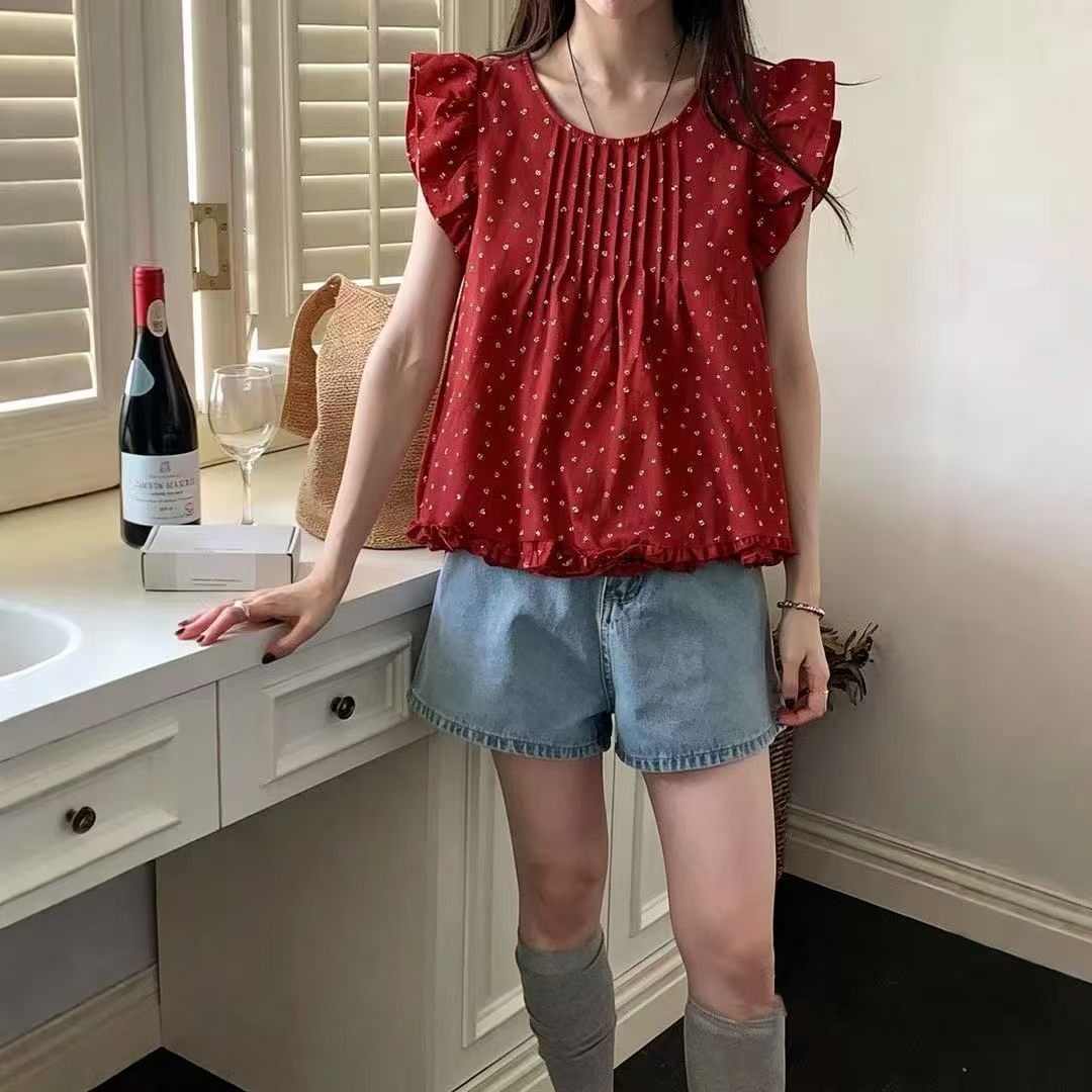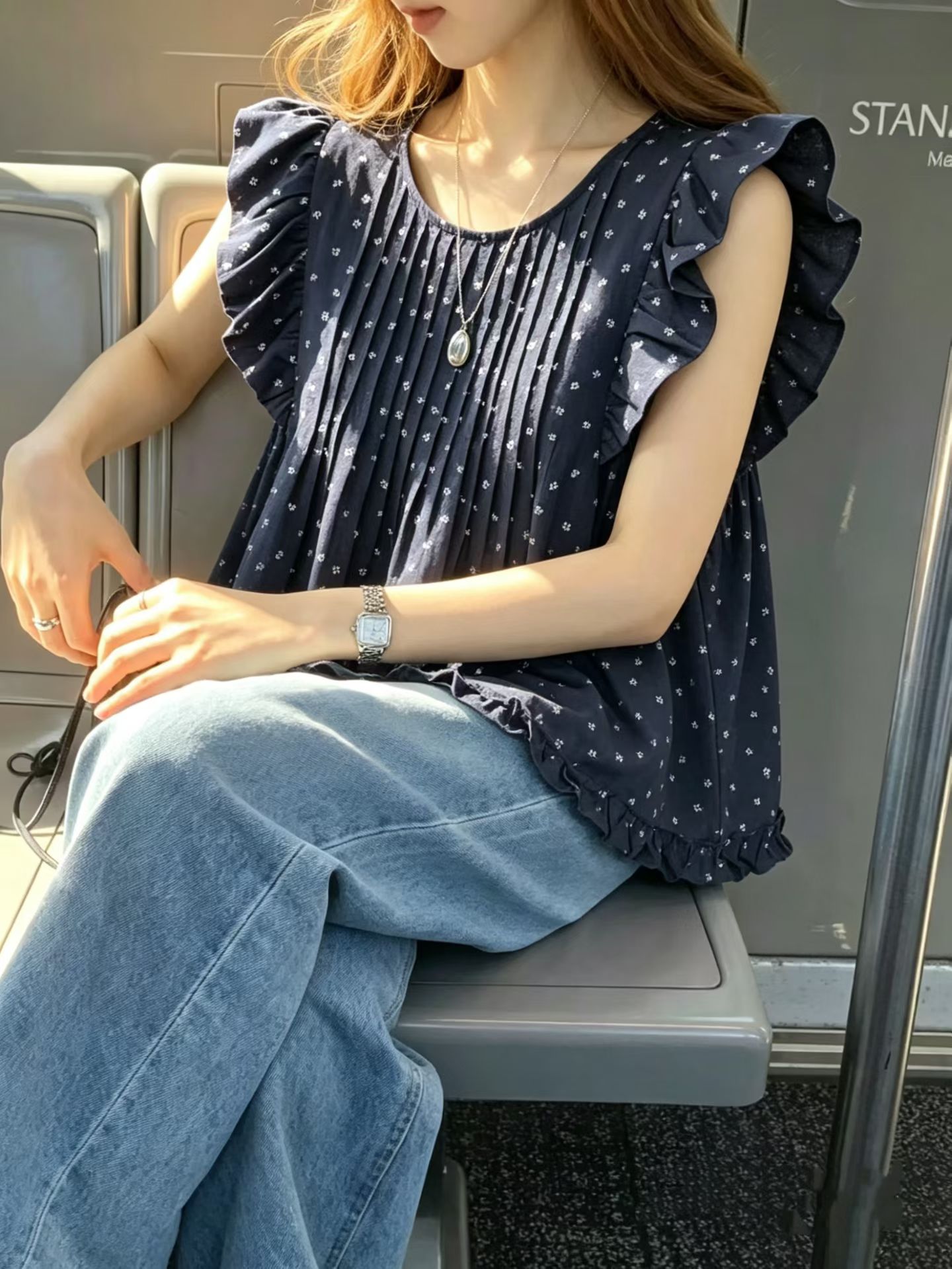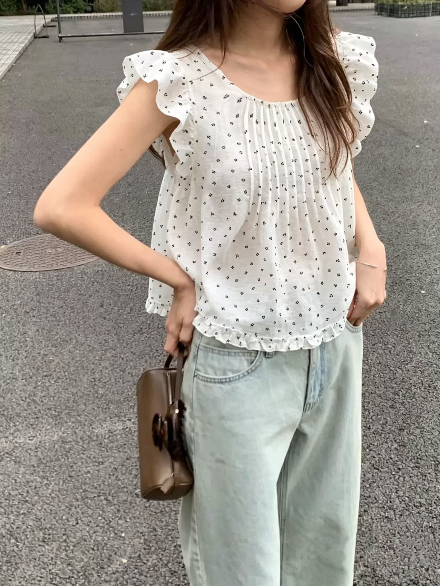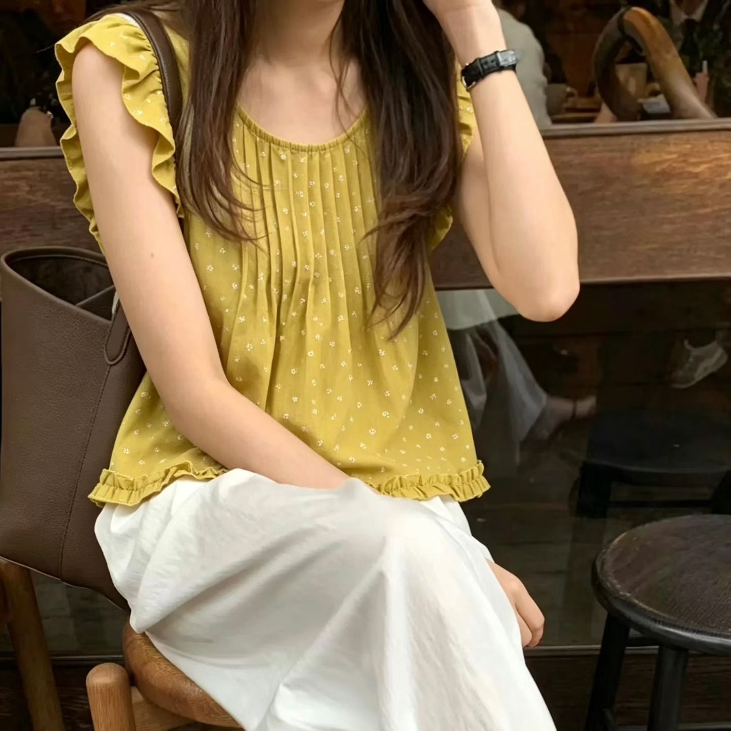 유럽 상품 라운드 넥 주름 Feifei 소매 작은 꽃무늬 프릴 셔츠 맨위 여성 2026 년 여름 민소매 작은 키