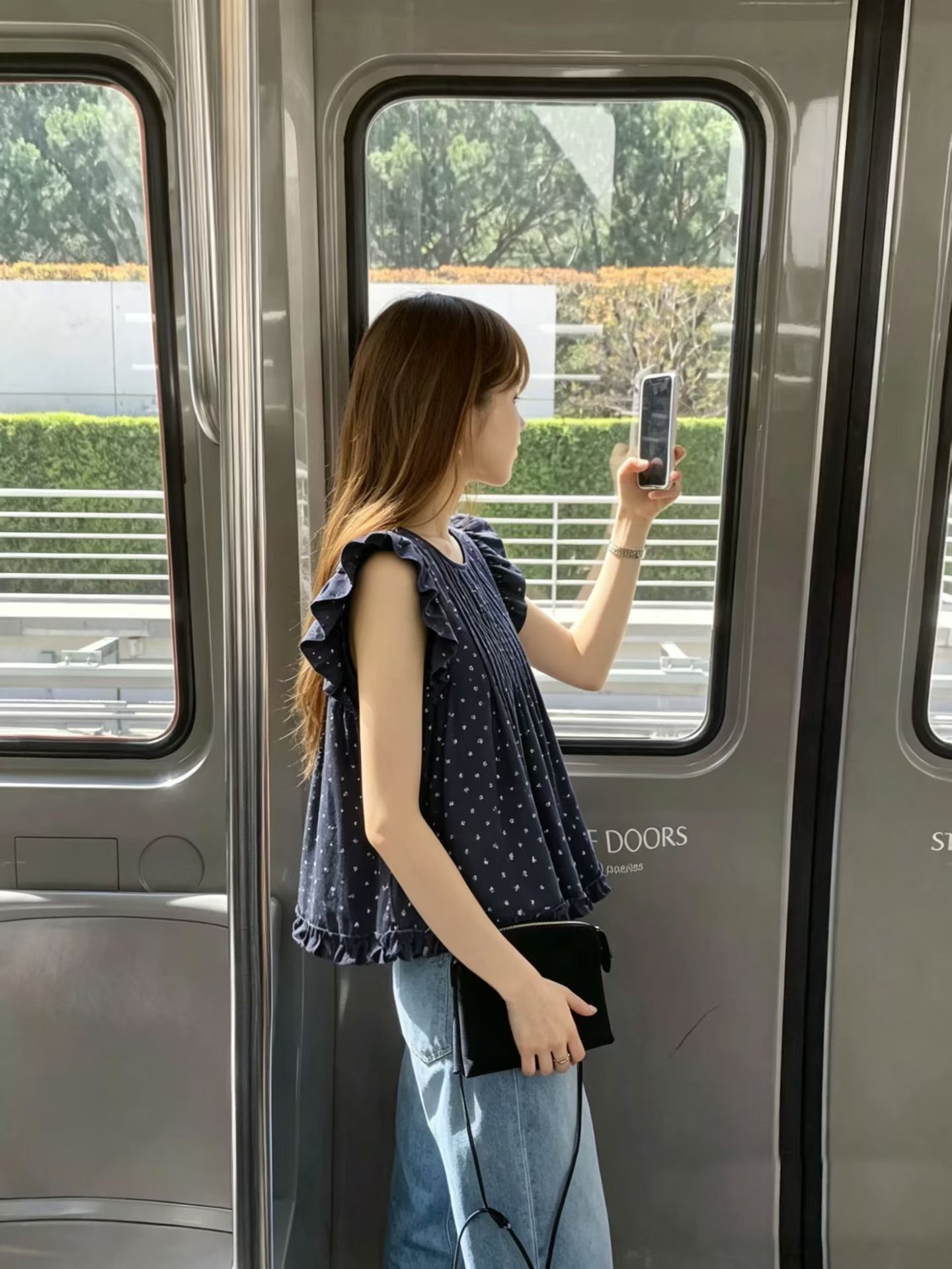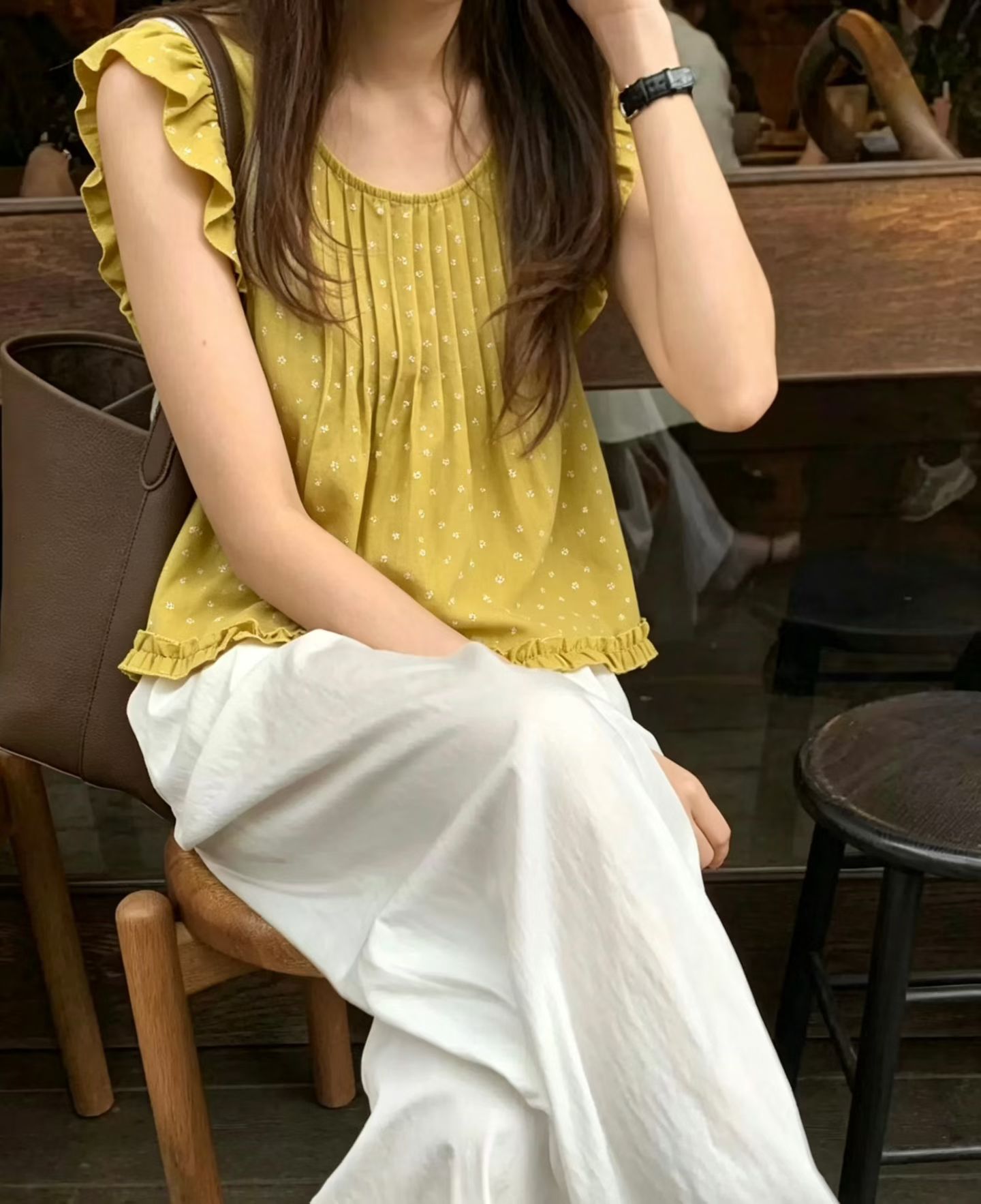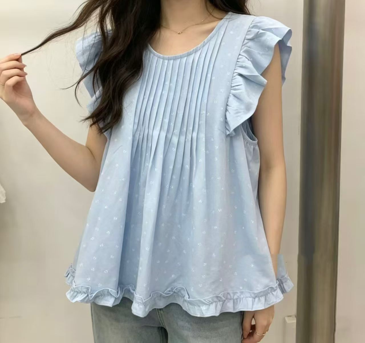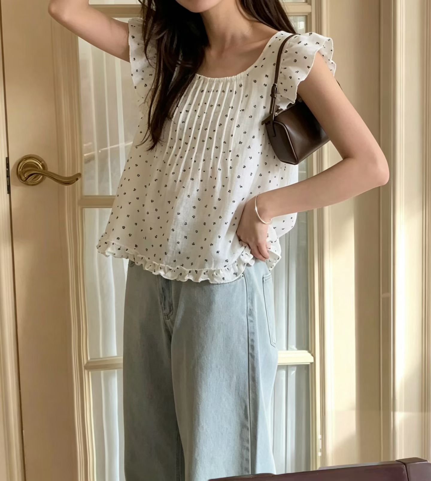 유럽 상품 라운드 넥 주름 Feifei 소매 작은 꽃무늬 프릴 셔츠 맨위 여성 2026 년 여름 민소매 작은 키