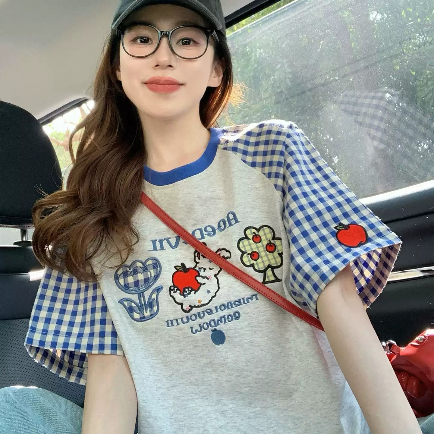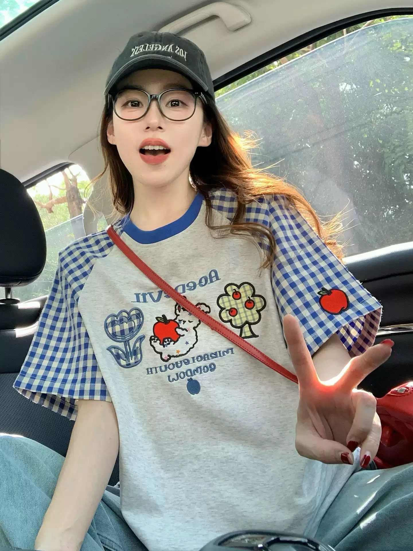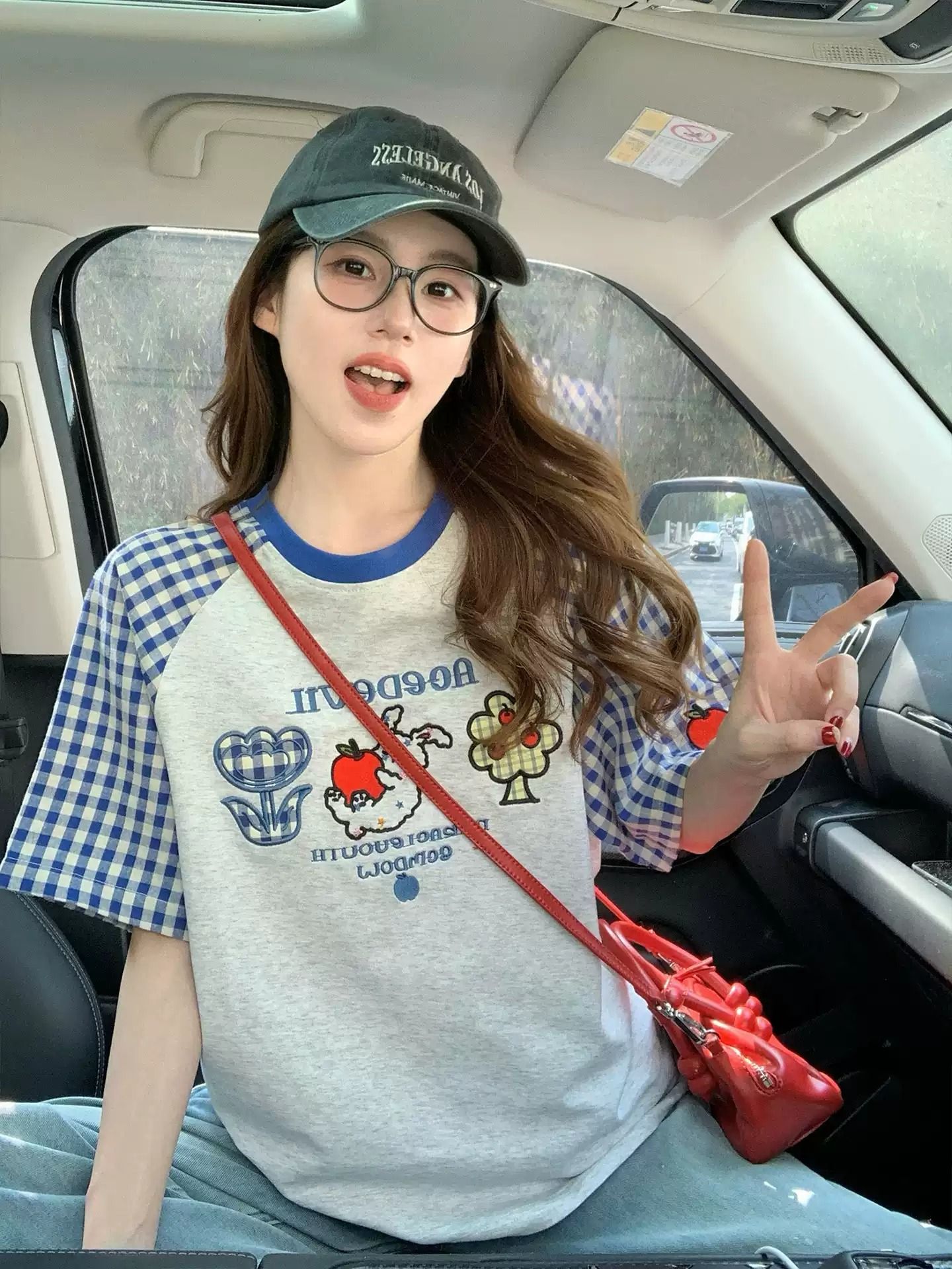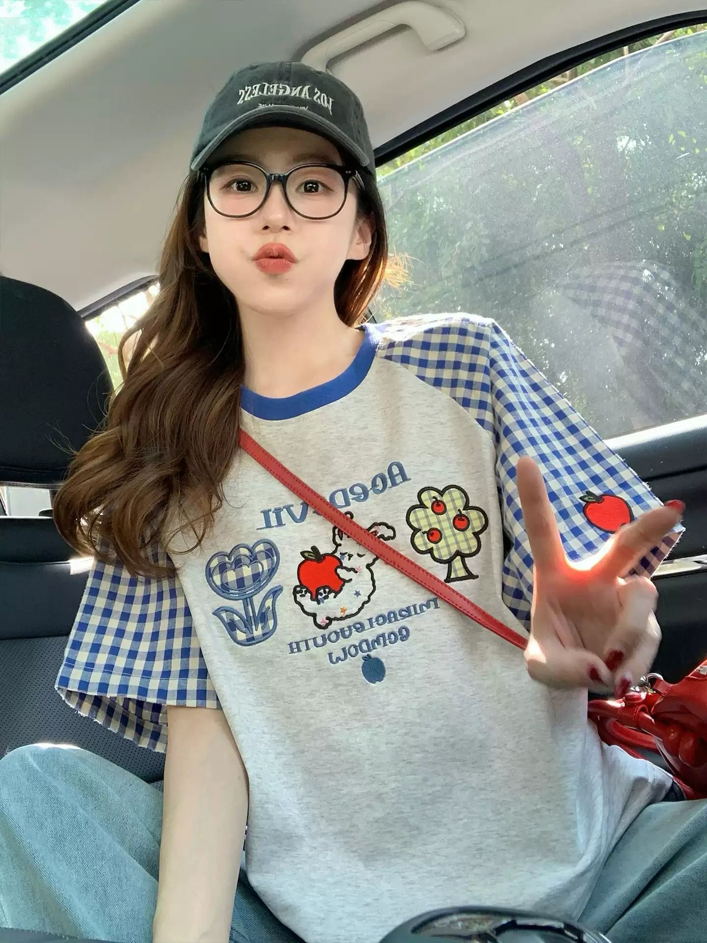 200그램 순면 이후 패키지 칼라 체크무늬 배색 삽입 어깨 반팔 티셔츠 여성 2026 여름 프린트 맨위