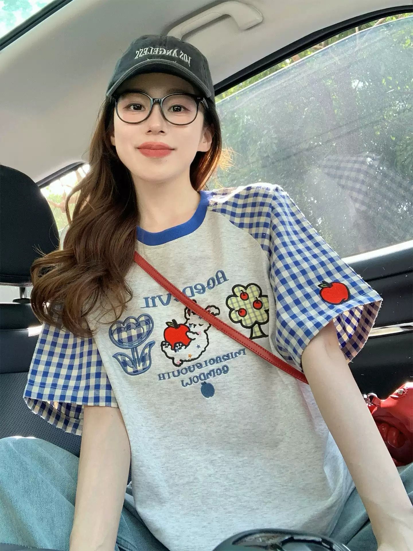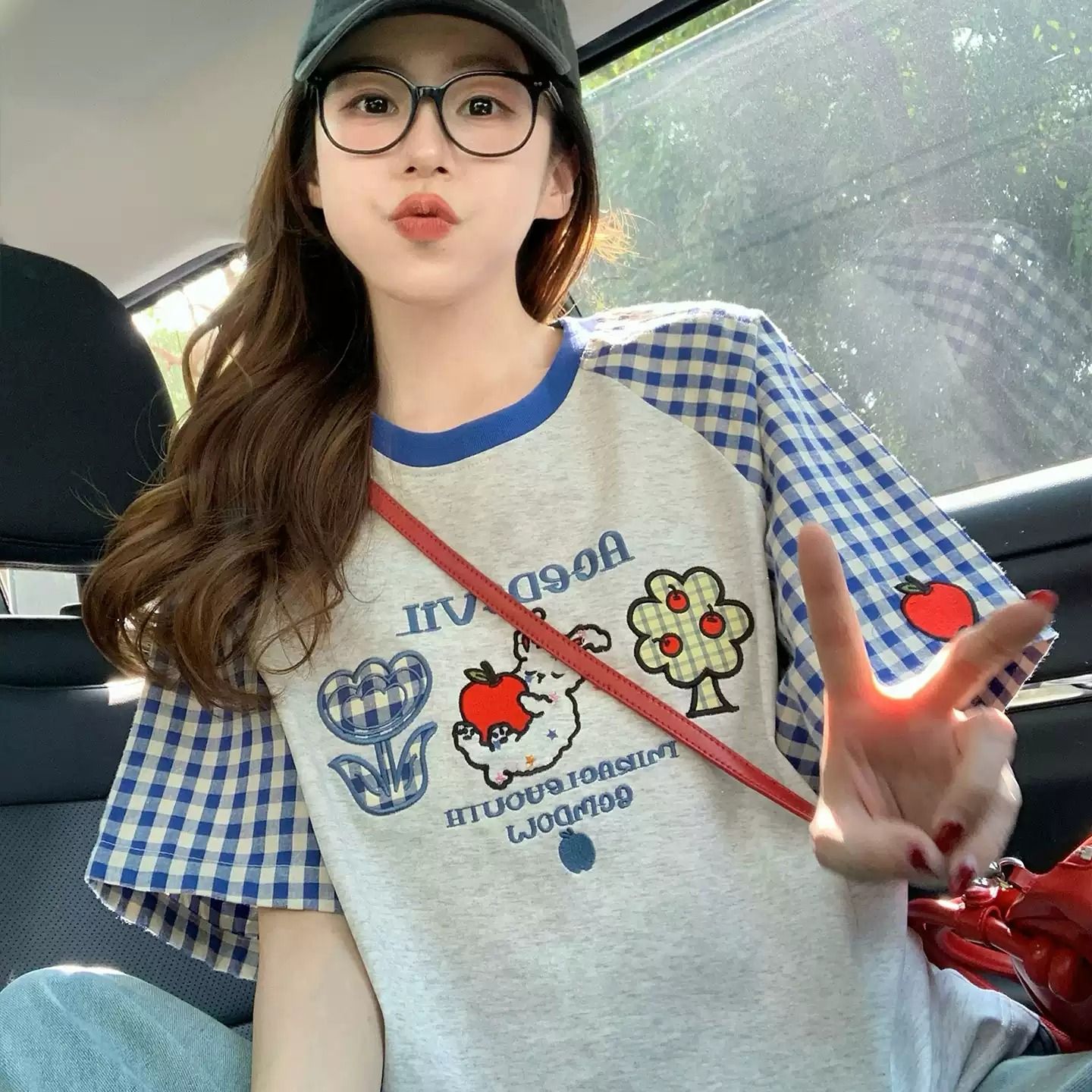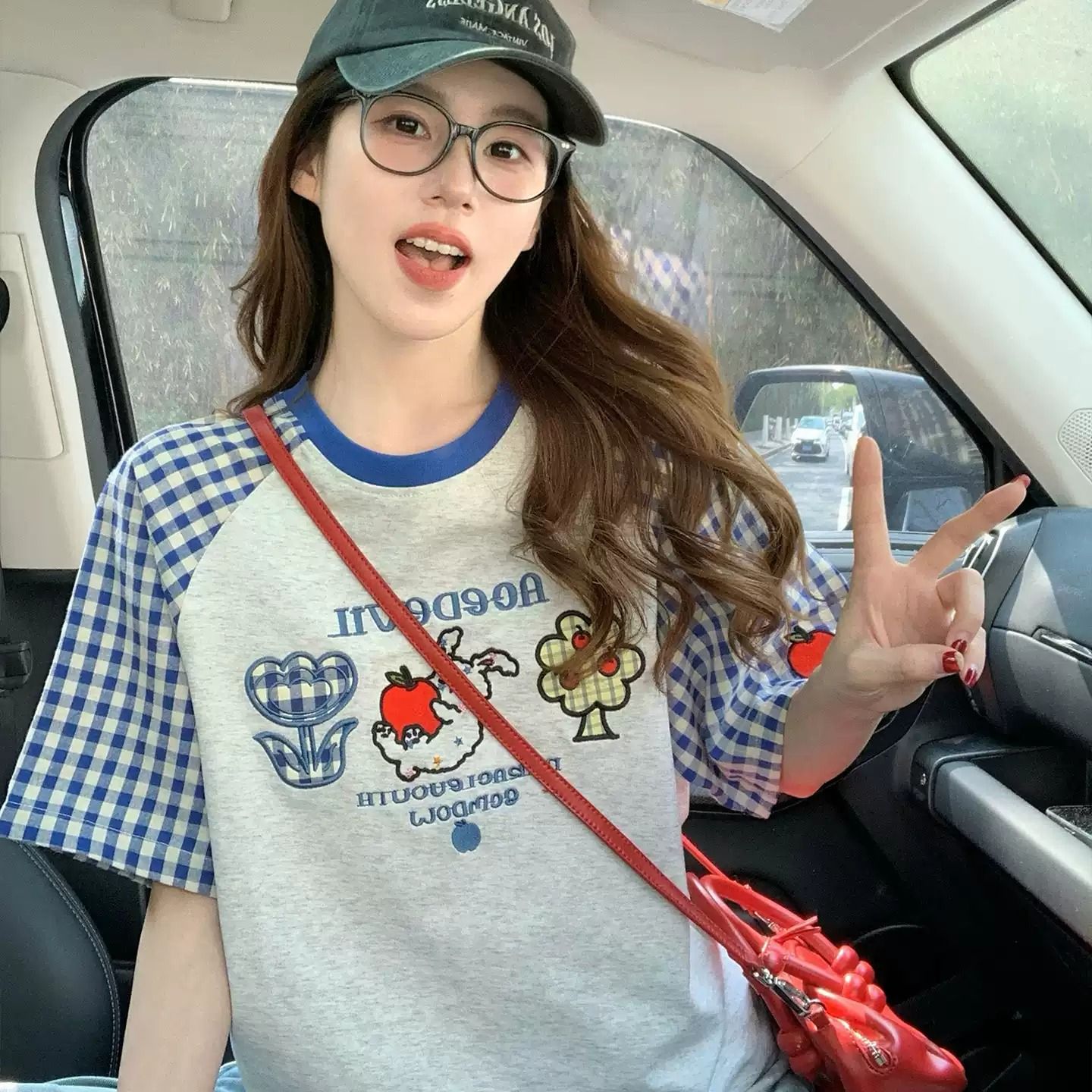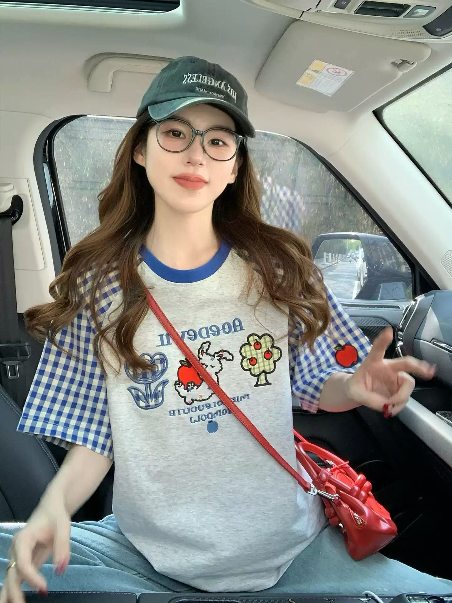 200그램 순면 이후 패키지 칼라 체크무늬 배색 삽입 어깨 반팔 티셔츠 여성 2026 여름 프린트 맨위