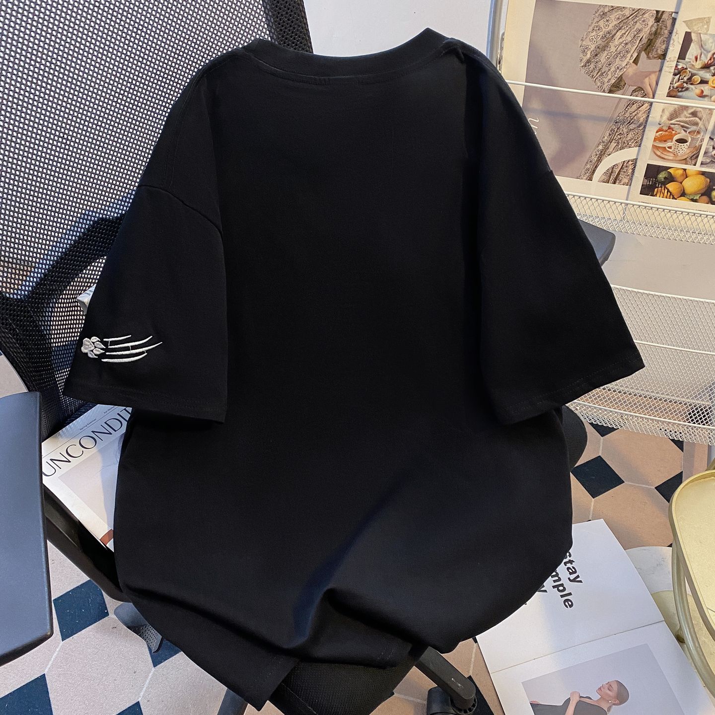 실사 더블 실 240 그램 순면 반팔 티셔츠 여성 여름 새로운 루즈핏 긍정적 인 어깨 만화 자수 라운드 넥 맨위
