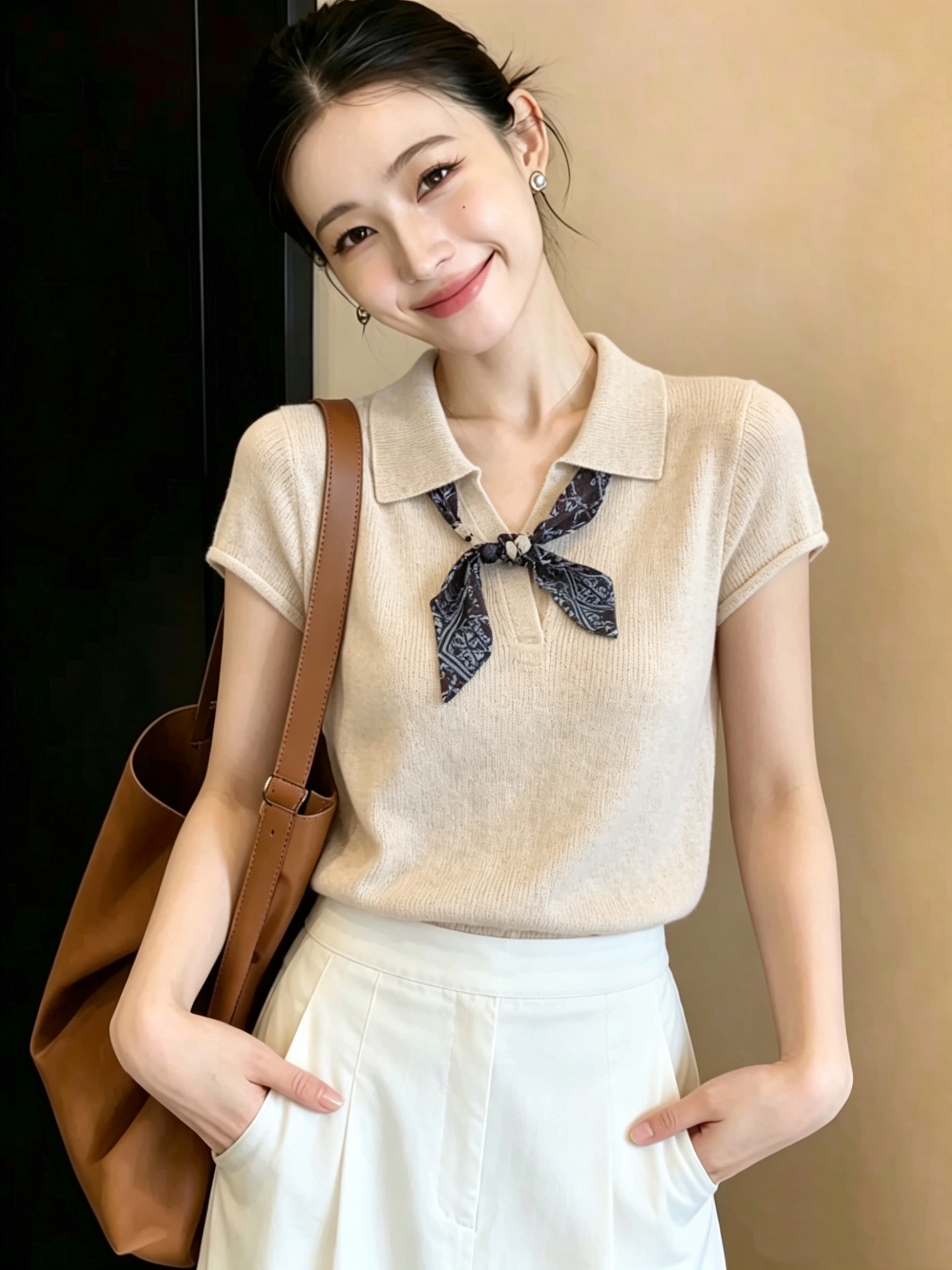 재고 있음 2026 여름 새로운 아마 오래된 돈 바람 레이스업 스카프 V넥 니트 반팔 여성 셔츠