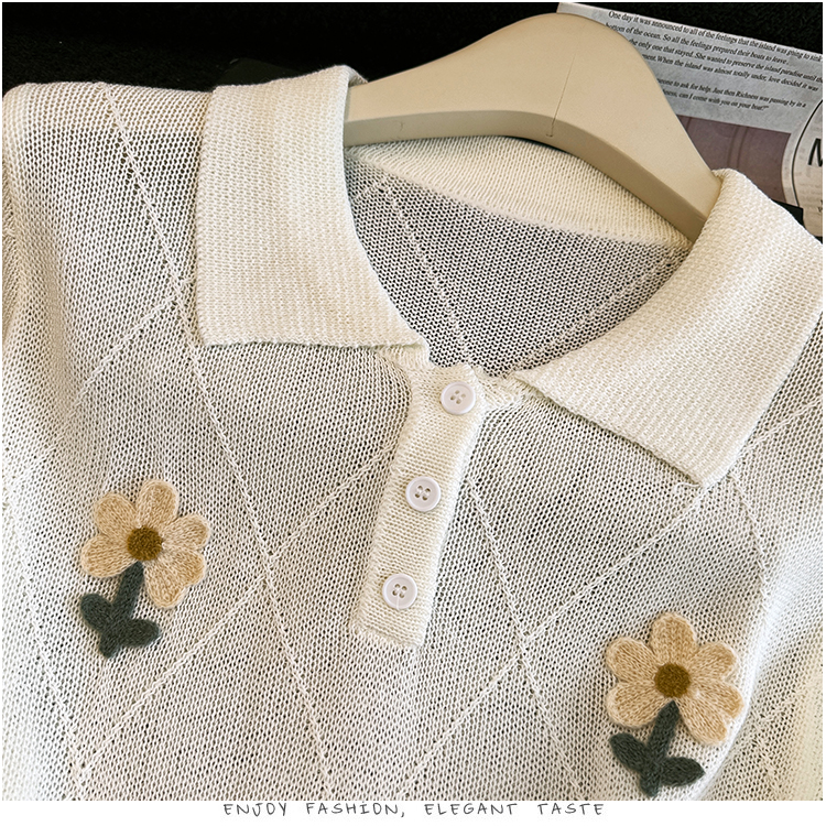 2026 여름 새로운 패션 반 개방 폴로 칼라 루즈핏 꽃 자수 얼음 실크 티셔츠 주간 실크 마 니트 스웨터 맨위 여성