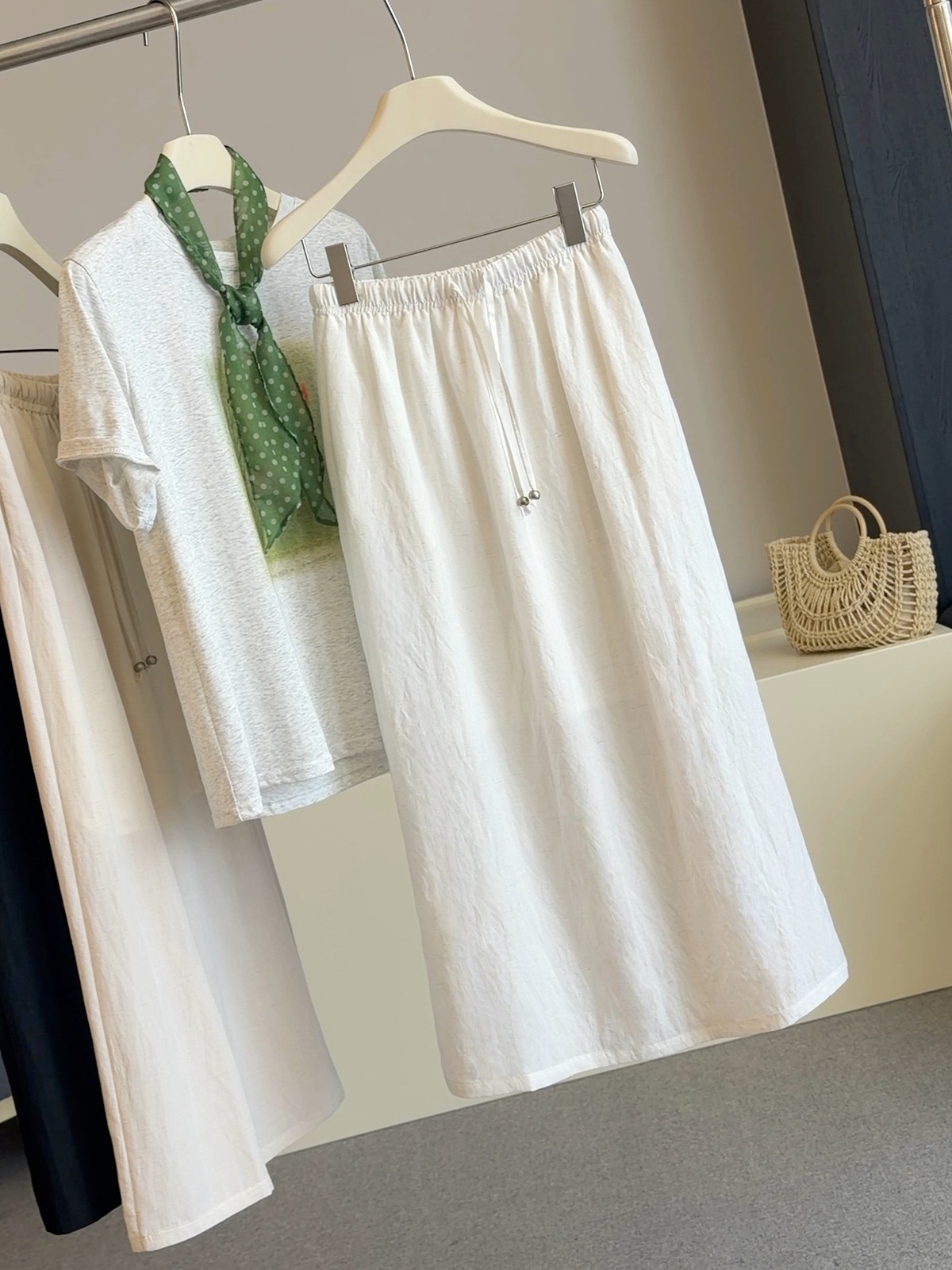 2026 여름 새로운 여성 한 부서 착용 가져 가라. 라운드 넥 다용도 반팔 맨위 품격 하이웨이스트 슬림해 보이는 한 마디 반신 스커트
