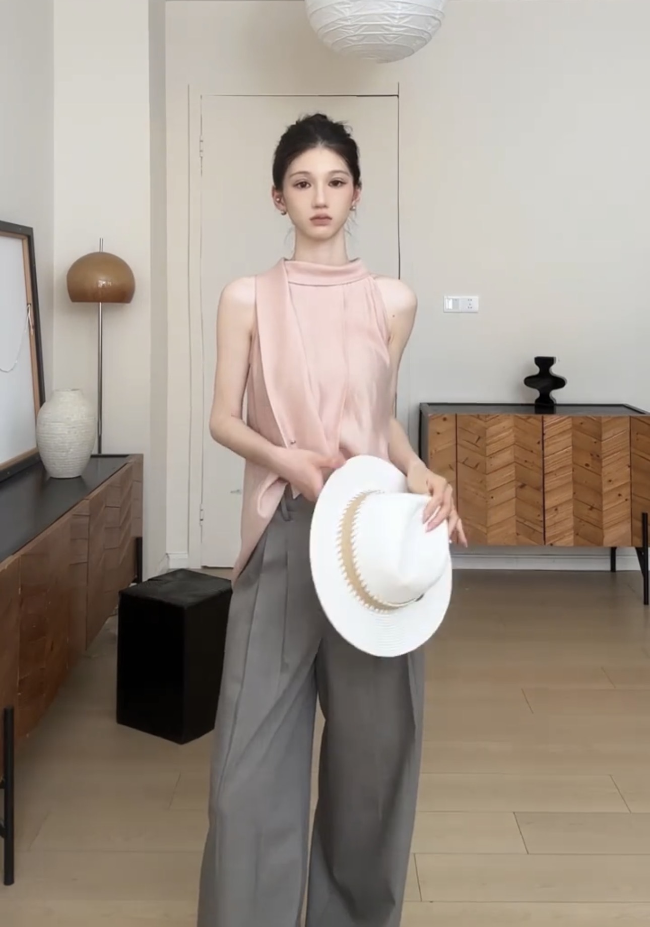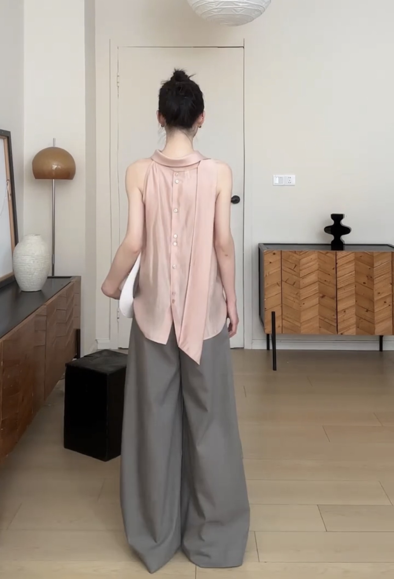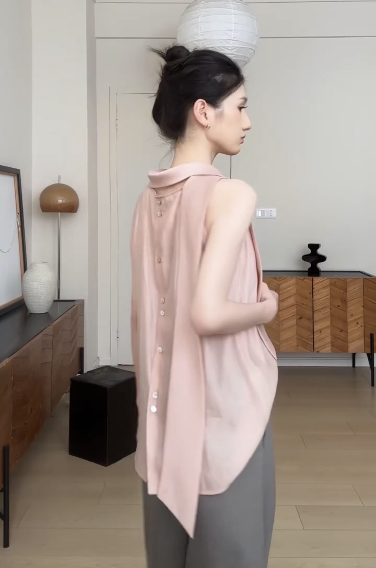 부드러운 빛 센스 질감 플리츠 단추 행침 목 리본 민소매 맨위