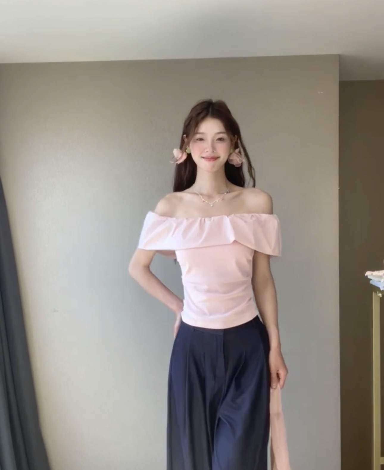 있음 선적 오프숄더 프릴 오프숄더 핑크색 주름 맨위