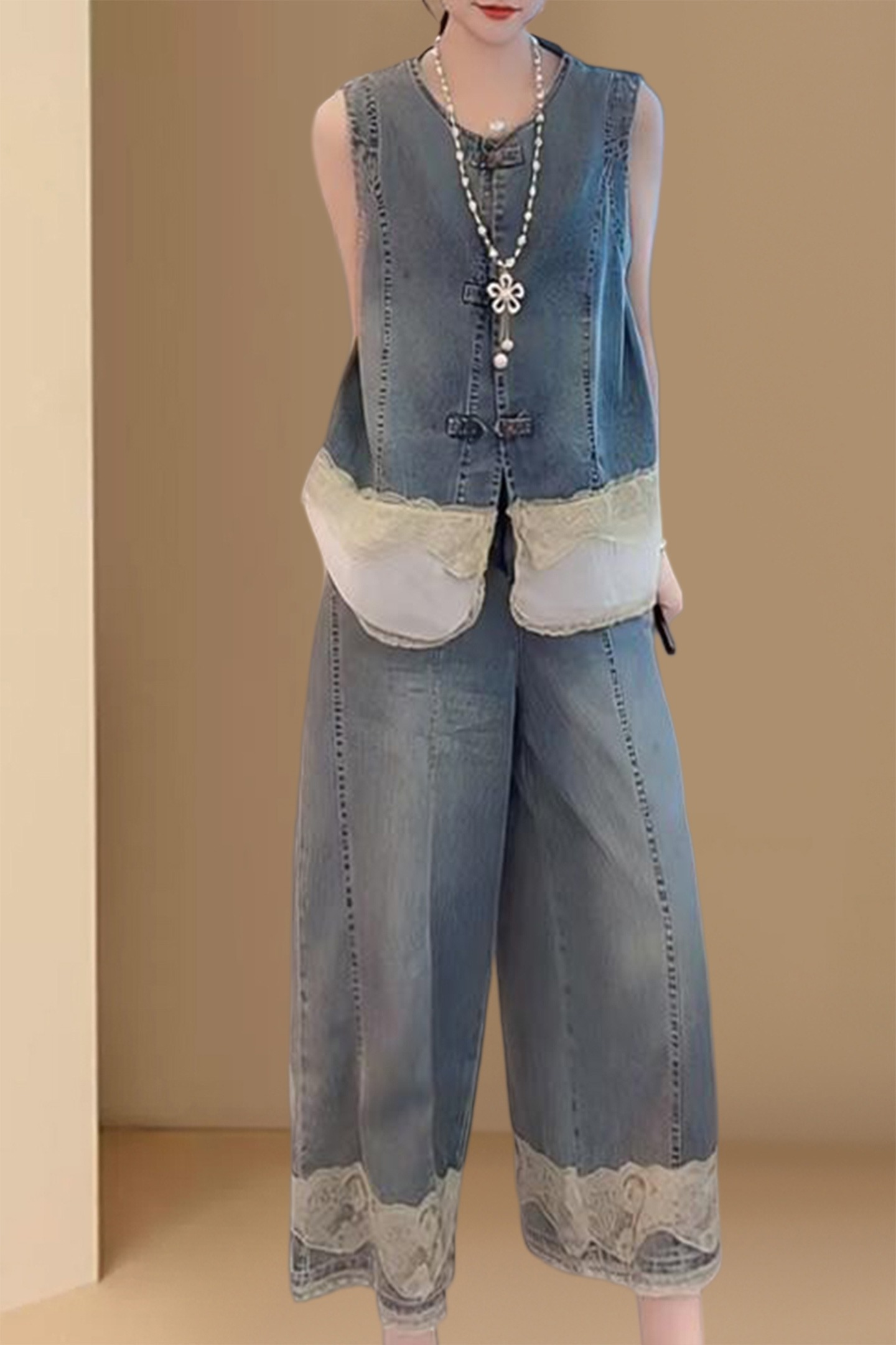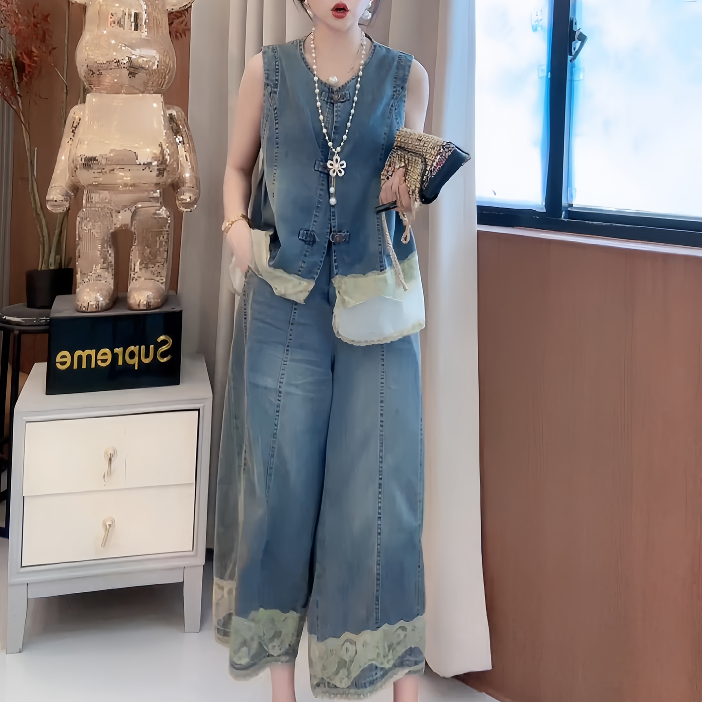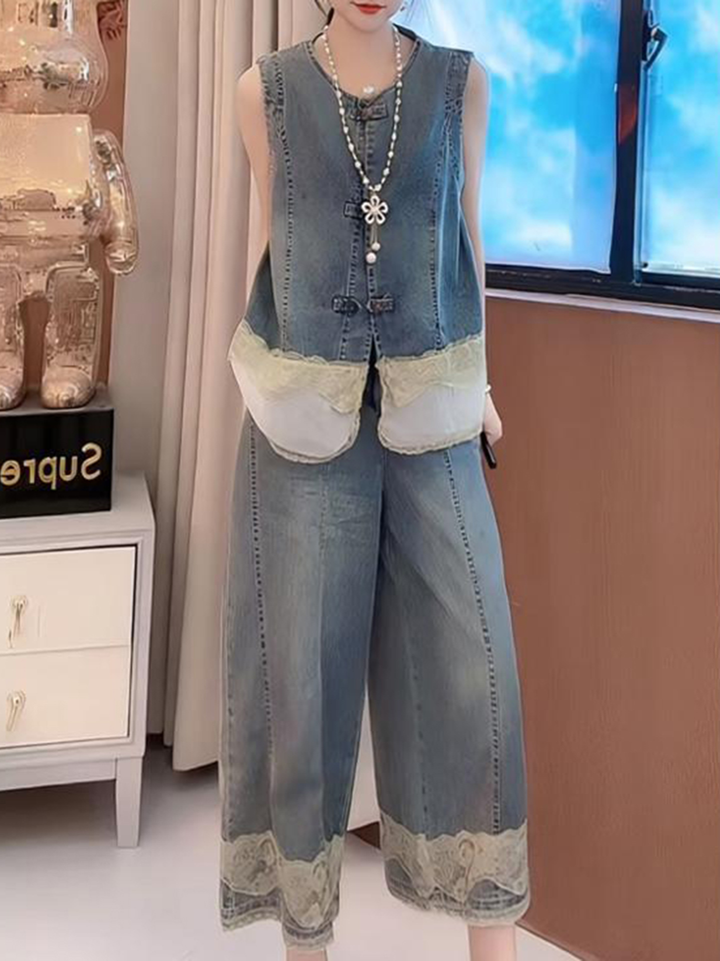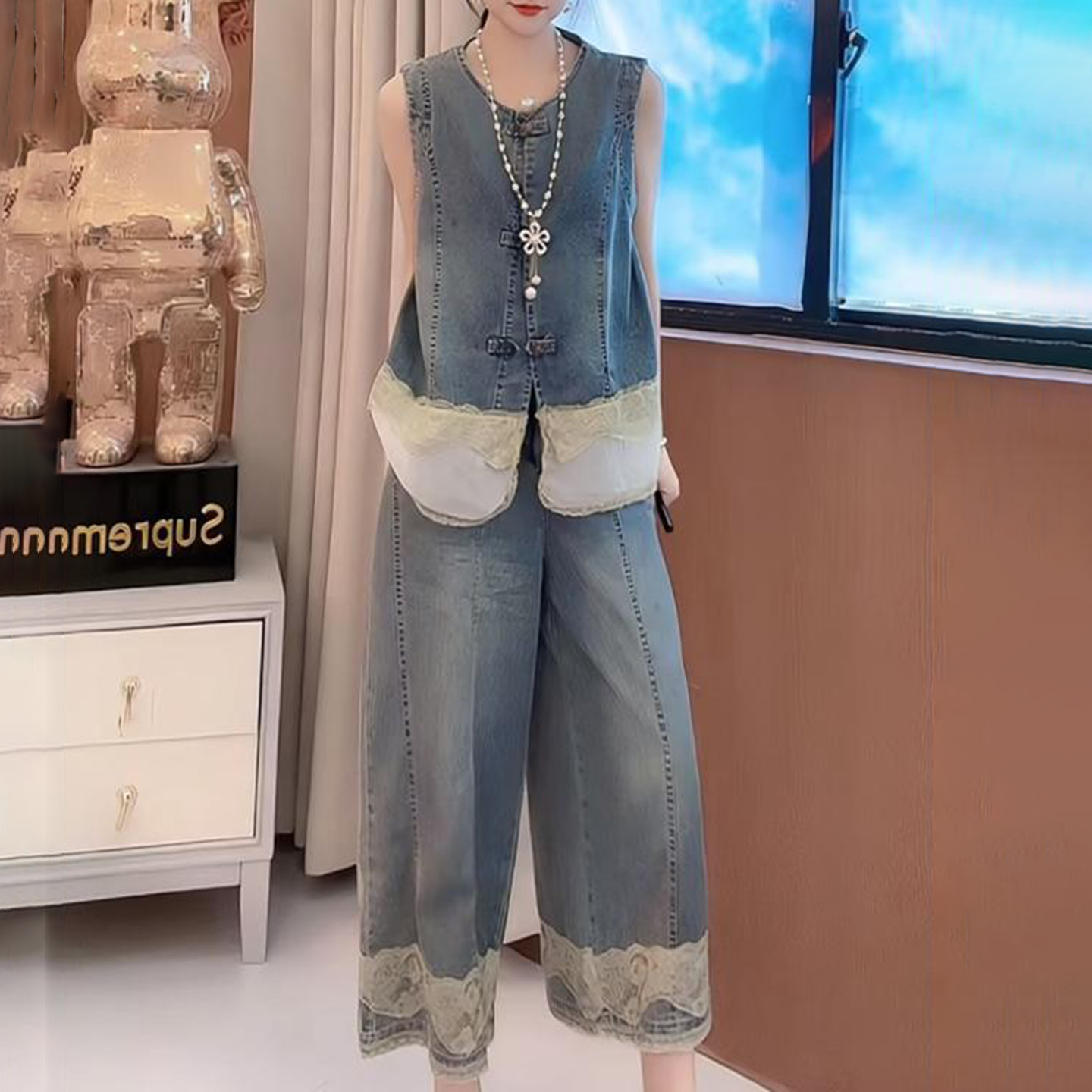 경관 그림 2026 여름 새로운 한국 스타일 패션 품격 패치워크 레이스 베스트 하이웨이스트 와이드 레그 팬츠 패션 세트