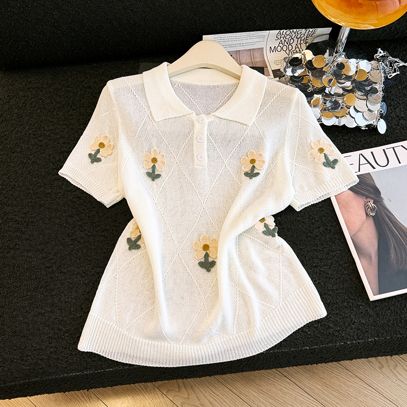 2026 여름 새로운 패션 반 개방 폴로 칼라 루즈핏 꽃 자수 얼음 실크 티셔츠 주간 실크 마 니트 스웨터 맨위 여성