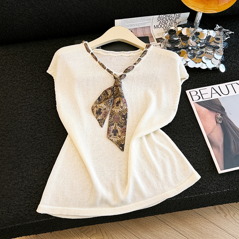 오래된 돈 바람 2026 여름 새로운 디자인 센스 스카프 V넥 항공기 소매 얼음 실크 티셔츠 주간 실크 아마 니트 스웨터 여성