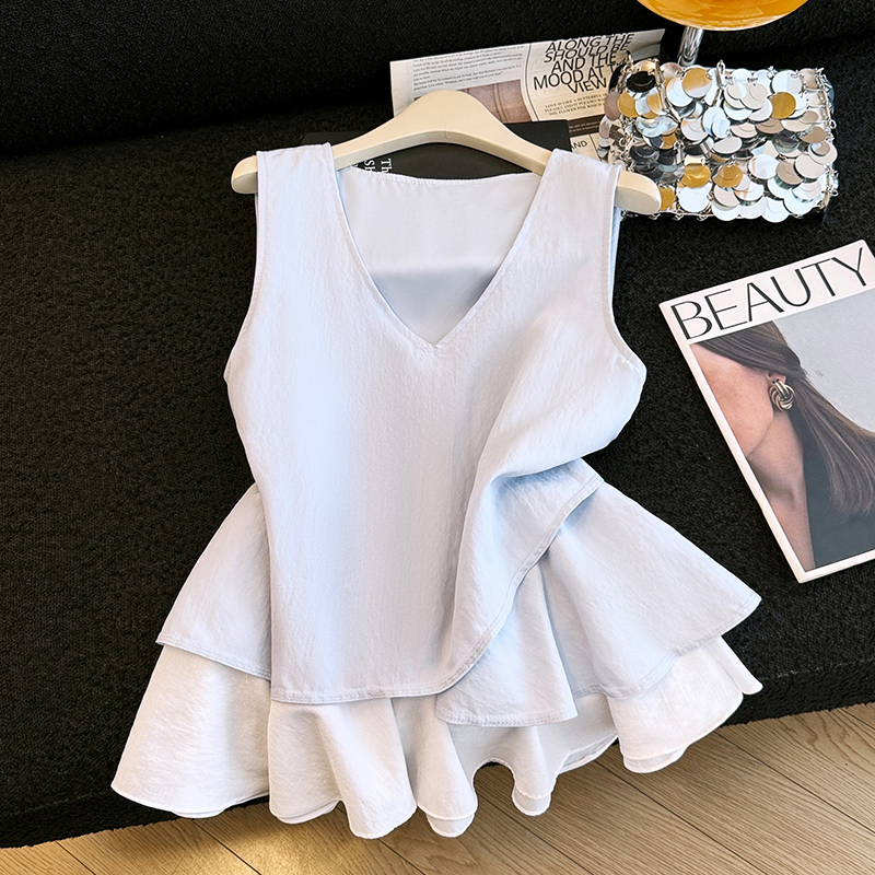 2026 여름 새로운 디자인 센스 프랑스식 V넥 패치워크 불규칙 프릴 플러스 두 조각 민소매 인형 셔츠 여성
