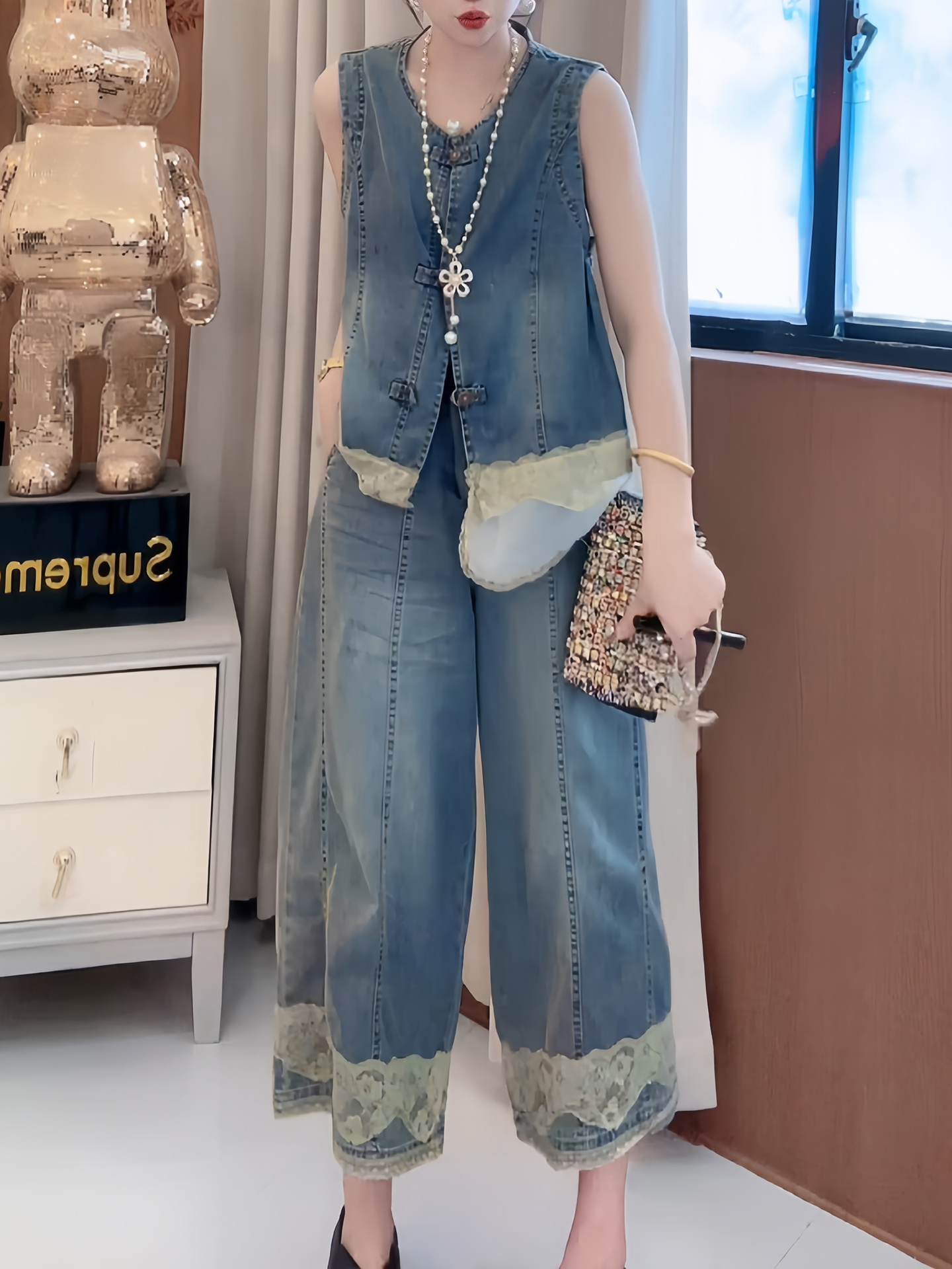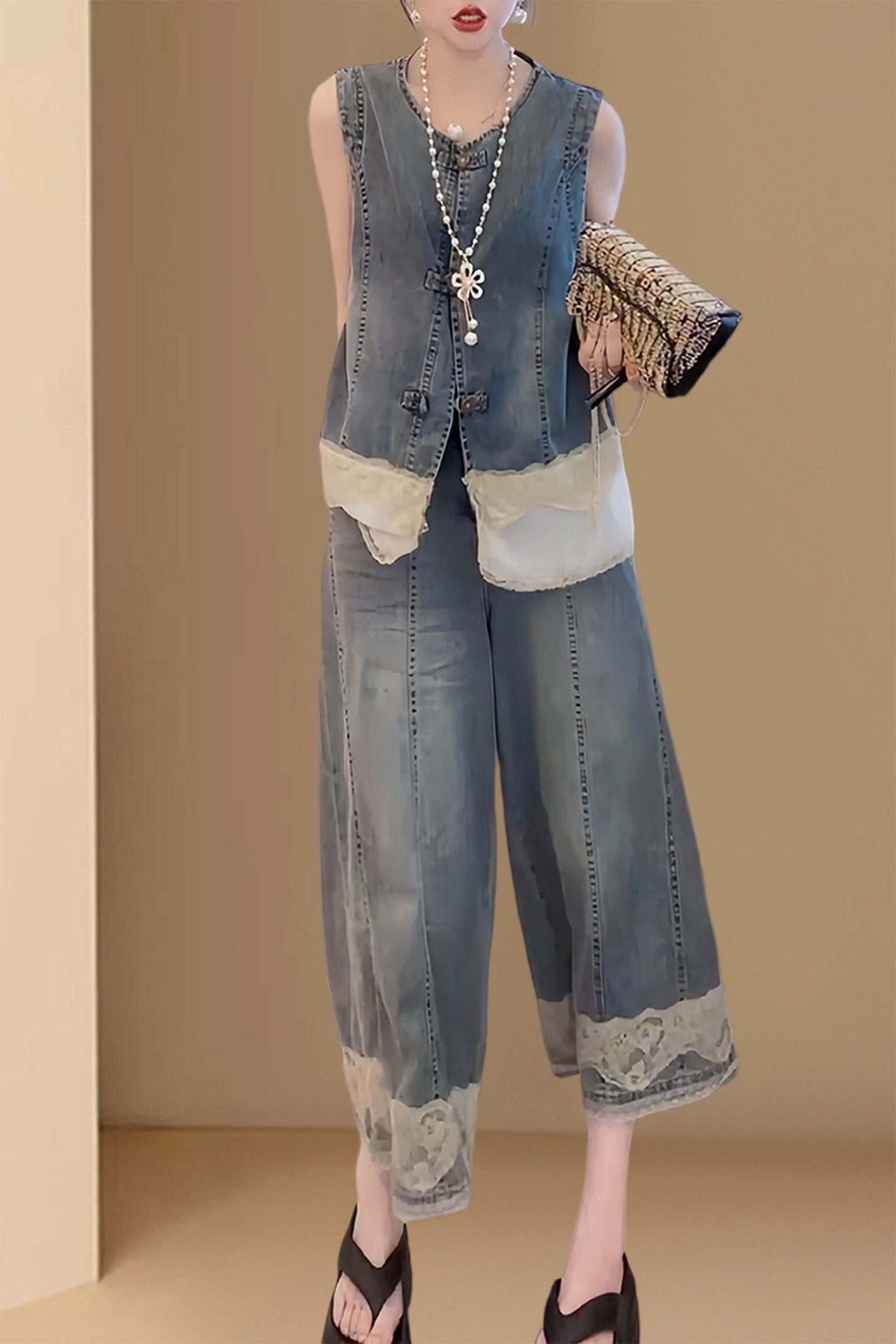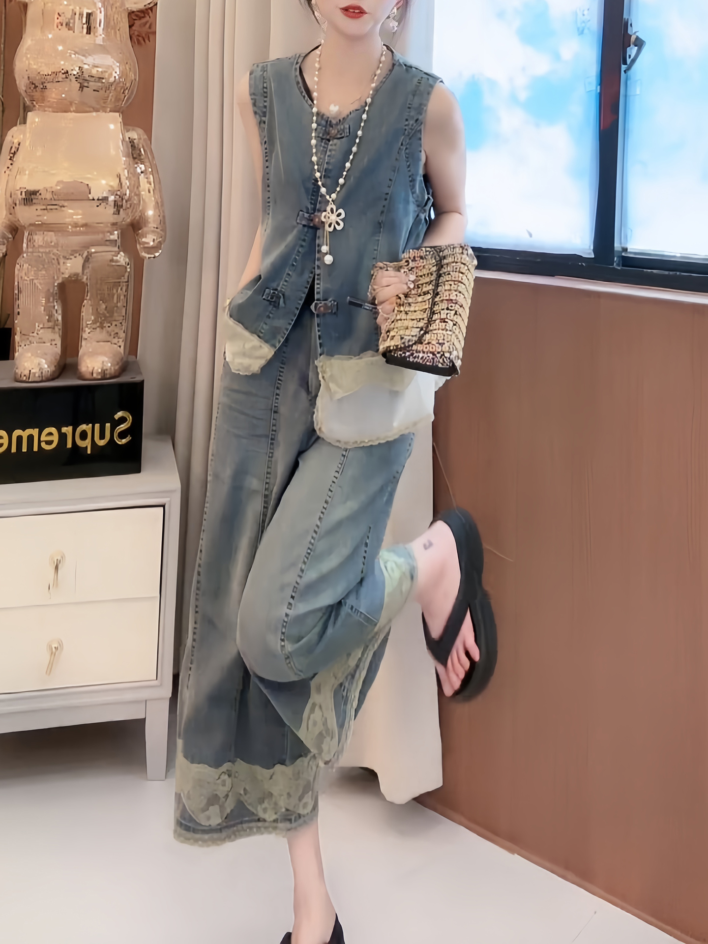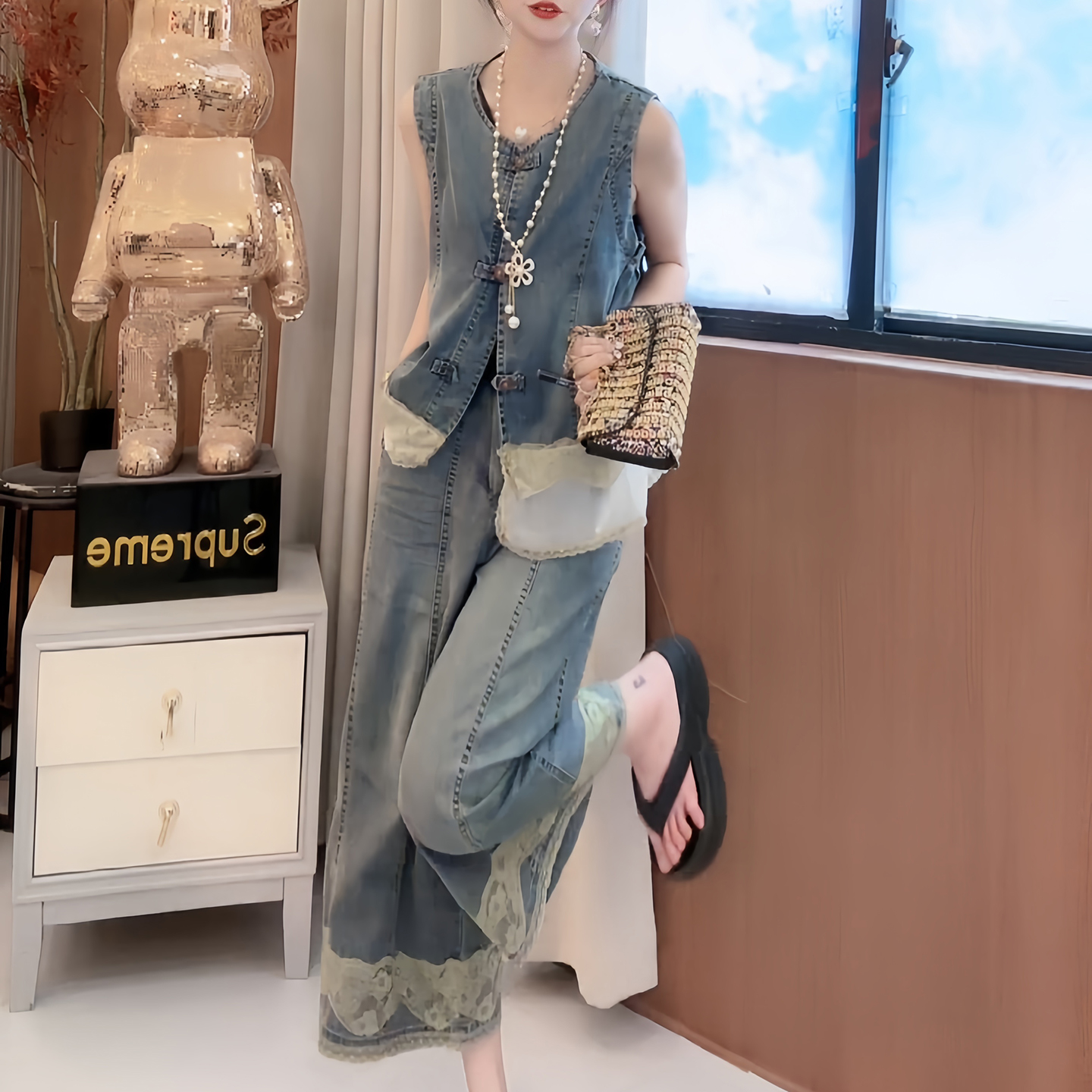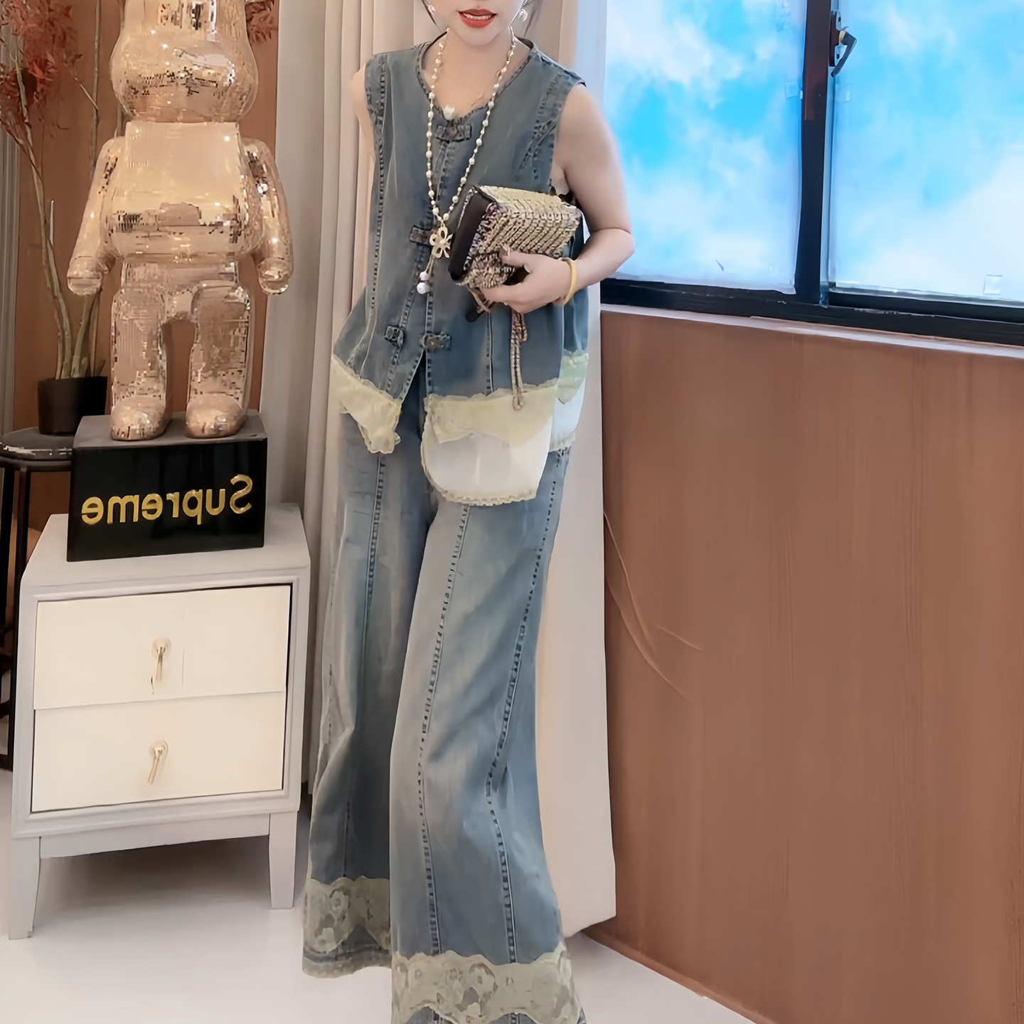 경관 그림 2026 여름 새로운 한국 스타일 패션 품격 패치워크 레이스 베스트 하이웨이스트 와이드 레그 팬츠 패션 세트