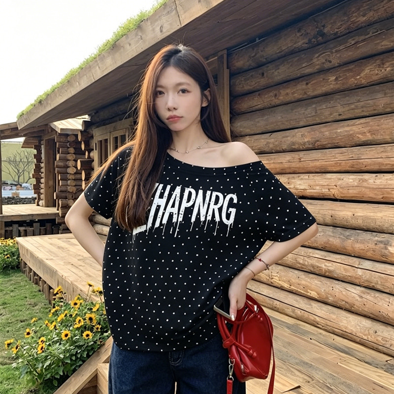 아메리칸 레트로 긍정적 인 어깨 도트 무늬 프린트 반팔 티셔츠