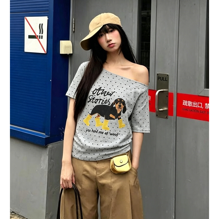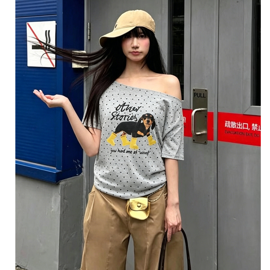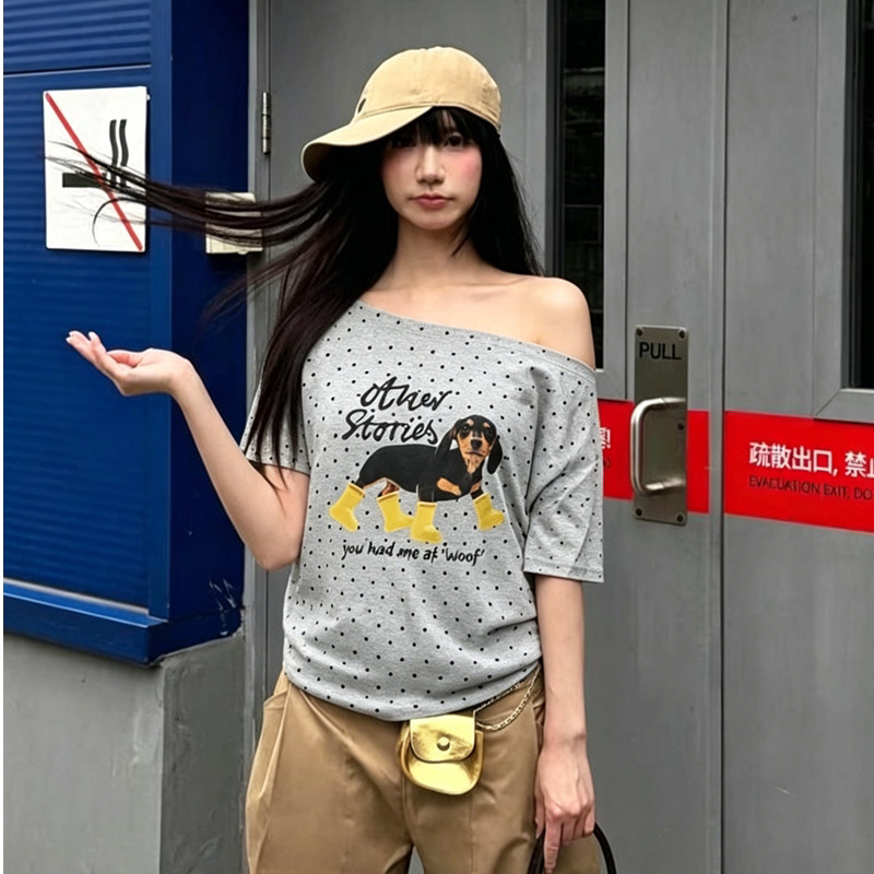 아메리칸 레트로 긍정적 인 어깨 도트 무늬 프린트 반팔 티셔츠