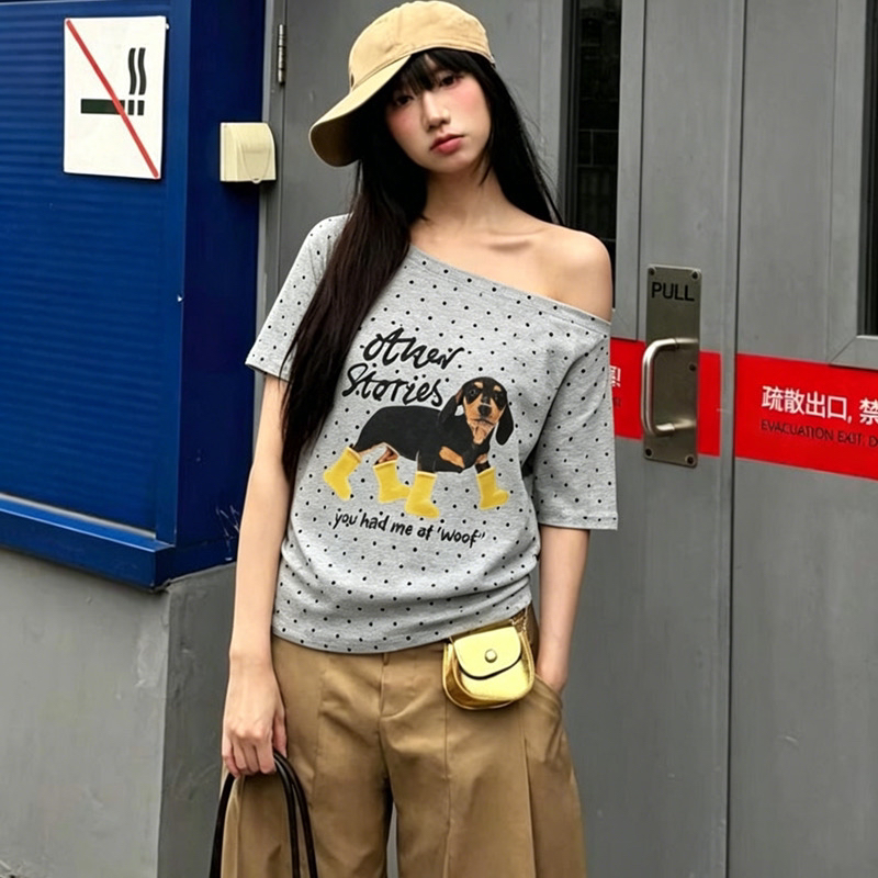 여름 새로운 한 부서 도트 무늬 비스듬한 칼라 오프숄더 프린트 섹션 반팔 티셔츠