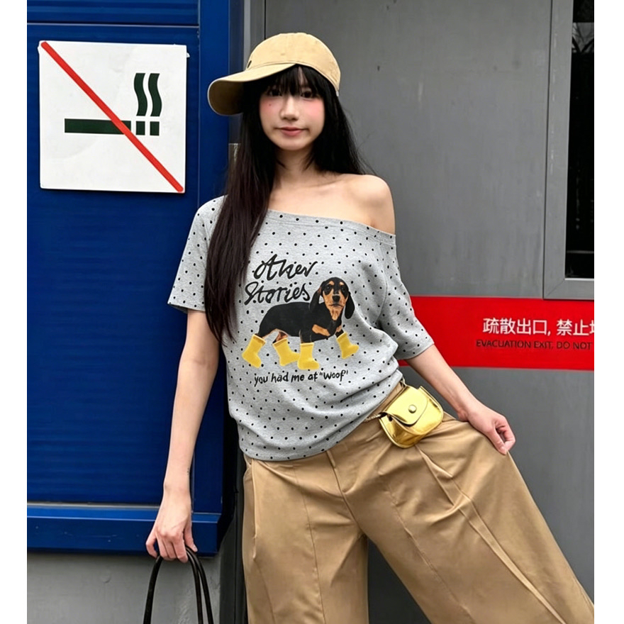 아메리칸 핫걸 알파벳 프린트 비스듬한 어깨 보트넥 반팔 티셔츠 여성 주름 허리 수축 슬림해 보이는 오프숄더 쇼트 스타일 맨위