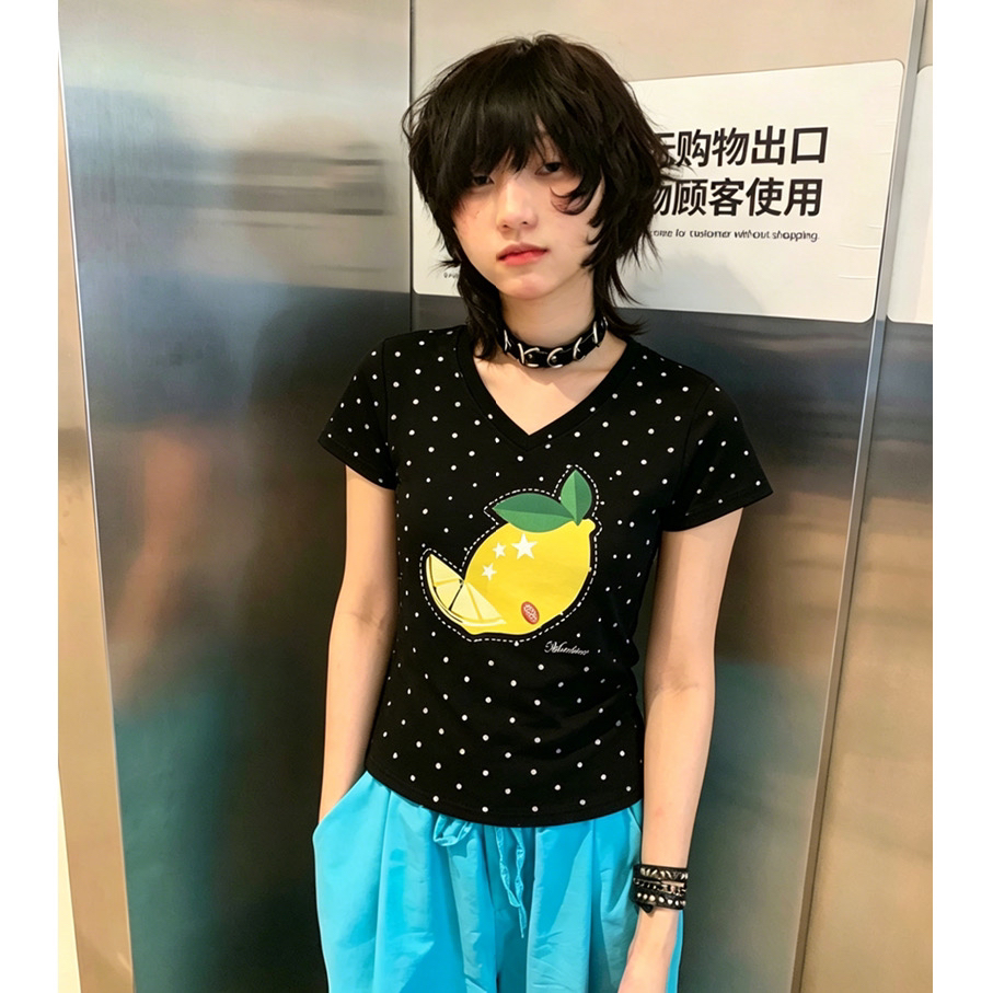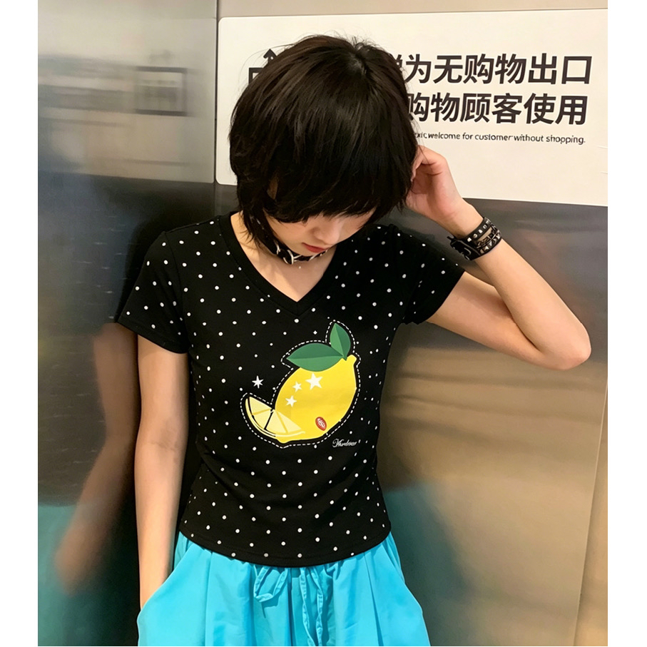 여름 새로운 한 부서 V넥 도트 무늬 패션 긍정적 인 어깨 프린트 섹션 반팔 티셔츠