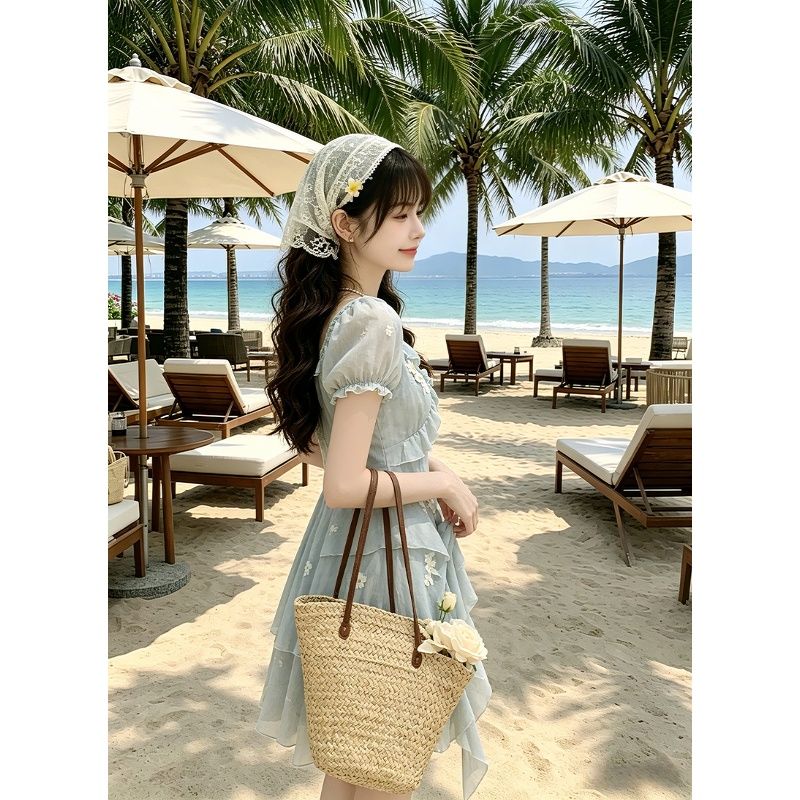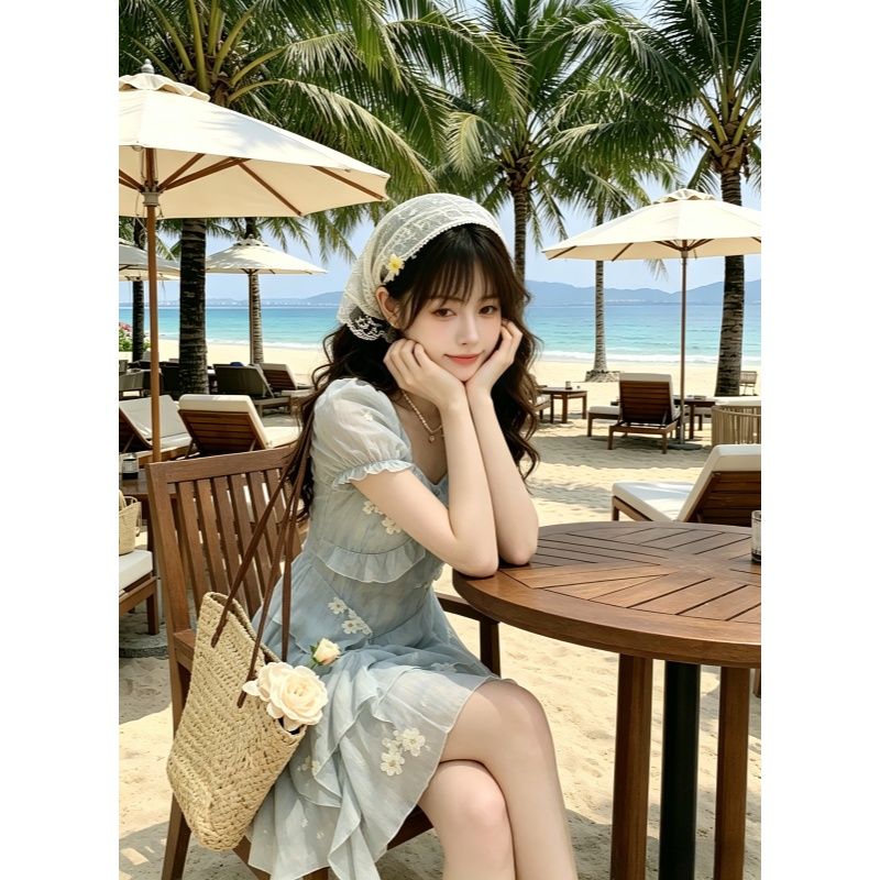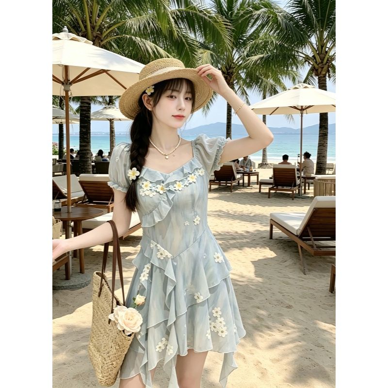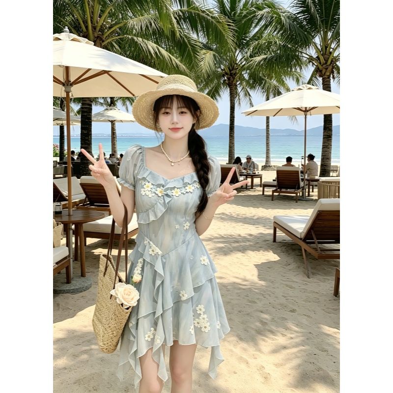 해변가 삼아 휴가 바람 드레스 여름 새로운 달콤함 작은 청신 디자인 센스 불규칙 꽃무늬 짧은 치마