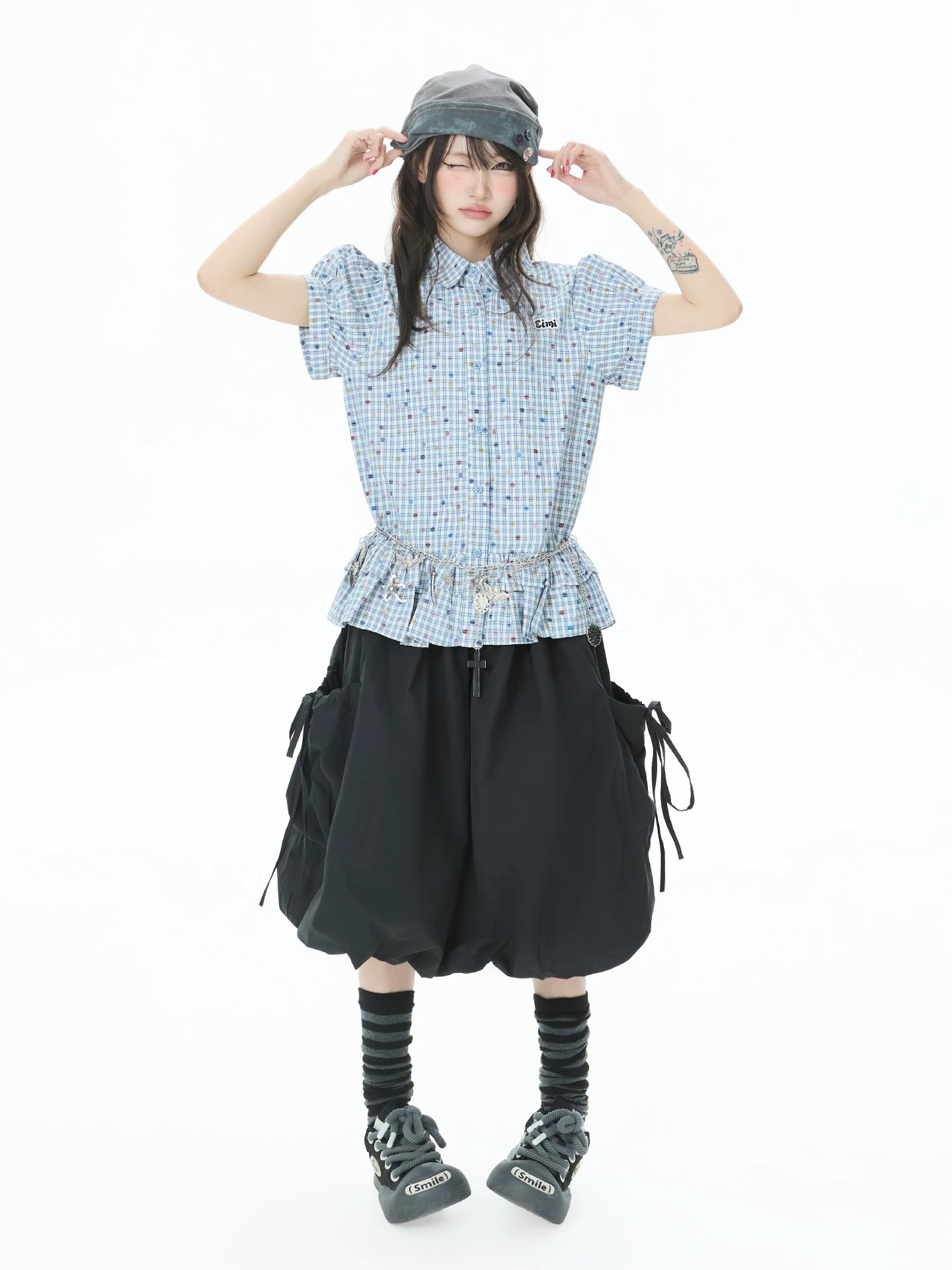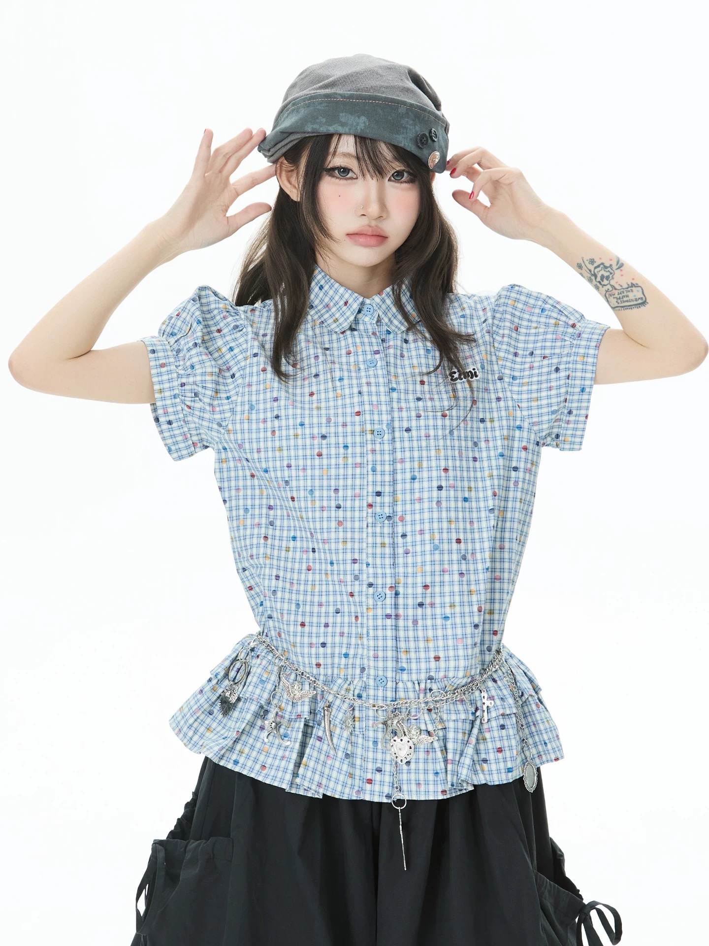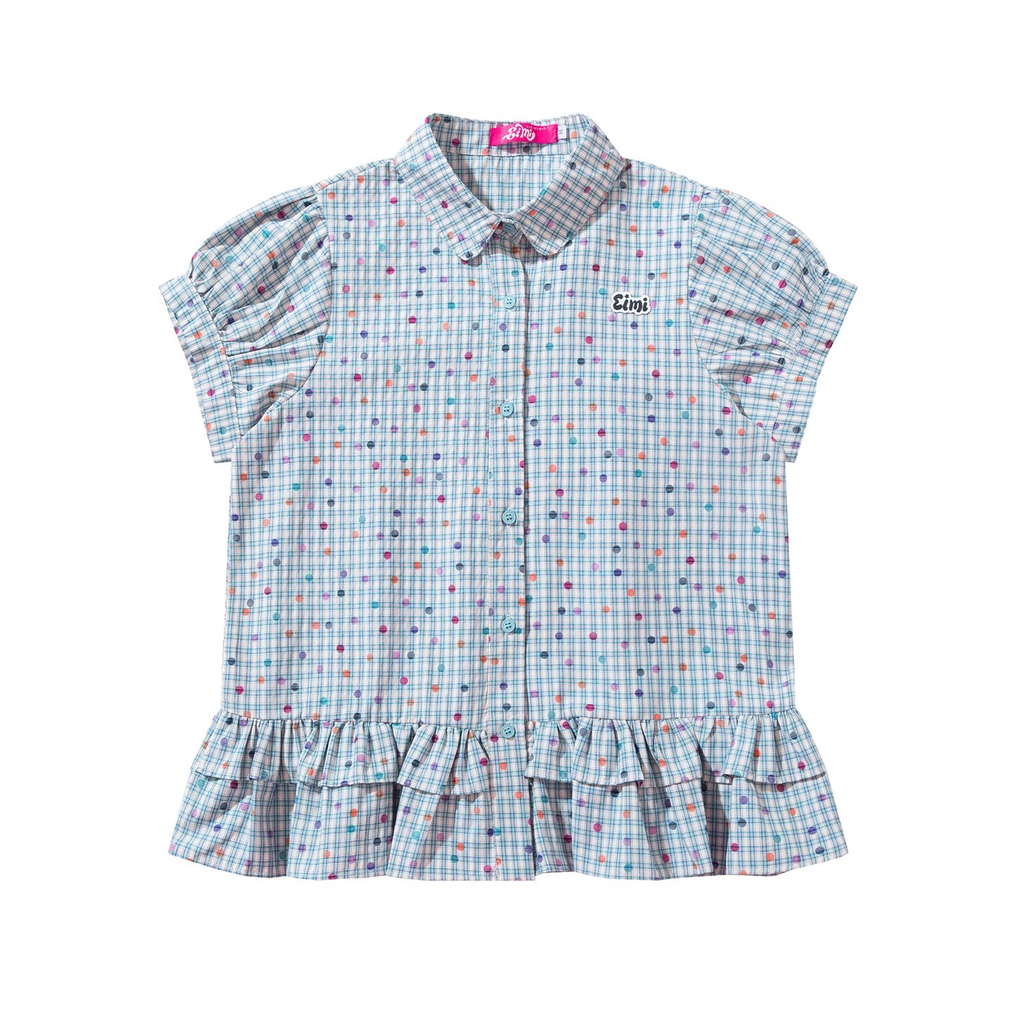 한 부서 색상 도트 무늬 체크무늬 여성 셔츠 여름 2026 새로운 학원 스타일 거품 소매 디자인 인형 셔츠