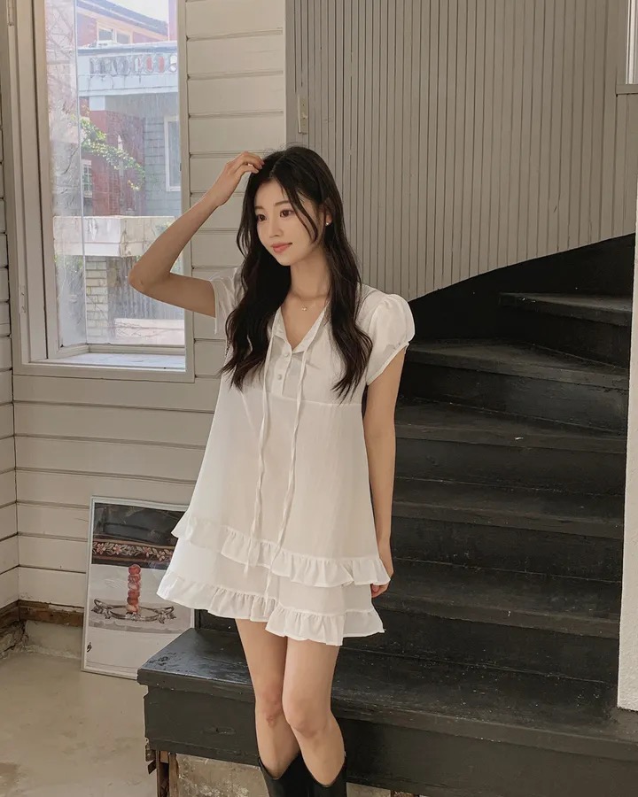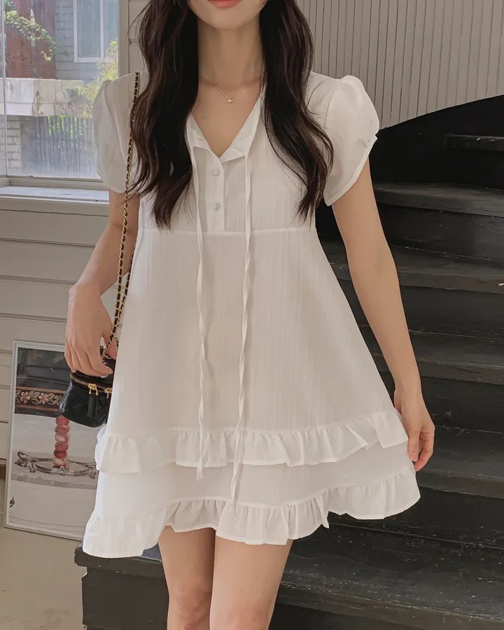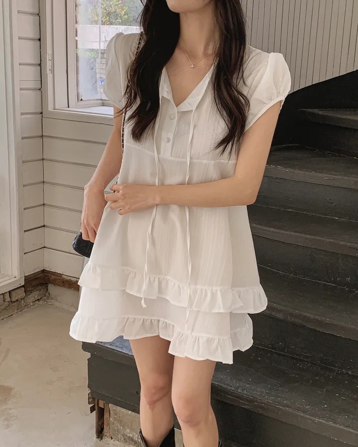 재고 있음 원본 chic 한 부서 여름 부드러운 달콤함 이중층 프릴 레이스업 드레스