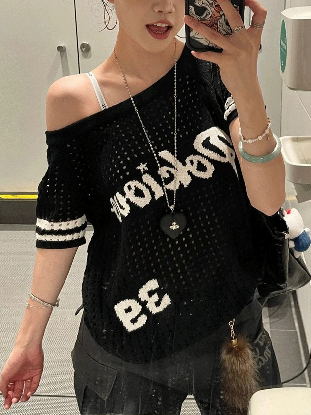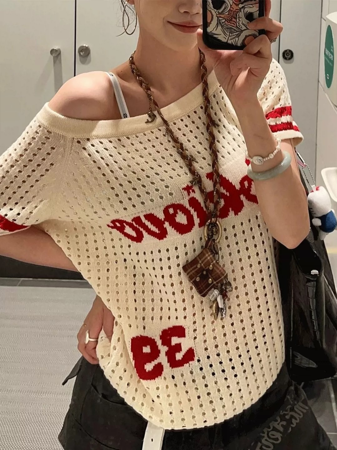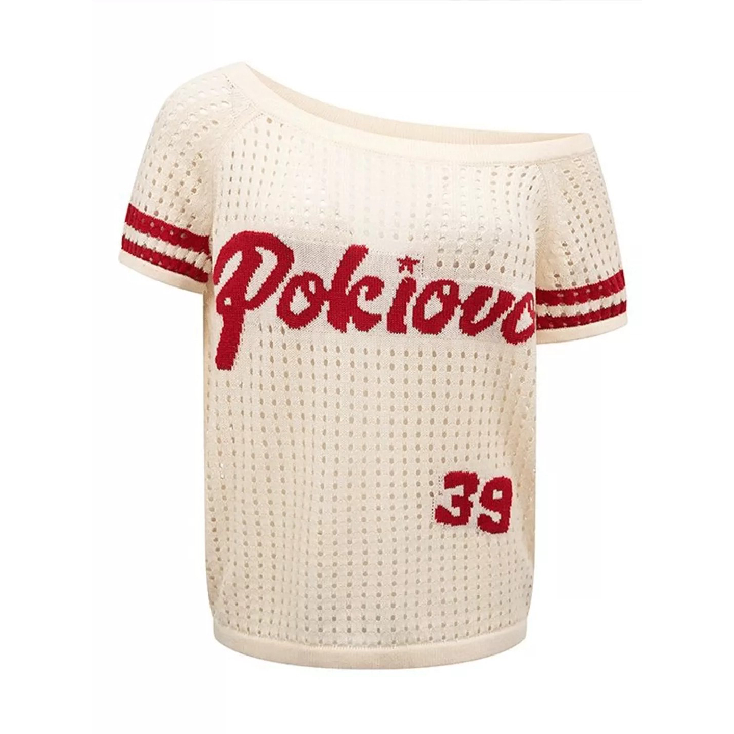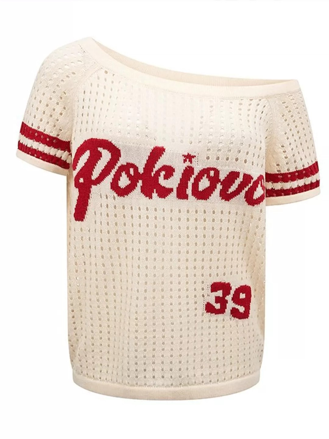 아메리칸 레트로 홀로우 아웃 비스듬한 어깨 반팔 티셔츠 여성 여름 새로운 핫걸 느긋한 바람 루즈핏 슬림해 보이는 알파벳 맨위