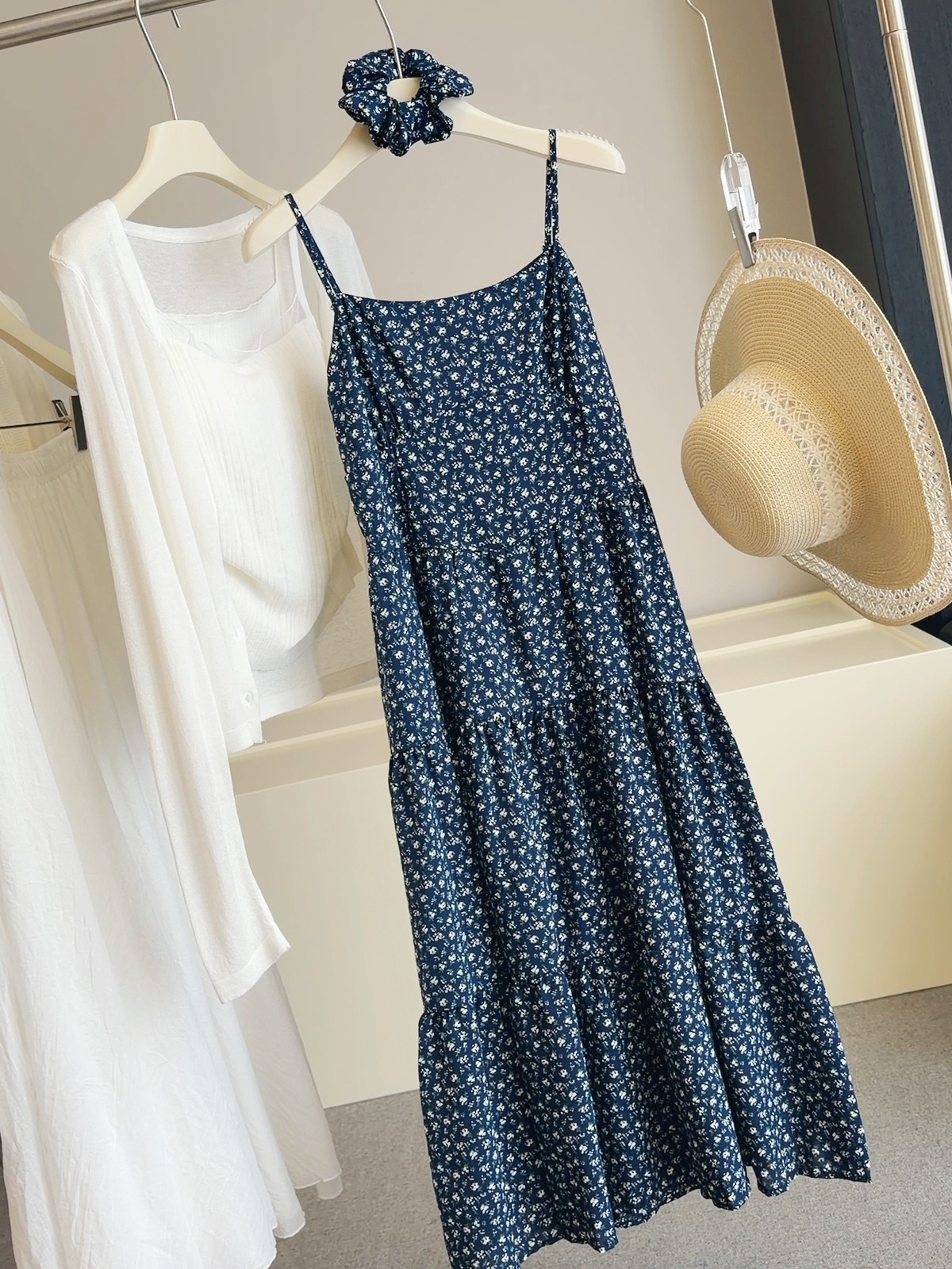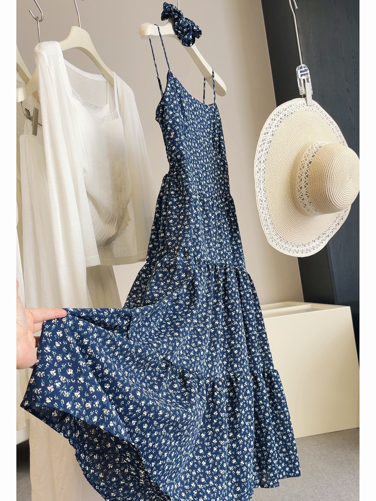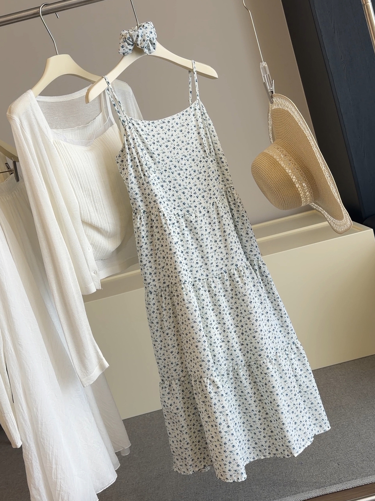 해군 꽃무늬 슬립 여성 드레스 여름 해변가 휴가 부드러운 바람 패션 다용도 슬림해 보이는 롱 코트 케이크 드레스