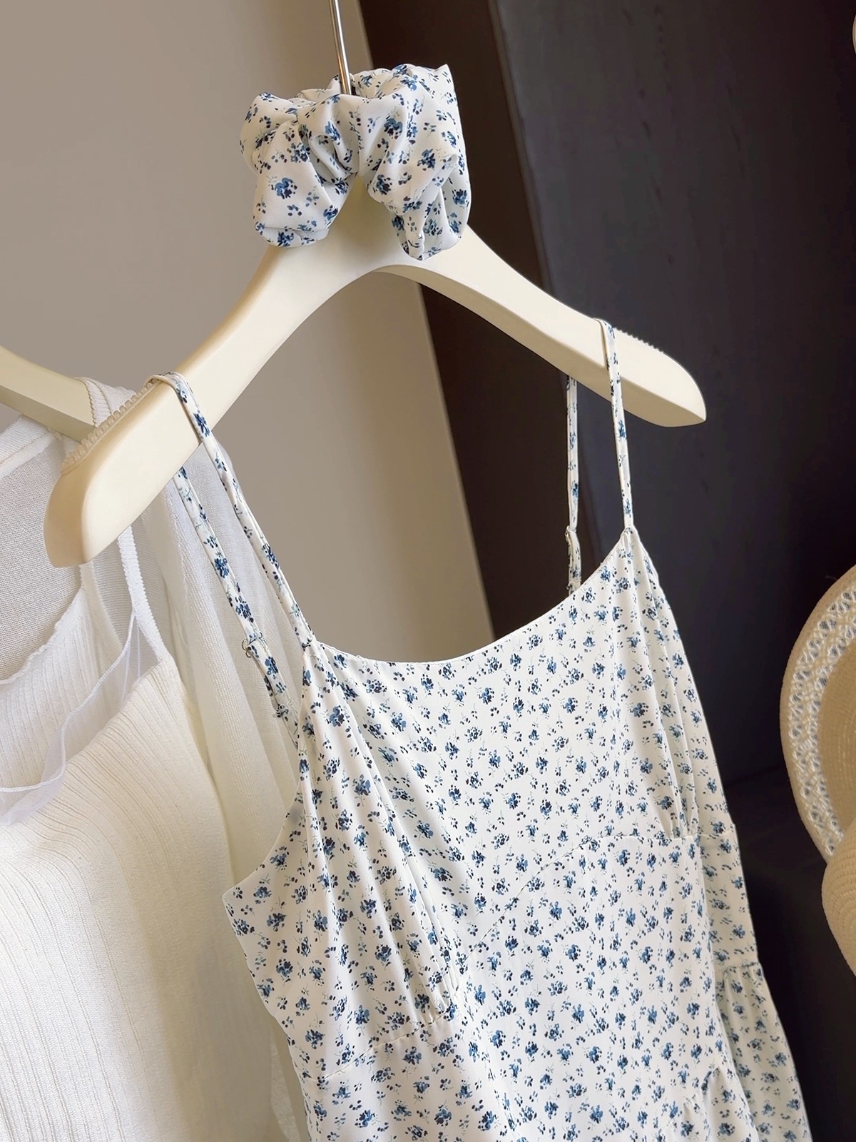 파란색 꽃무늬 캐미솔 여름 새로운 한 부서 작은 대중 디자인 센스 연령 감소 작은 셔츠 민소매 쇼트 스타일 맨위