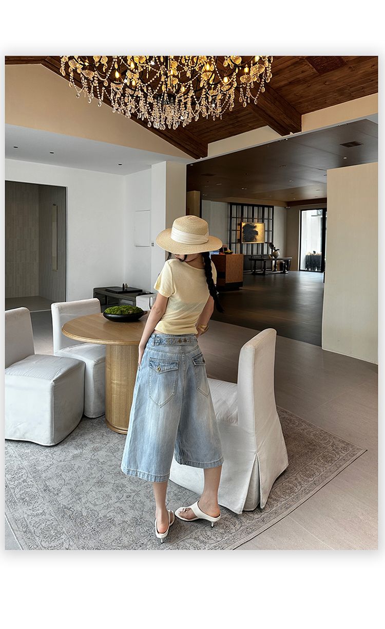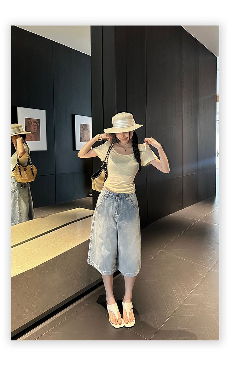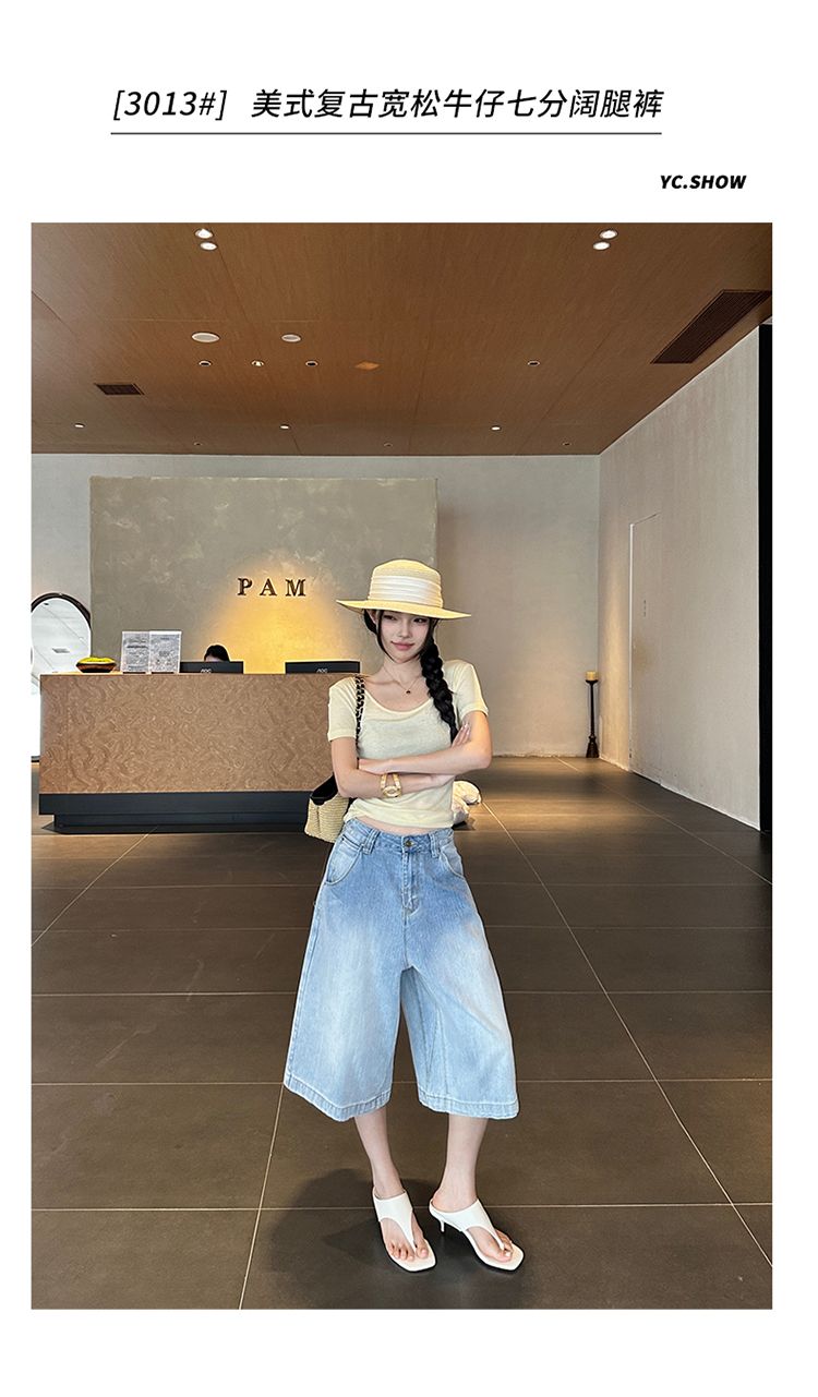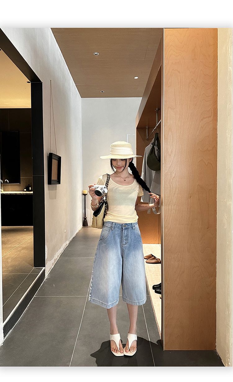 아메리칸 레트로 루즈핏 느슨함 센스 넓은 다리 5 점 청바지 여성