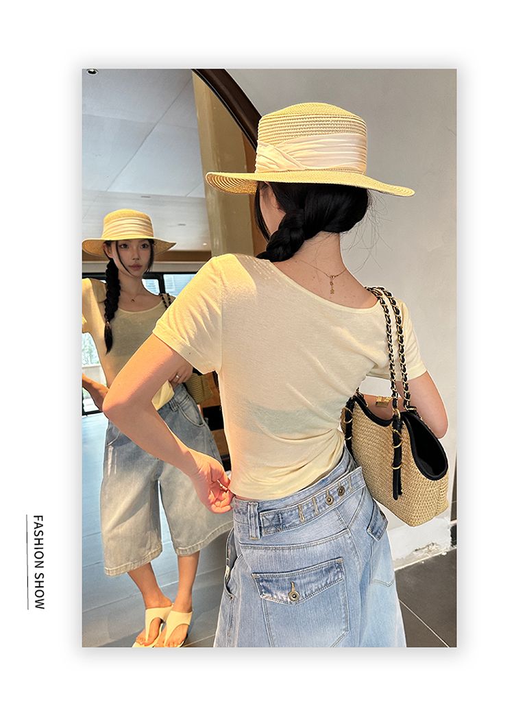디자인 센스 허리 수축 슬림해 보이는 화이트 반팔 티셔츠 여성 인터넷 유명인 Chic 고유 한 프린트 긍정적 인 어깨 의류