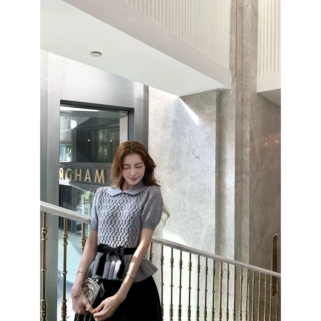 작은 키 회색 페이크 레이어드 슬립 니트 몸매 가꾸기 쇼트 스타일 맨위 여성 여름 긍정적 인 어깨 반팔 티셔츠 얇은