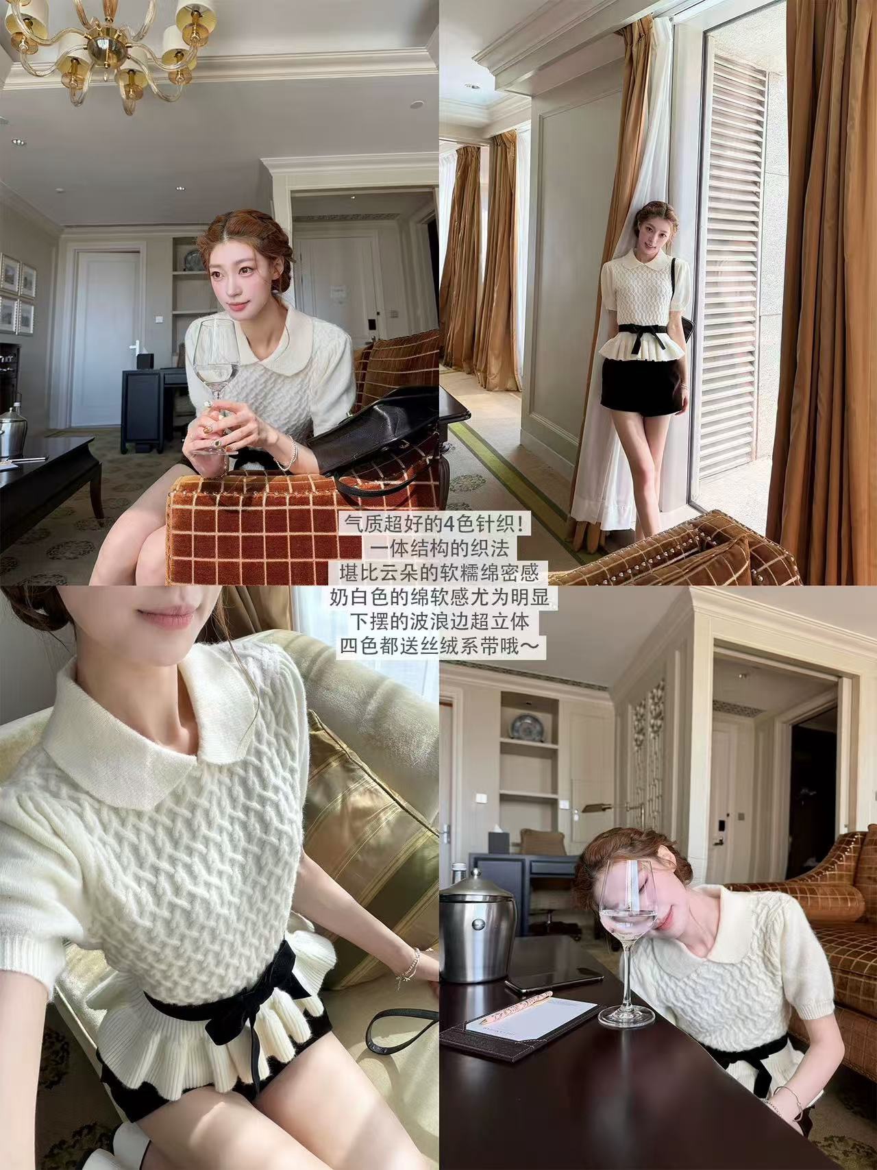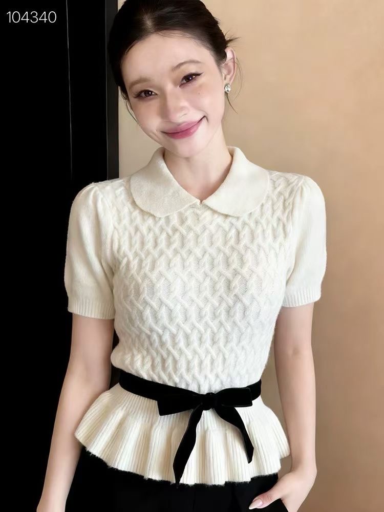 오래된 돈 바람 스카프 홀로우 아웃 라운드 넥 반팔 니트 스웨터 여성 여름 새로운 슬림해 보이는 다용도 캐주얼 잘 생긴 맨위 t
