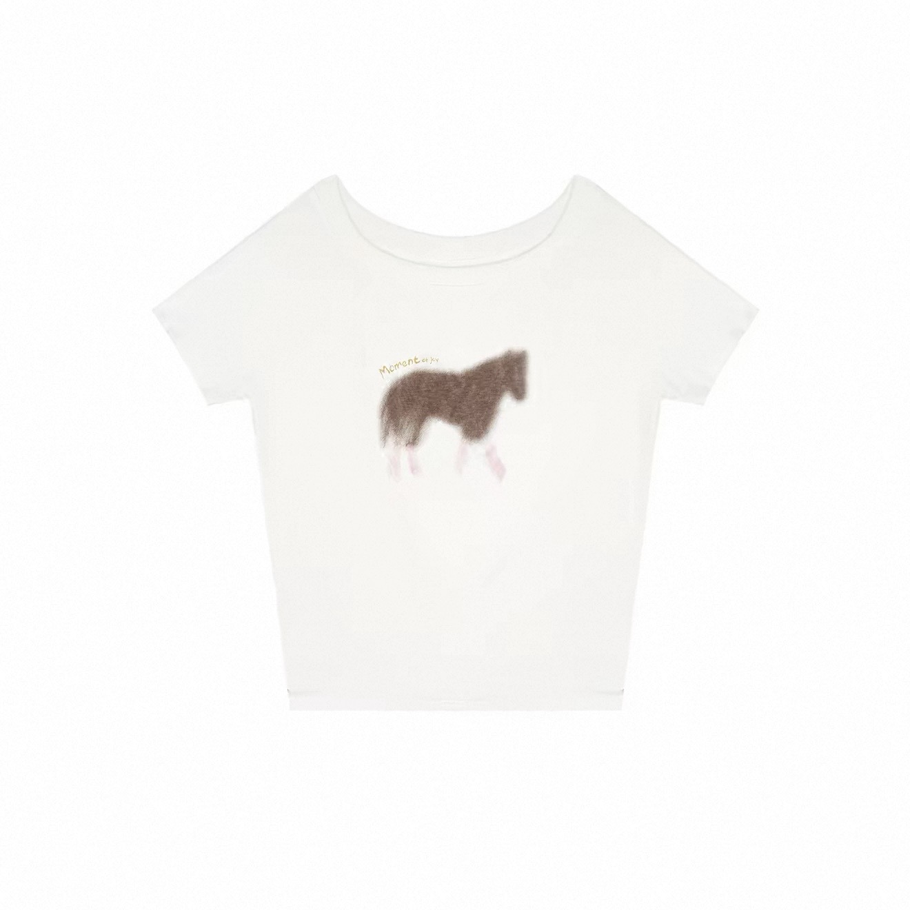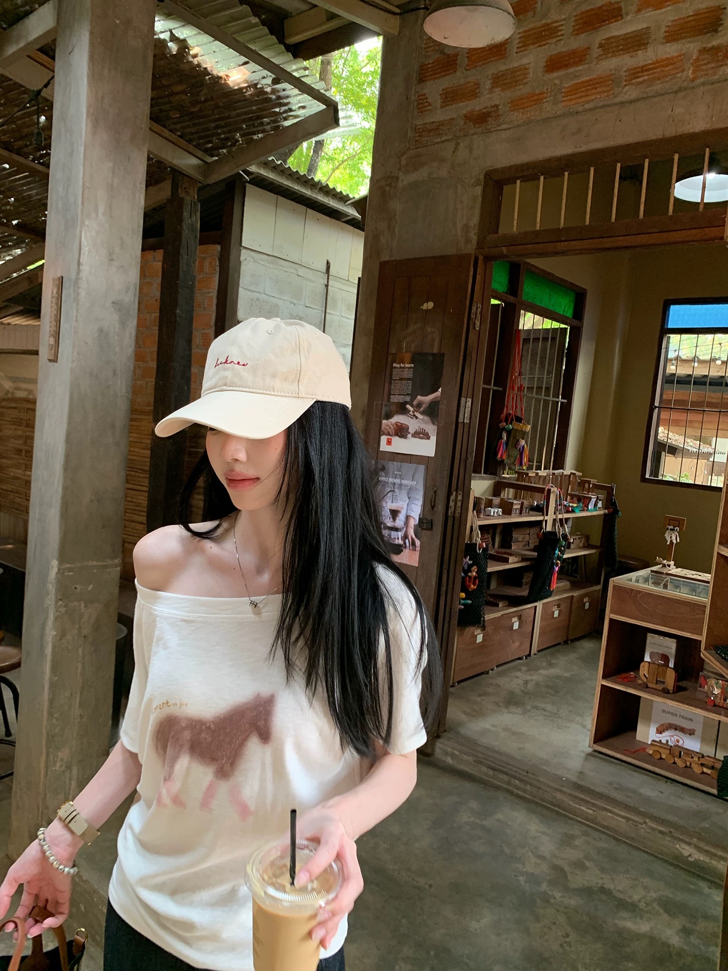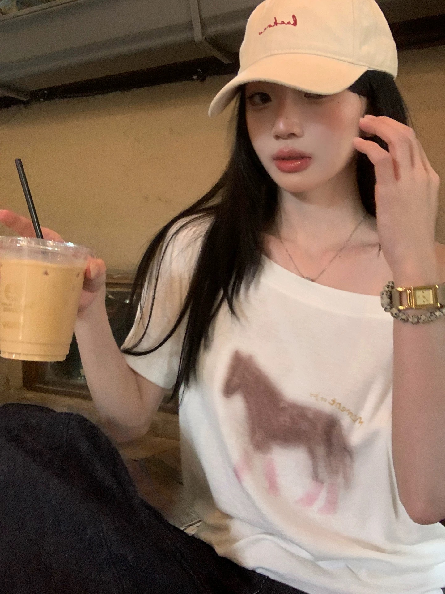 joeyjoy 와인 하나 직접 만든 한 부서 작은 말 프린트 티셔츠 자외선 차단 블라우스 여성 여름 느긋한 오프숄더 맨위