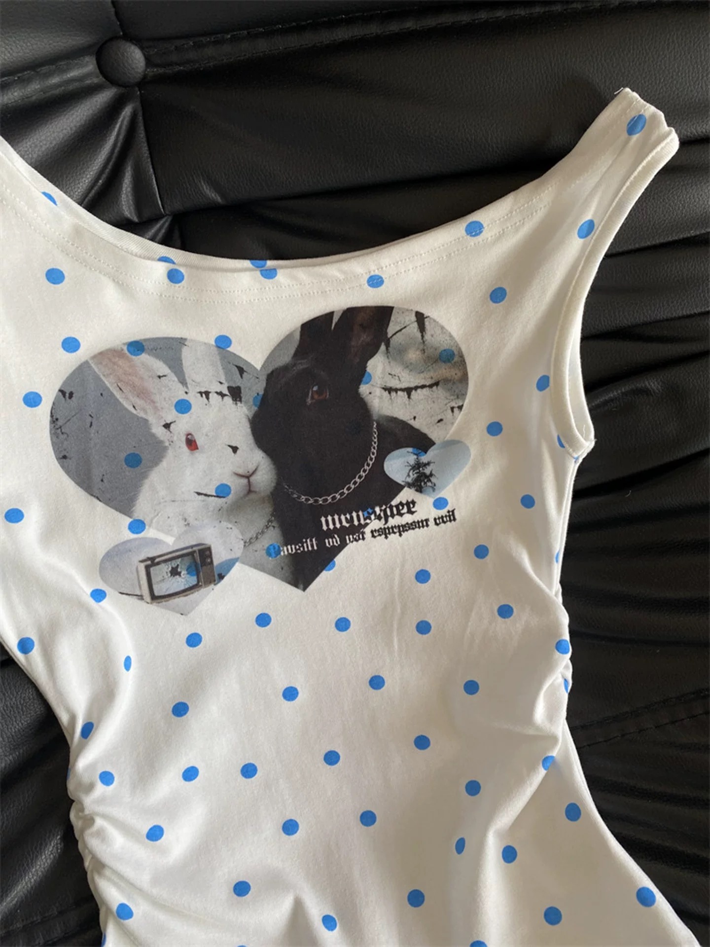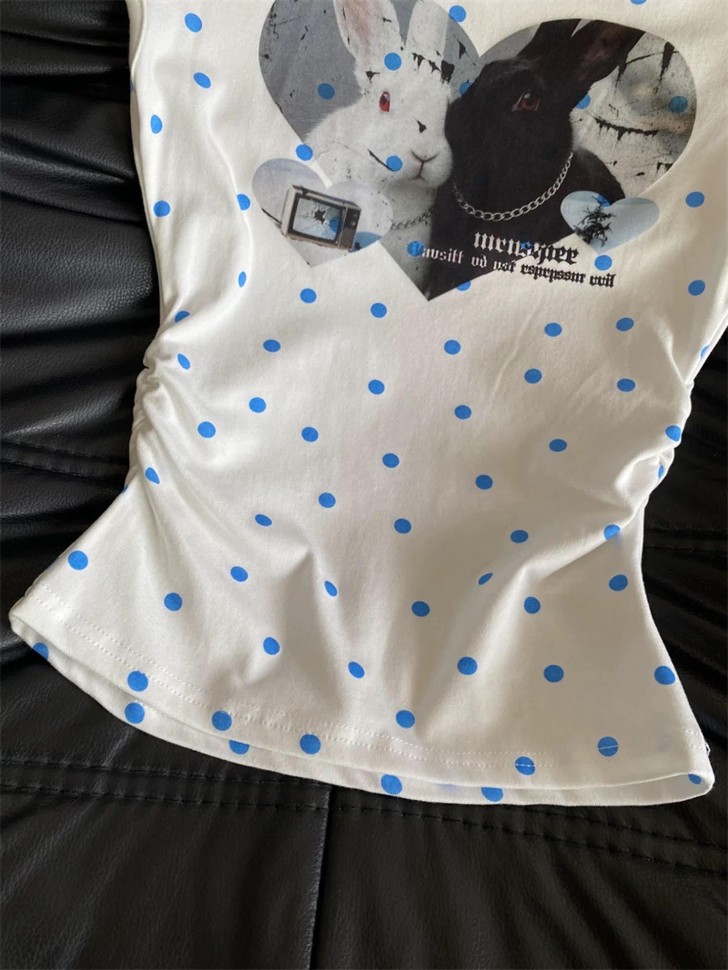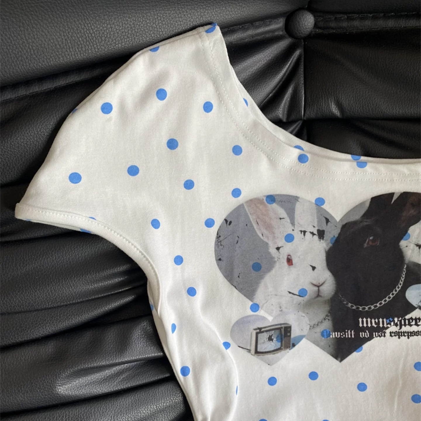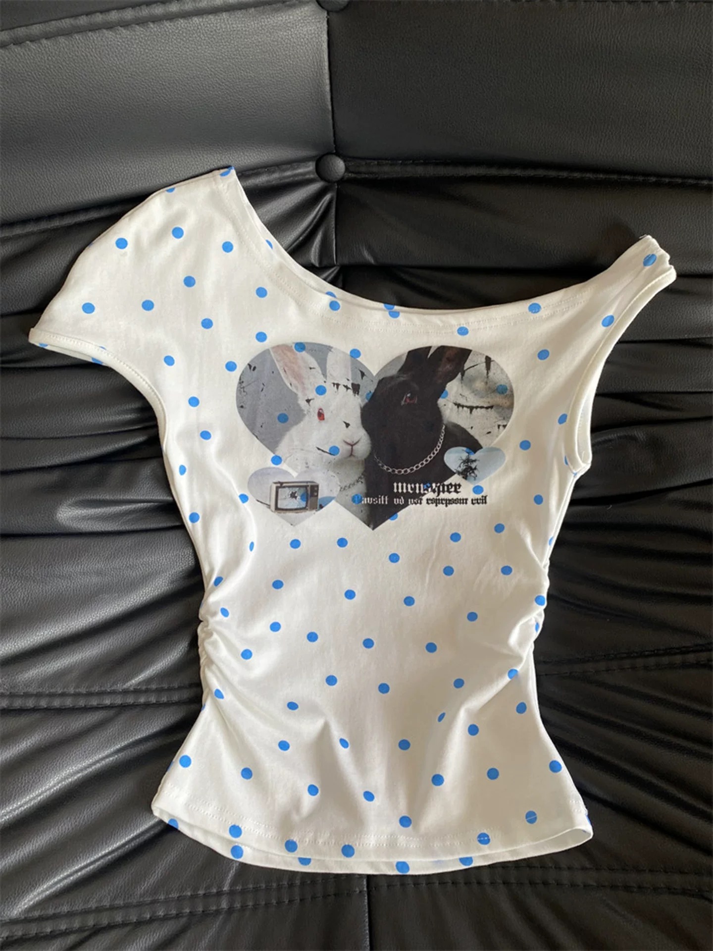 순수한 욕망 핫걸 하트 토끼 전체 인쇄 도트 무늬 비스듬한 어깨 반팔 티셔츠 여성 여름 디자인 센스 몸매 가꾸기 다용도 맨위