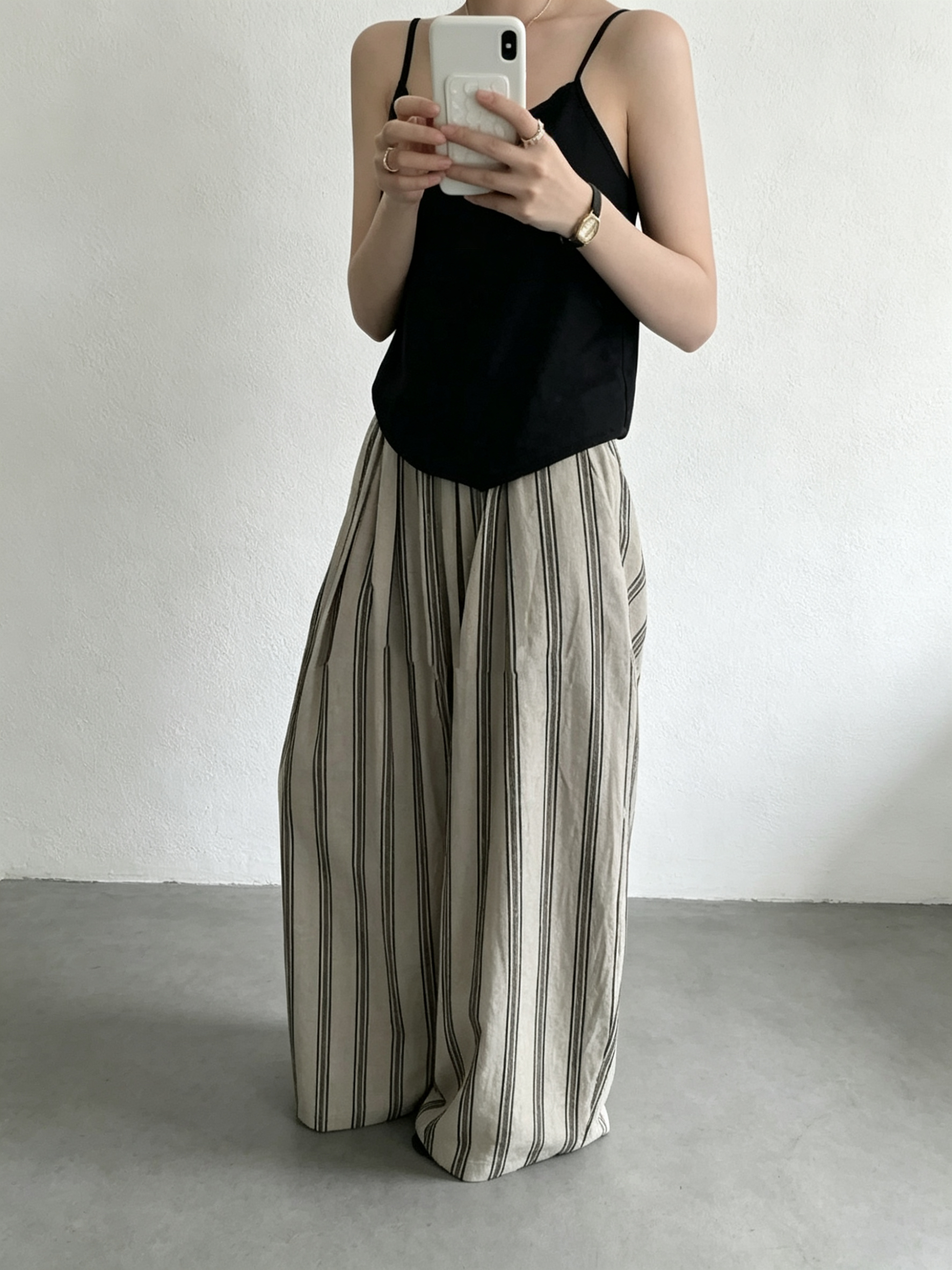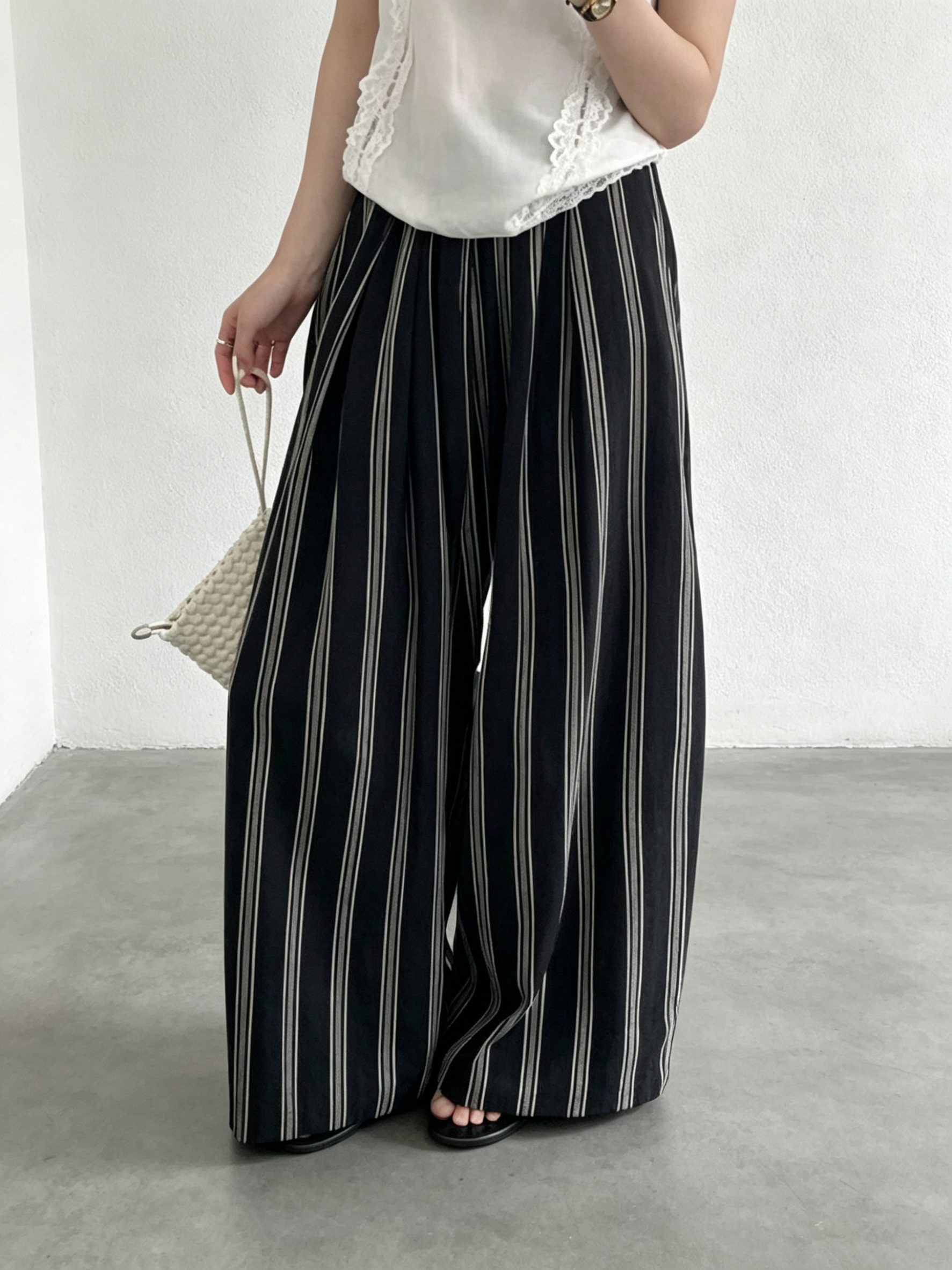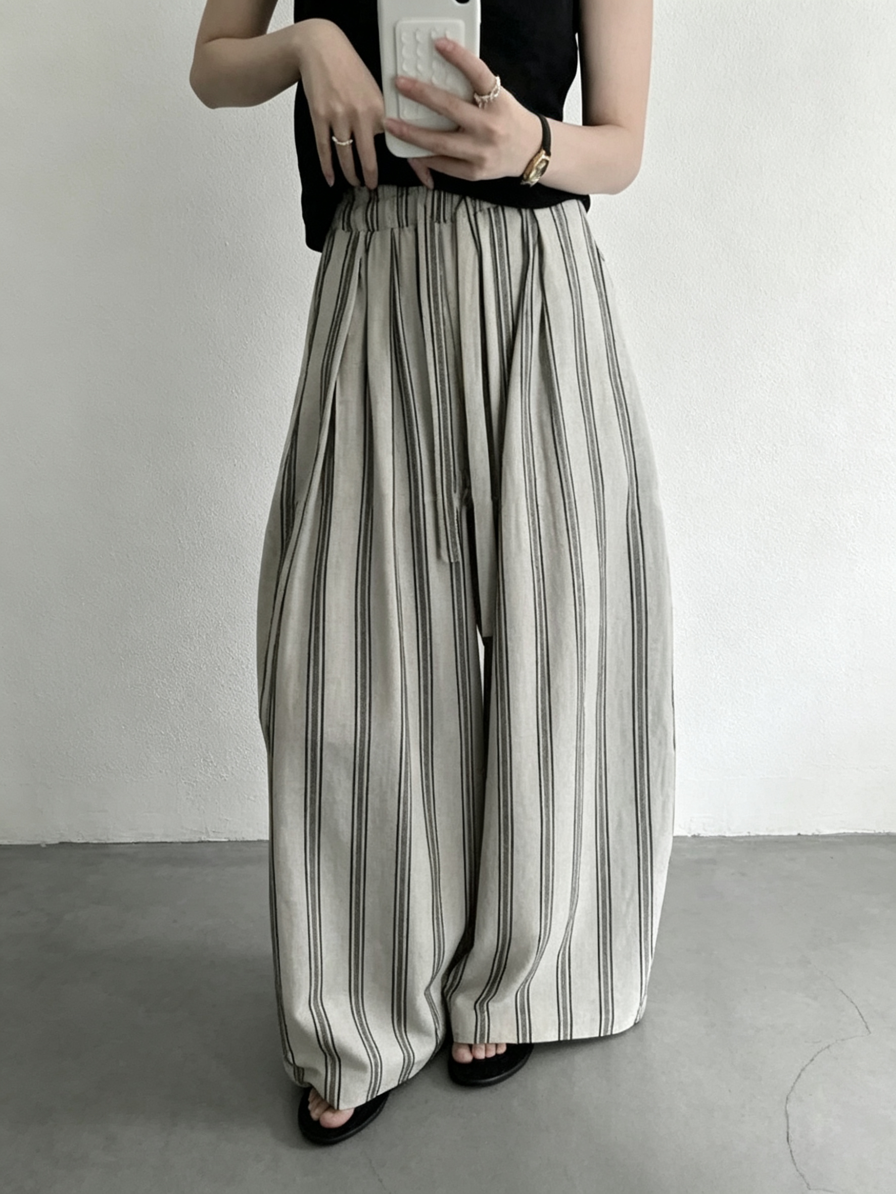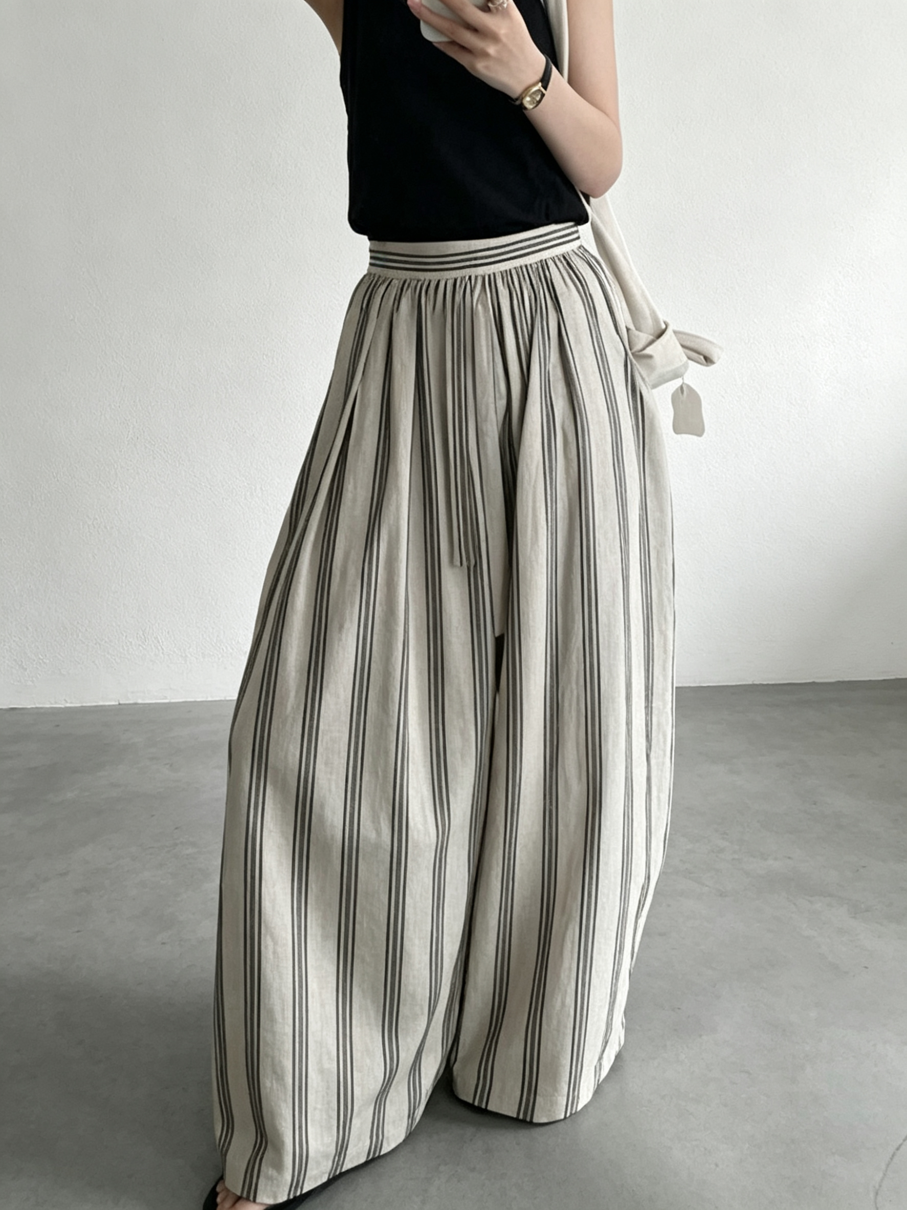 여름 켜기 새로운 미니멀리즘 단색 펌프 로프 하이웨이스트 루즈핏 와이드 레그 팬츠 캐주얼 바지