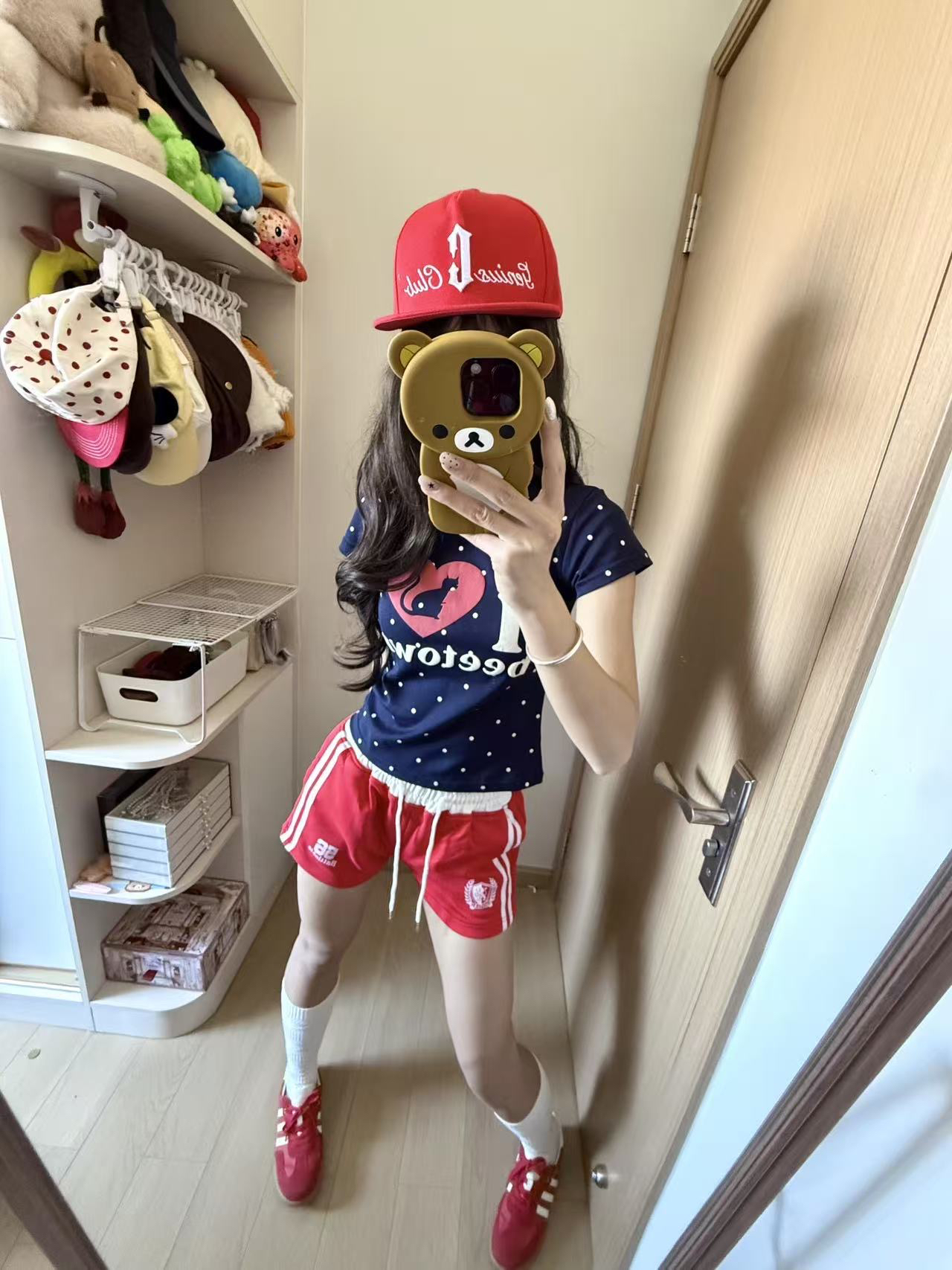 아메리칸 레트로 긍정적 인 어깨 도트 무늬 프린트 반팔 티셔츠
