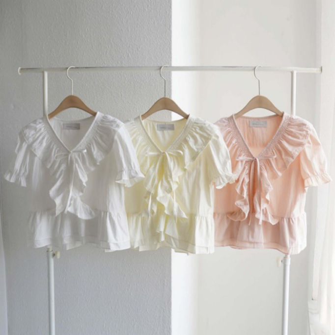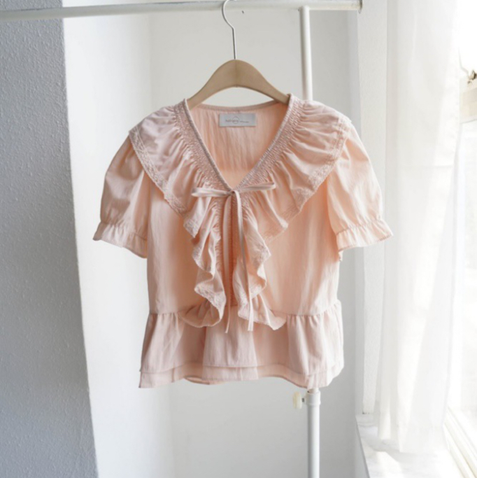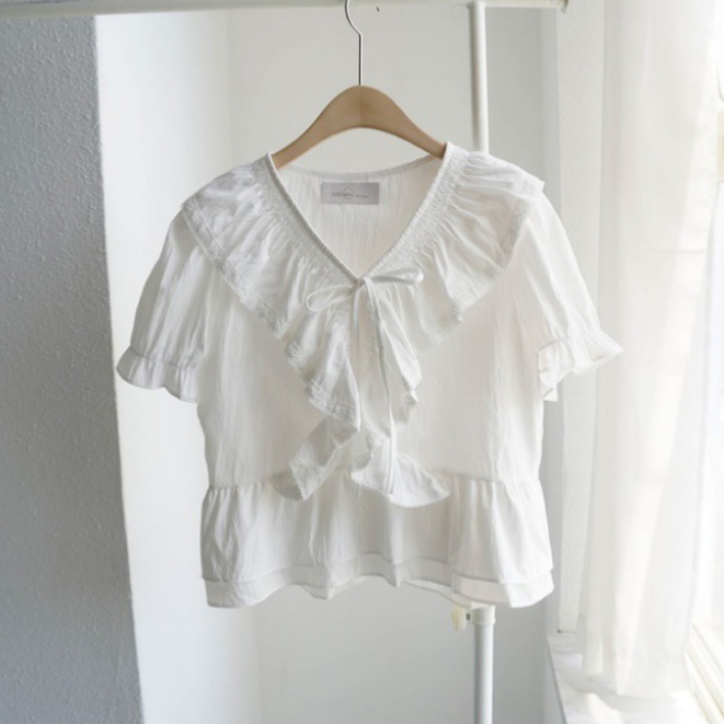 주문 재고 있음 프랑스식 프릴 V넥 반팔 셔츠 여름 새로운 한국 동대문 슈퍼 잘 생긴 쉬폰 톱