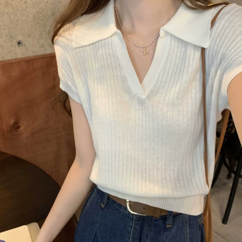 순수한 욕망 POLO 칼라 핫걸 디자인 센스 반팔 맨위 여성 의류 여름 새로운 고유 한 Chic 아름다운 니트 티셔츠