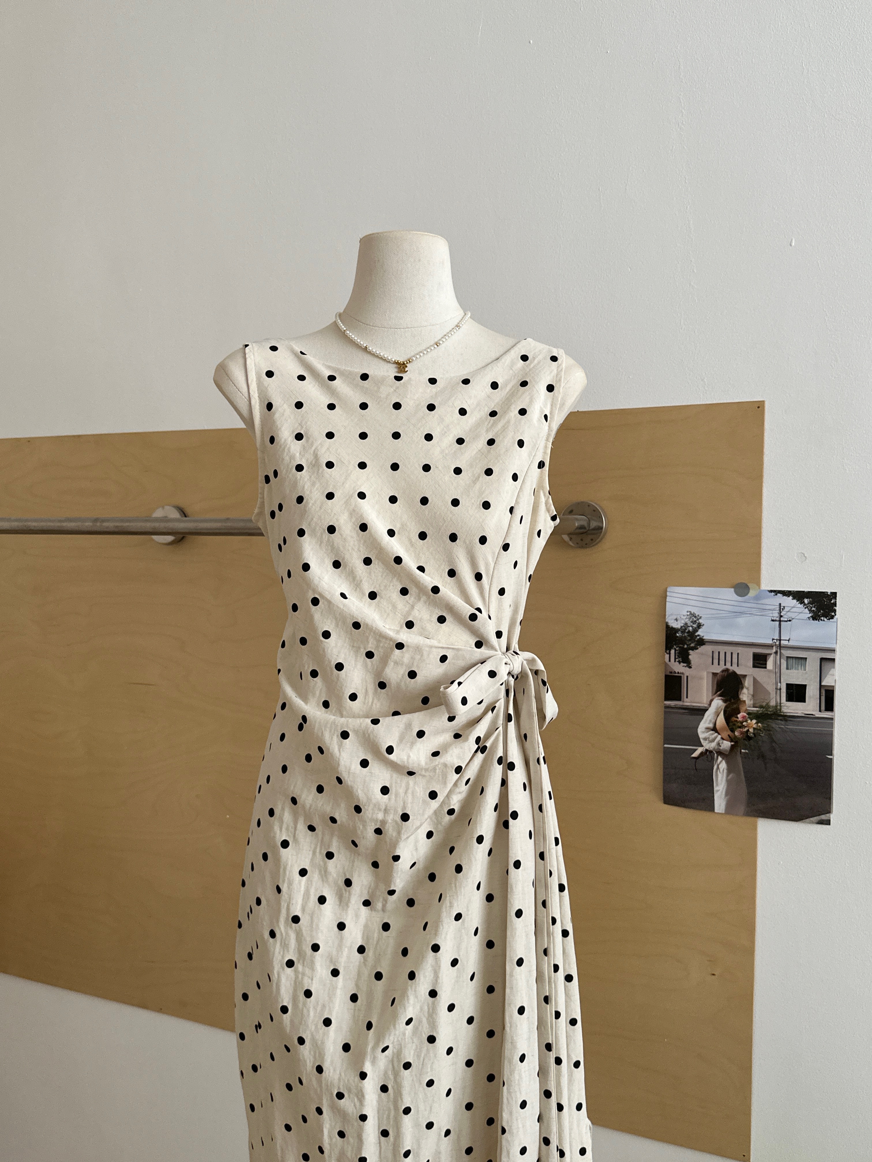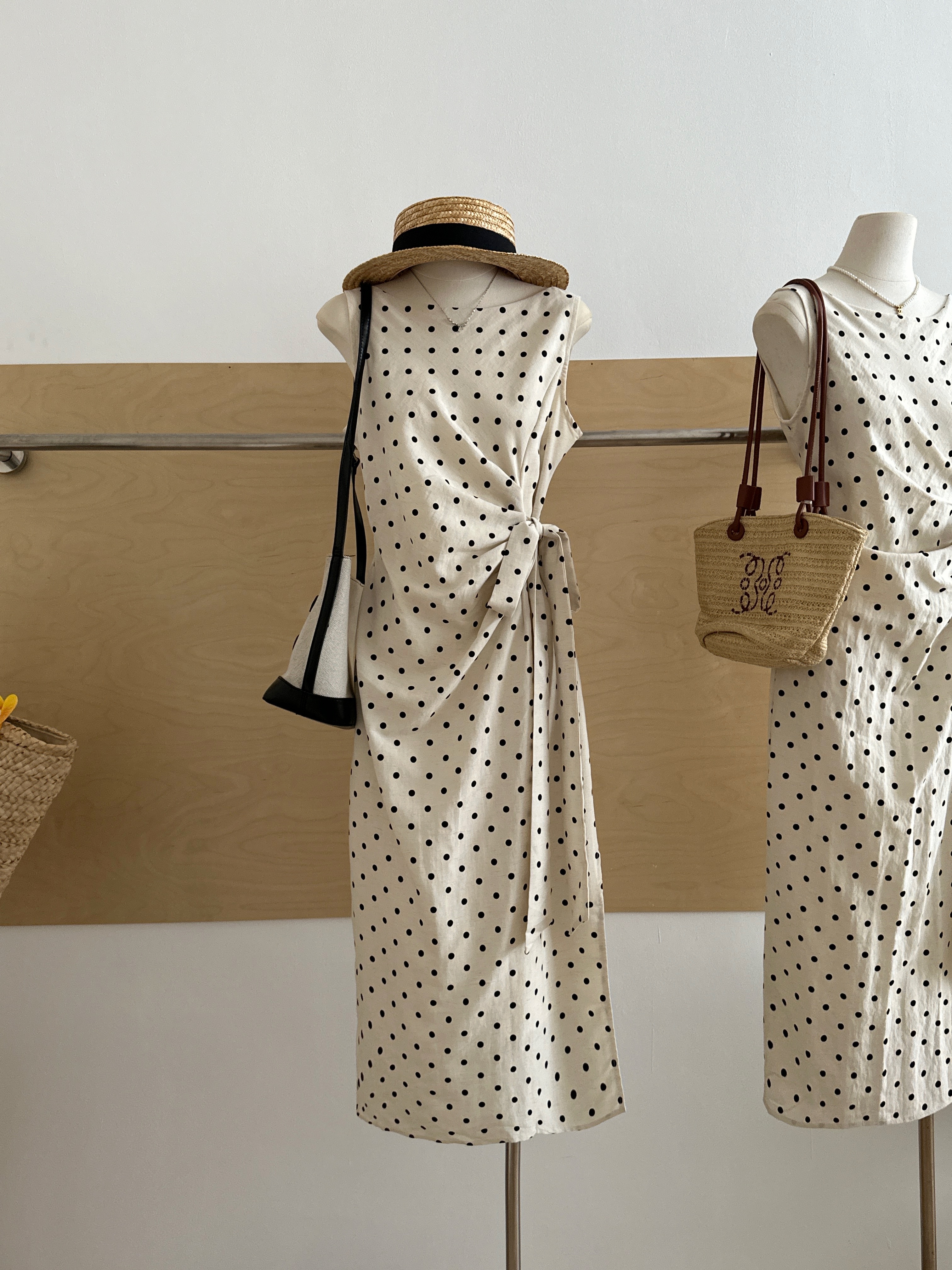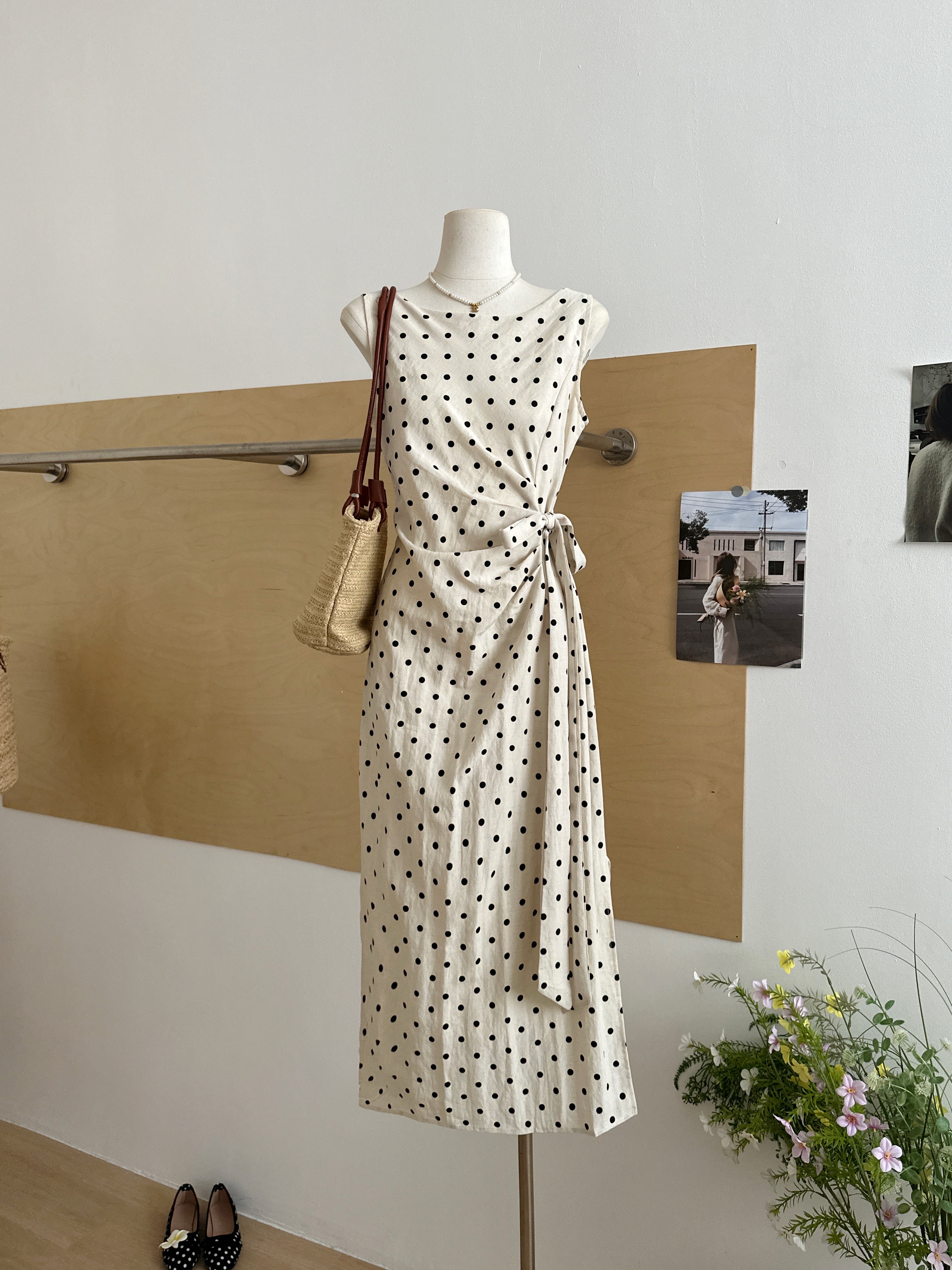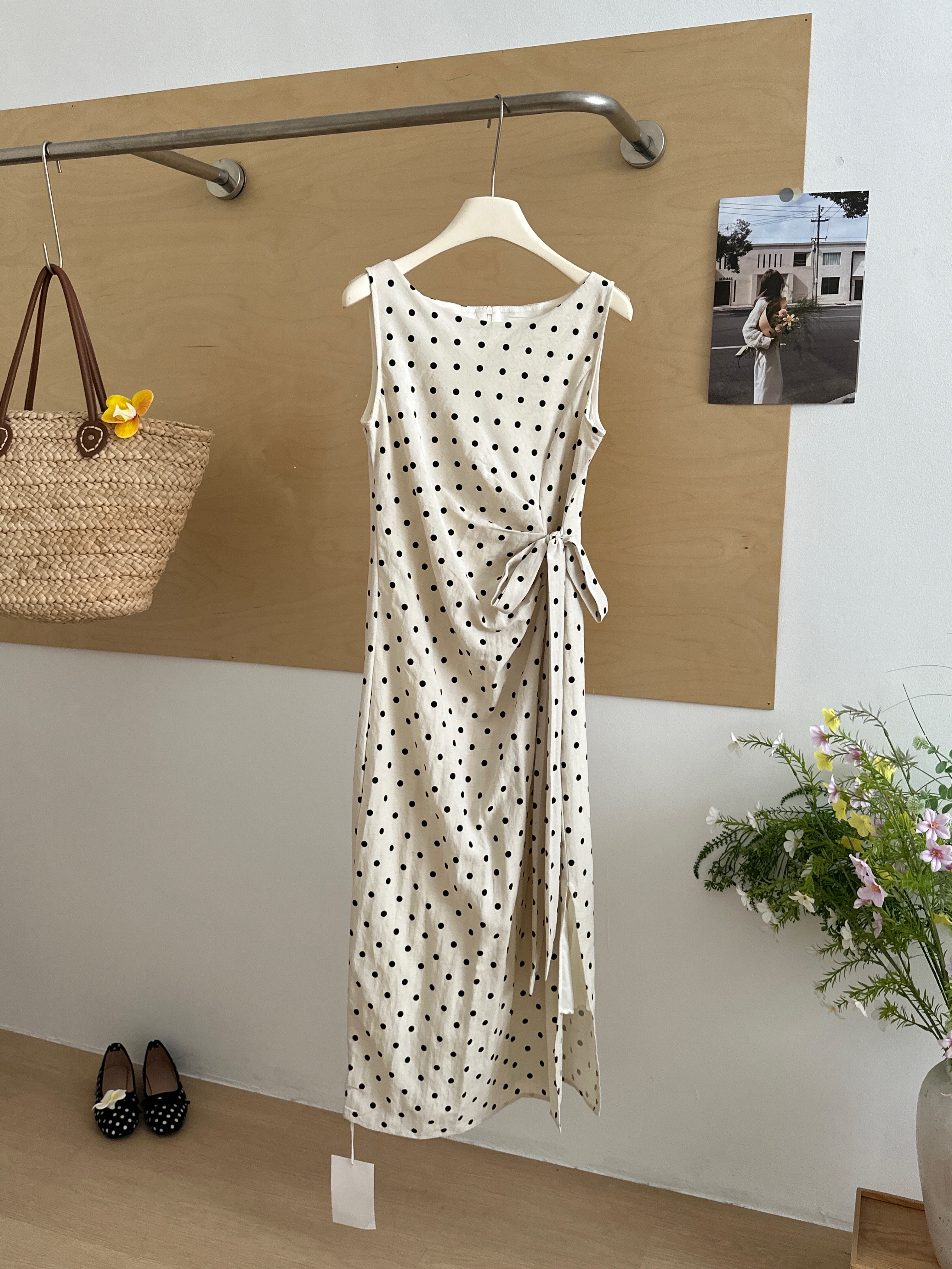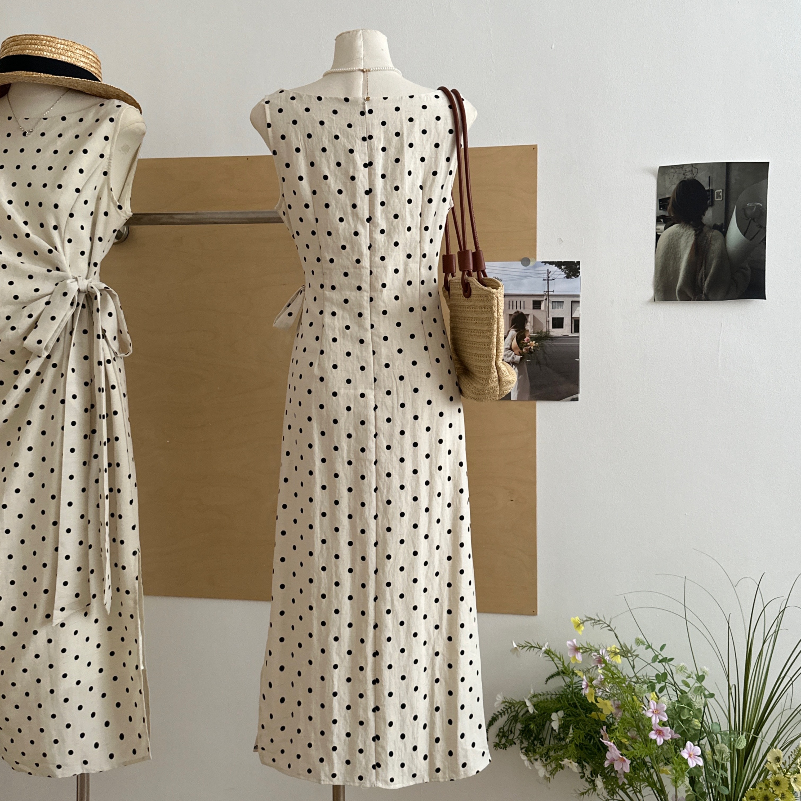 소나무 객실 달 고급 센스 품격 도트 무늬 여성 드레스 측면 허리 수축 리넨 면화 프랑스식 롱 스커트